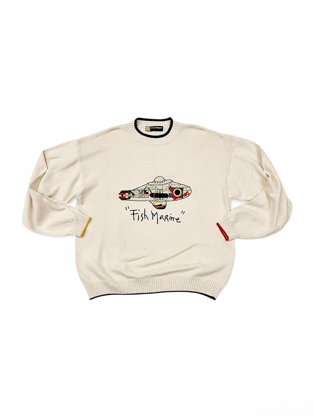 ヒロミチナカノのオールドピース。 ビジネス全振りで展開された量産洋服の出回りが多く、中々クリエイションの本筋に辿り着けないレーベルのひとつですね。 このフーディも、言っちゃえば多分前者です。 いや、どうだろう? なにせ特殊過ぎるんです、立ち位置が。 この服には何故か、「東洋水産」のタグが付いてるんです。 ご存知ですかね、即席麺で有名な食品メーカー。 赤いきつねと緑のたぬき、マルちゃん正麺。 内タグの書式的にmid90's以前の個体だとは思うのですが、何かしらのイレギュラーがあったんでしょうね。 ヒロミチナカノ以外のタグや印字が無いから、何か販促キャンペーンという訳ではなさそう。 食品以外にもアパレルの代理店か何かをやっていた時期があったのかな? 詳細は不明ですが、非常に珍しく出自だと思います。 念のため言及しておくと、服のクオリティやデザインに「東洋水産」感は全くありません。 アクリルメインのテキスタイルは、基本的には一般的なスウェットと同じような組織構造。 しかし裏毛のふわふわ感が段違い。 非常に柔らかく快適な着心地。 そしてデメリットと言えば、吸水性や吸湿性の無さ。 実際のところ本当にそれらが無いかどうかは不明ですが、たまに全然水吸わないタオルあるでしょう?あれと似た感じがします。 僕あれタオルとして向き合って言うなら大嫌いなんですよ。 でも服の生地-特にインナー以外-としては、非常に面白い生地だと思います。 そんなファニーなテキスタイルで組んだフーディ、袖下のシームと身頃のサイドシームを一本に繋いでオーバーロックしてます。 それもわざわざ縫製糸の色を変えてインパクト抜群の赤糸です。 これはシャツの縫製とかでよく使われる縫製仕様です。 「完成した身頃」と「完成した袖」をアームホールの縫合でくっ付けるのではなく、未完成の袖と身頃を縫合して、最後に袖下からサイドシームを一本縫いするやり方。 フーディでは中々珍しいと思います。 そして左脇に異様に大きなサイズのピスネームタグ。 可愛いでしょう。 これ昔のヒロミチナカノのアイコンディテールです。 このレーベルの面白い個体は結構このタグデザインで遊んでるものが多いですね。 フード裏面からチラリ覗く身返しの赤も良い具合に効いています。 柔らかいけれどウィットに富んだユニークな一着です。 フーディでこういう変化球探すの、本当に大変。 肩肘張らず、適当っぽい合わせでラフにお楽しみください。 Made in - (JP?) サイズ表記M 肩幅:53 身幅:53 着丈:67 袖丈:58 裄丈:84