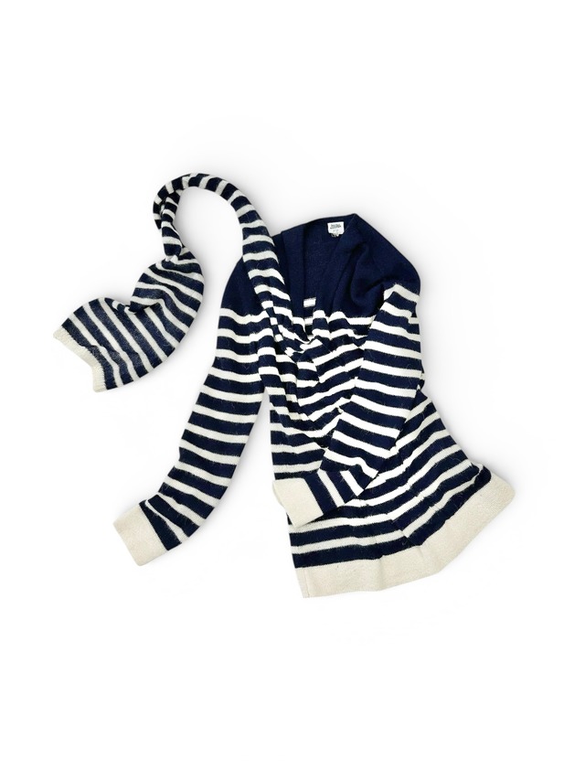 「Gaultierと言えば」で思い浮かぶものが沢山あります。 すごい事ですよね。 どれかに絞れないほど其々が薄い、という訳ではなく、どれもが並のレーベルなら充分にアイコンたり得るレベルであり、それが幾つもあるのです……。 そのうちの一つとして挙げて異論は無いでしょう。 マリンボーダーです。 モードの世界で誰が一番ボーダーを使ったか、語らずともご存知のことと思います。 海を象徴するバスクシャツの柄は、GAULTIER氏のファッションの原点。 このセーターでは、フランス西岸のビスケー湾ともう一つ、英国の海洋文化もデザインエッセンスとして取り入れられていますね。 フロントに入ったケーブル模様、これはアイルランド西側アラン諸島に端を発します。 漁師が着るためのフィッシャーマンニット、そこに豊漁や安全の祈願と個人判別のための独自の網柄をあしらう尊き文化。 海を象徴するこのデザインをインスピレーションに、ではその「縄」模様を更に拡張解釈してみよう、と実際に洋服という平面から拡張させたデザイン。 とても複雑な編み方(大雑把でごめんなさいね)によって、フロントのケーブル模様から実際にケーブルが生えています。 ちょうど首に一巻き、ゆるっとストールとして使える程度。 外の文化を引用してるのに、着地点は滅茶苦茶フレンチ・シック。 発想はアヴァンギャルドなのに工程は至極ロジカルであり、着地点はあくまで日常の延長線上にある。 デザインが巧過ぎるんじゃなかろうか。 素材は意外なチョイス、アルパカ100%です。 軽くて弾力があって、カシミヤとは別軸でウットリしちゃう手触り。 これは首に巻きたくもなる……。 Made in CHINA サイズ表記40 肩幅:39 身幅:42 着丈:68 袖丈:63 伸縮性あり