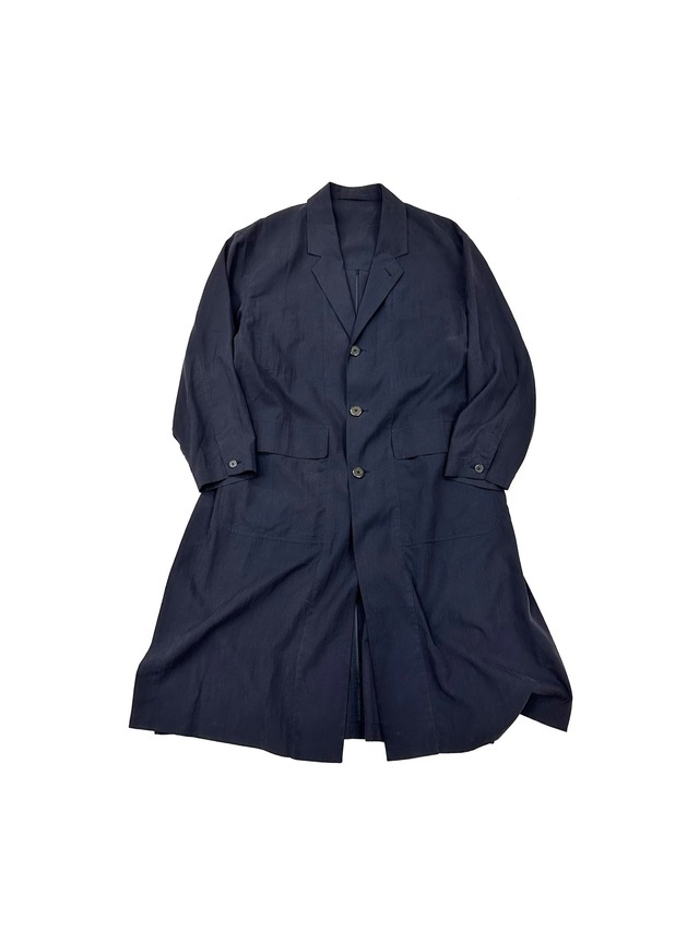 滅茶苦茶に大きな女性用コート。 BerettaやIsseyのそれとはニュアンスの違う、エスニシティとアーバニティの融和を感じます。 他人の作風で例えるのちょっと下品だけど、Miucciaとか、Gigliの作る世界観なんかが近いのかな。 深く打ち合わせたダブルブレストと、べらぼうに広い身幅。 既に広いその身幅から更にフレアを掛けて広げるAラインシルエット。 テント・シルエットなんて比喩も頭を過りましたが、なんかニュアンスが違うんだよなぁ。 その要因はテキスタイルの雰囲気だと思います。 この服の第一印象を決定付けている鮮やかなピクルス・グリーン。 織り成すのは、軽くて柔らかな薄手のピーチスキン。 この仄かな光沢と起毛感、そしてそれを特大分量で靡かせるデザイン、ここらへんの質感がとってもe90'sを正確に描写してる。 オリエンタルなカラーパレットで組まれた裏地を堂々と見せつけるような、深めのサイドベント・カットも相性バッチリですね。 正体はとっても良い時代のダブルネーム。 実際のところは、バーニーズが注文したアレグリ、みたいな感じでしょうか。 メトロポリス立脚ならではのアンテナ感度と、それをリアル・スタイルに落とし込むバランス感覚は流石バーニーズです。 そして、服の裏側を見れば見るほどクオリティの素晴らしさに驚かされる感覚は、流石オリジナルのアレグリ。 アレグリの服は本当に見てて楽しいんですよ。 カッティングとかディテールアイデアとか、余程の服好きにしか刺さらないであろうカッコ良い(採算度外視の)凝り方をしてくれてる。 Made in ITALY (Dismi92) サイズ表記38 肩幅:70(46) 身幅:83 着丈:123 袖丈:48 裄丈:84 シーズン特定はまだ難航中。 でも伝わる人には伝わるはず。 左袖を中心に色焼けあり。 生地本来の微光沢を固定したような面白いフェード。