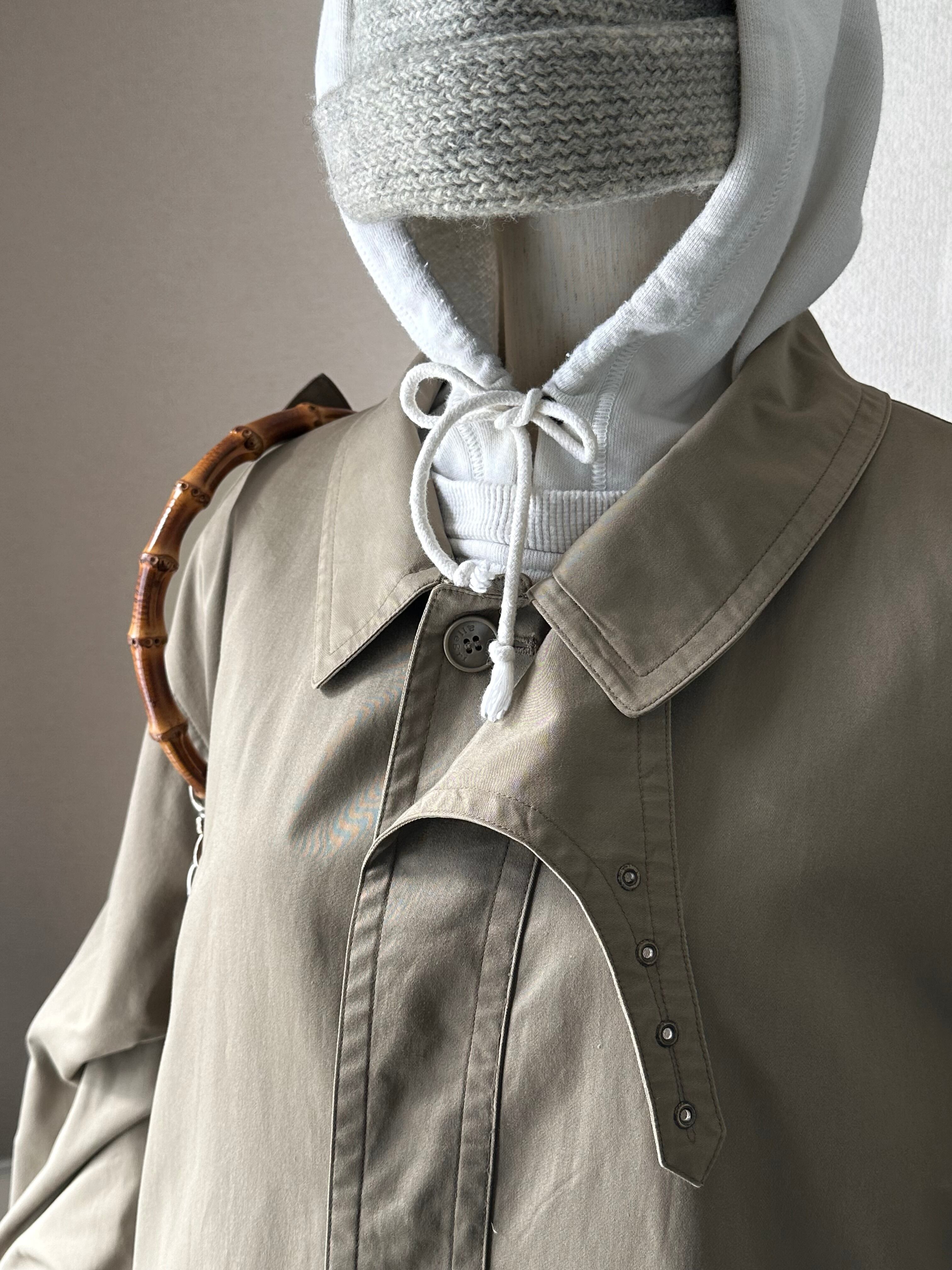 これは言ってしまえば、コートの前立てからY字のフラップを伸ばしてデコルテのレイヤード感とマスク感を仄めかすデザイン。
