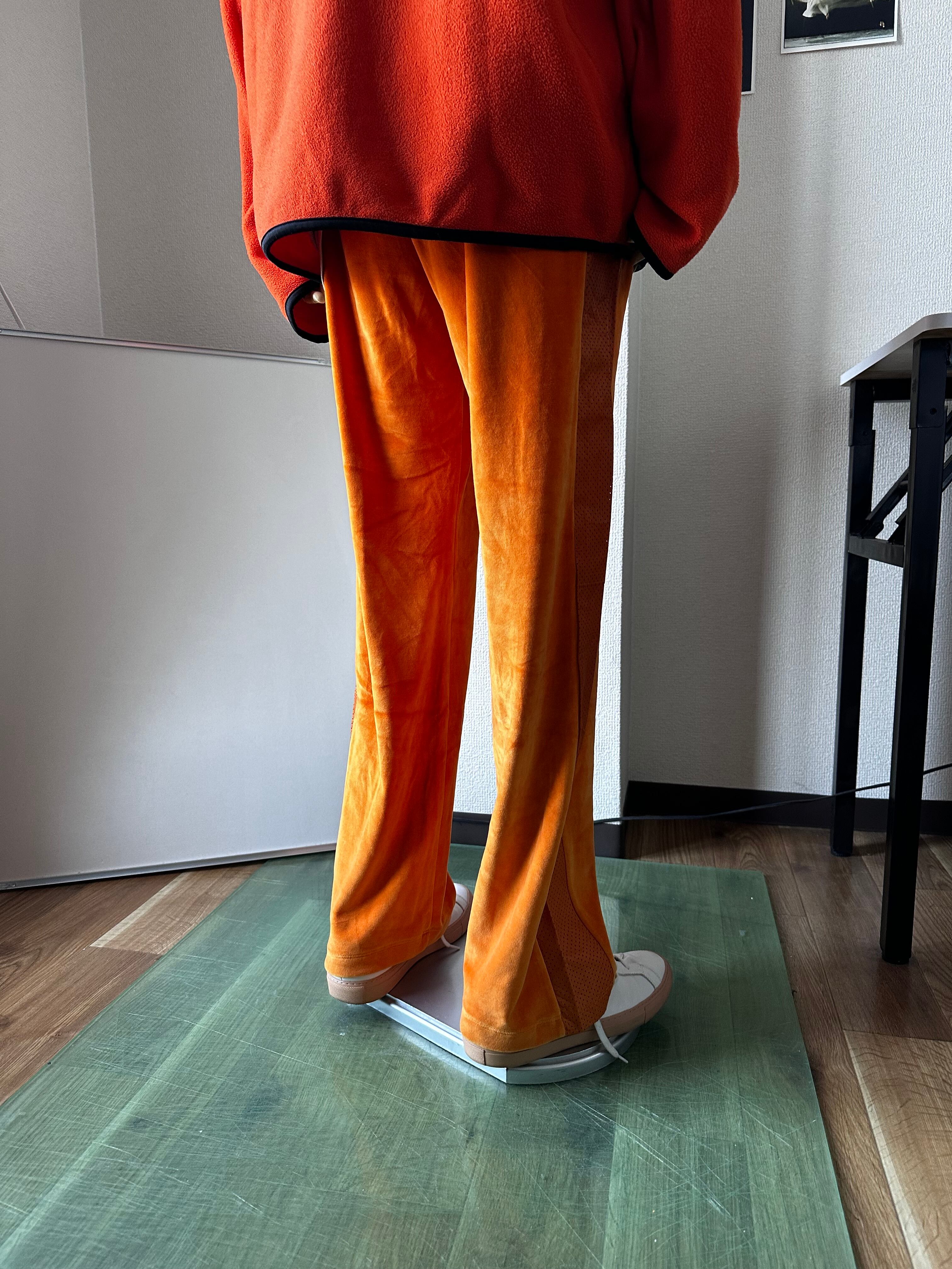マンダリンオレンジのベロアで仕立てられた綺麗なシルエットのトラックパンツ。