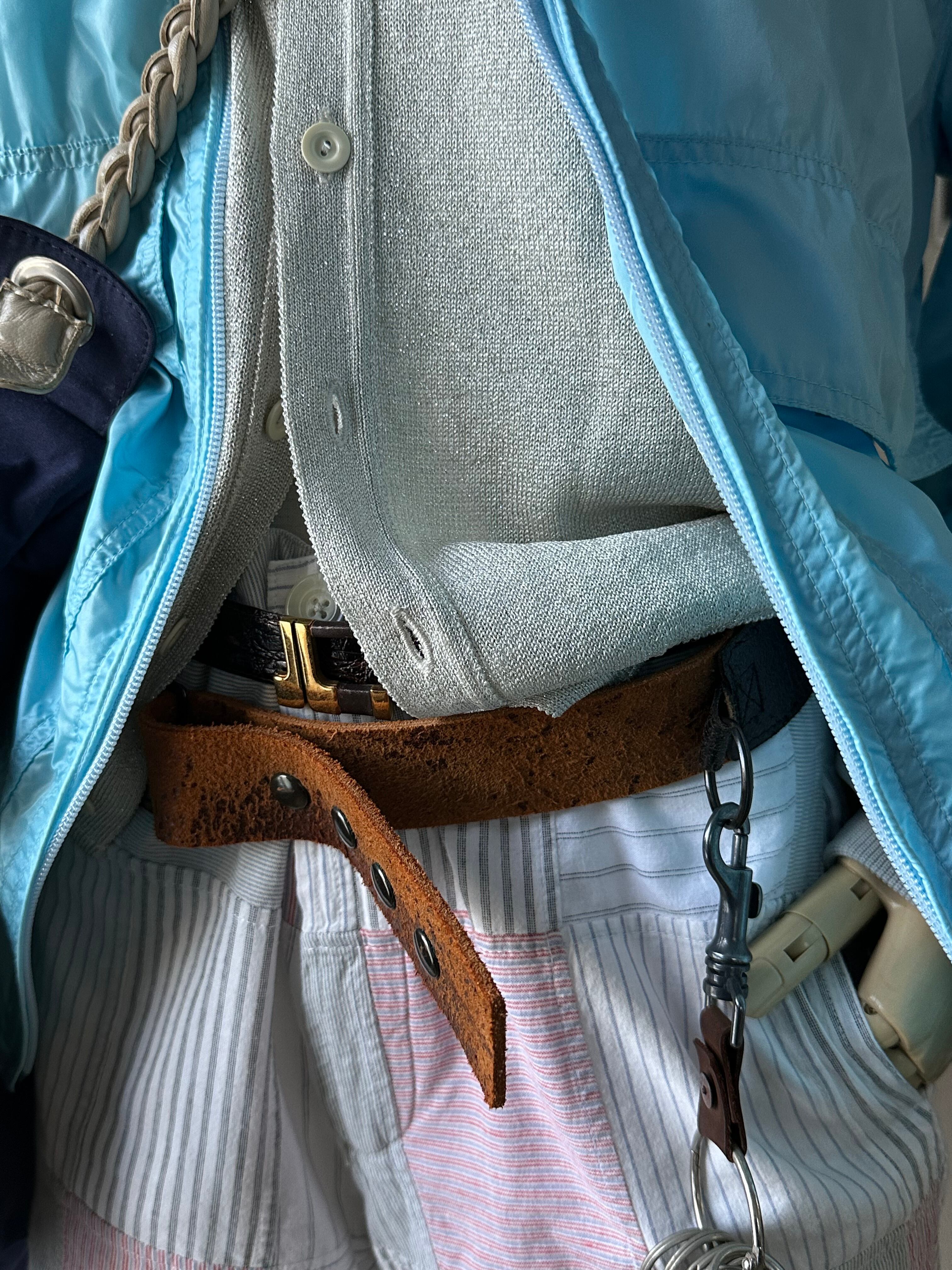 まあアクセサリー感覚でトップスの上からウエストマークに使ったり、既に付けてるベルトにレイヤードしたり、楽しけりゃ何でも良いでしょうって気持ちも結構あります。
