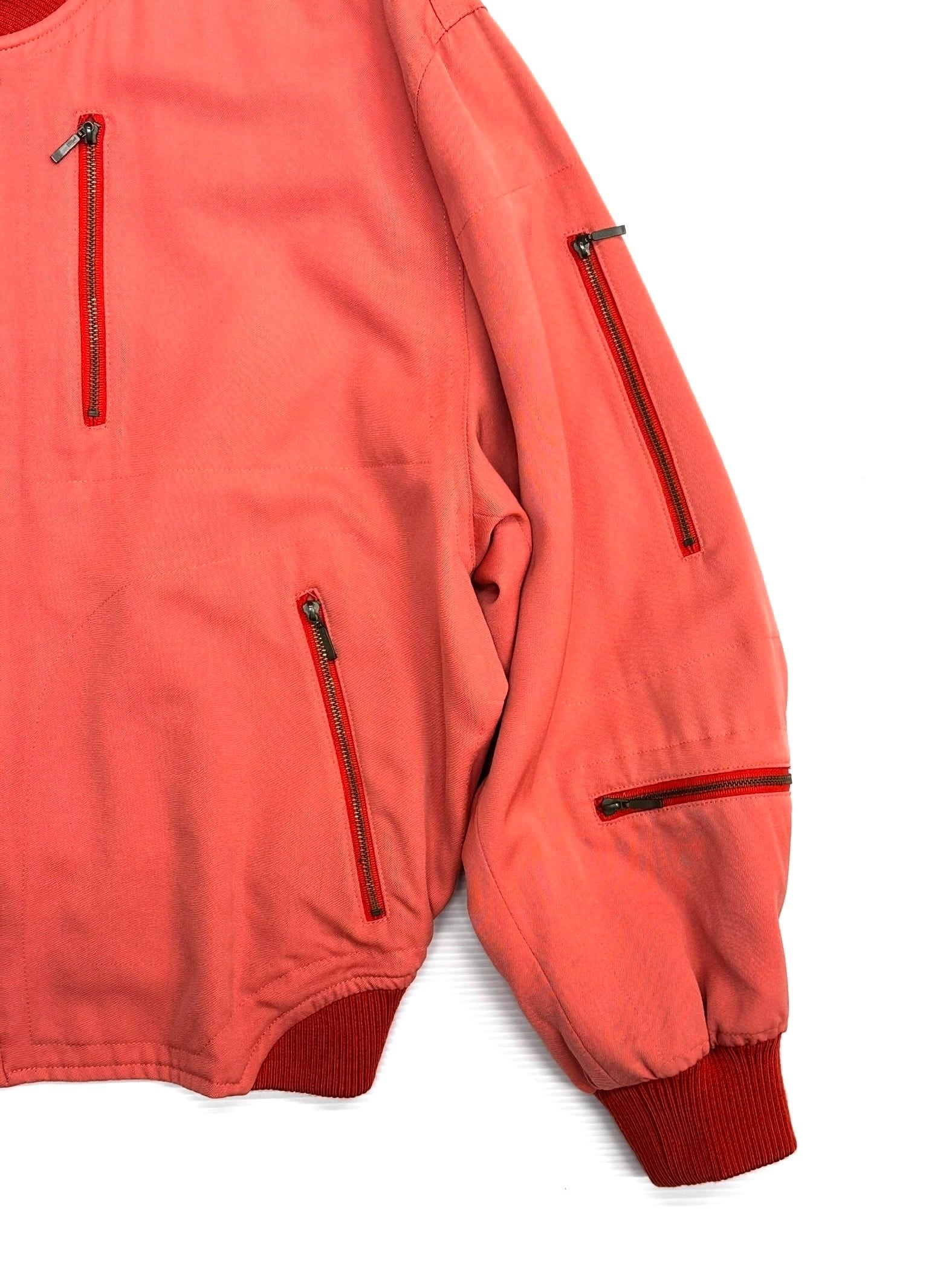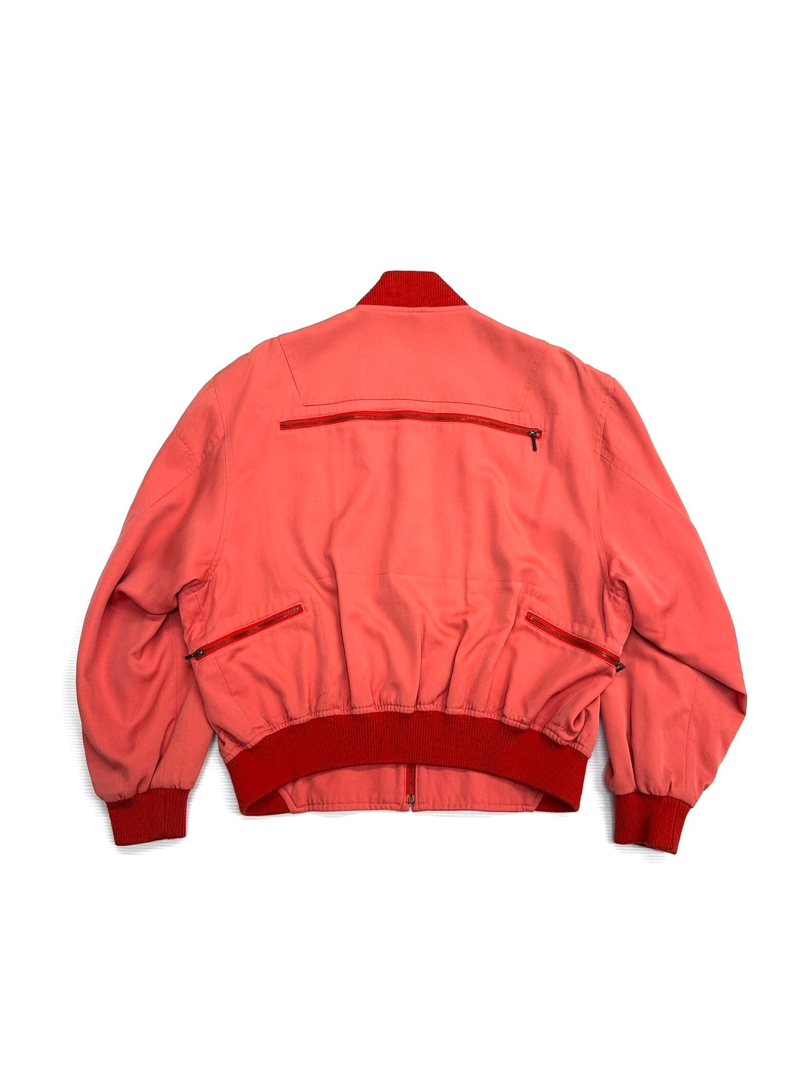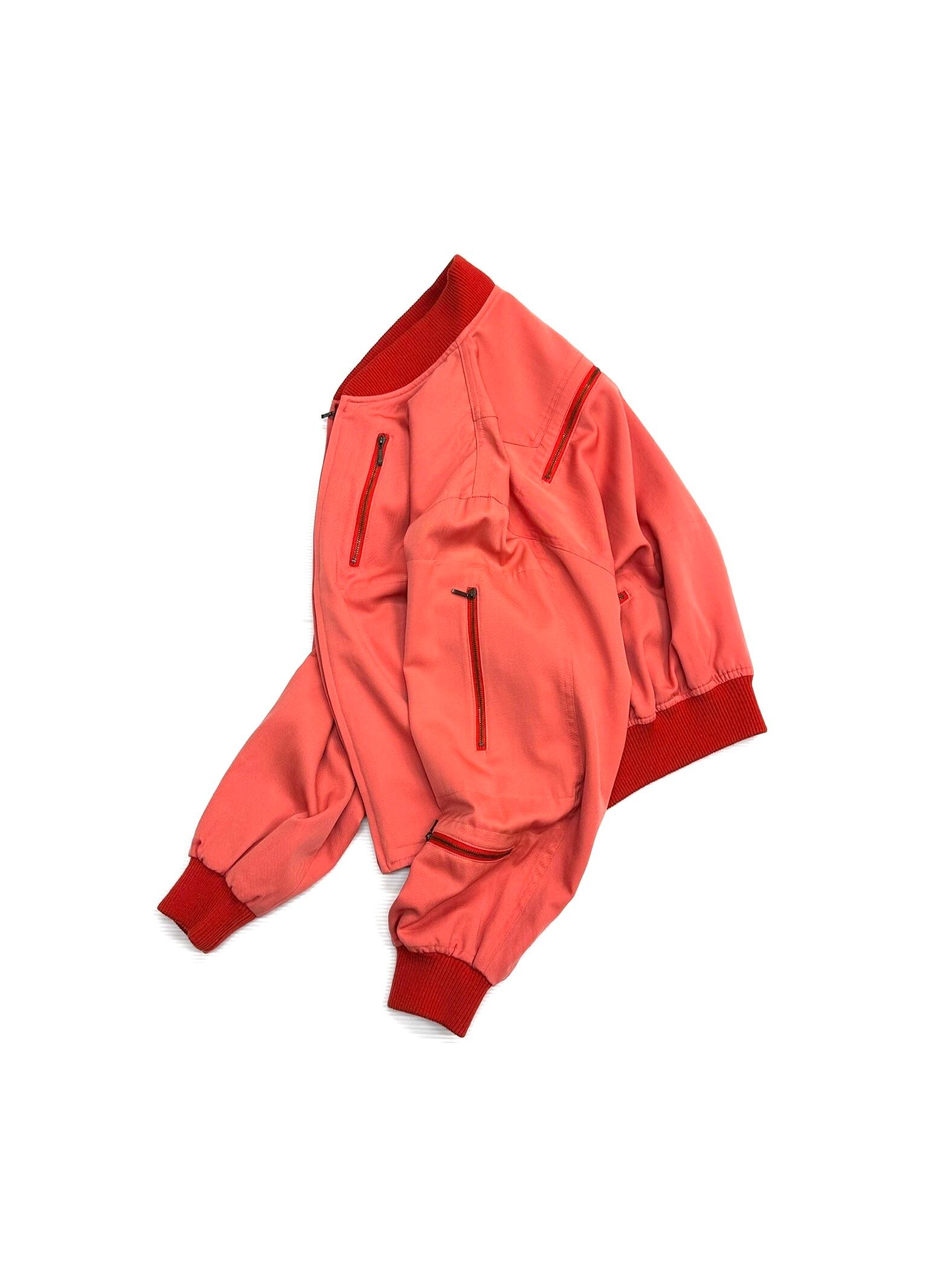 淡いコーラルピンクのウールギャバジンで仕立てられたボマージャケット。