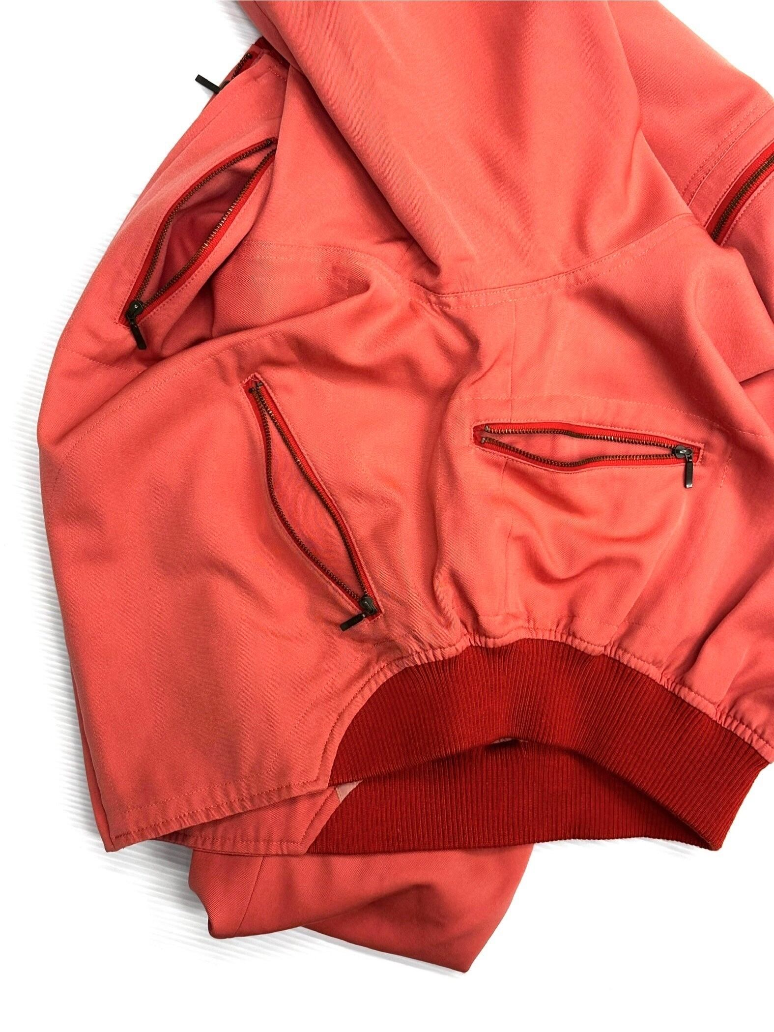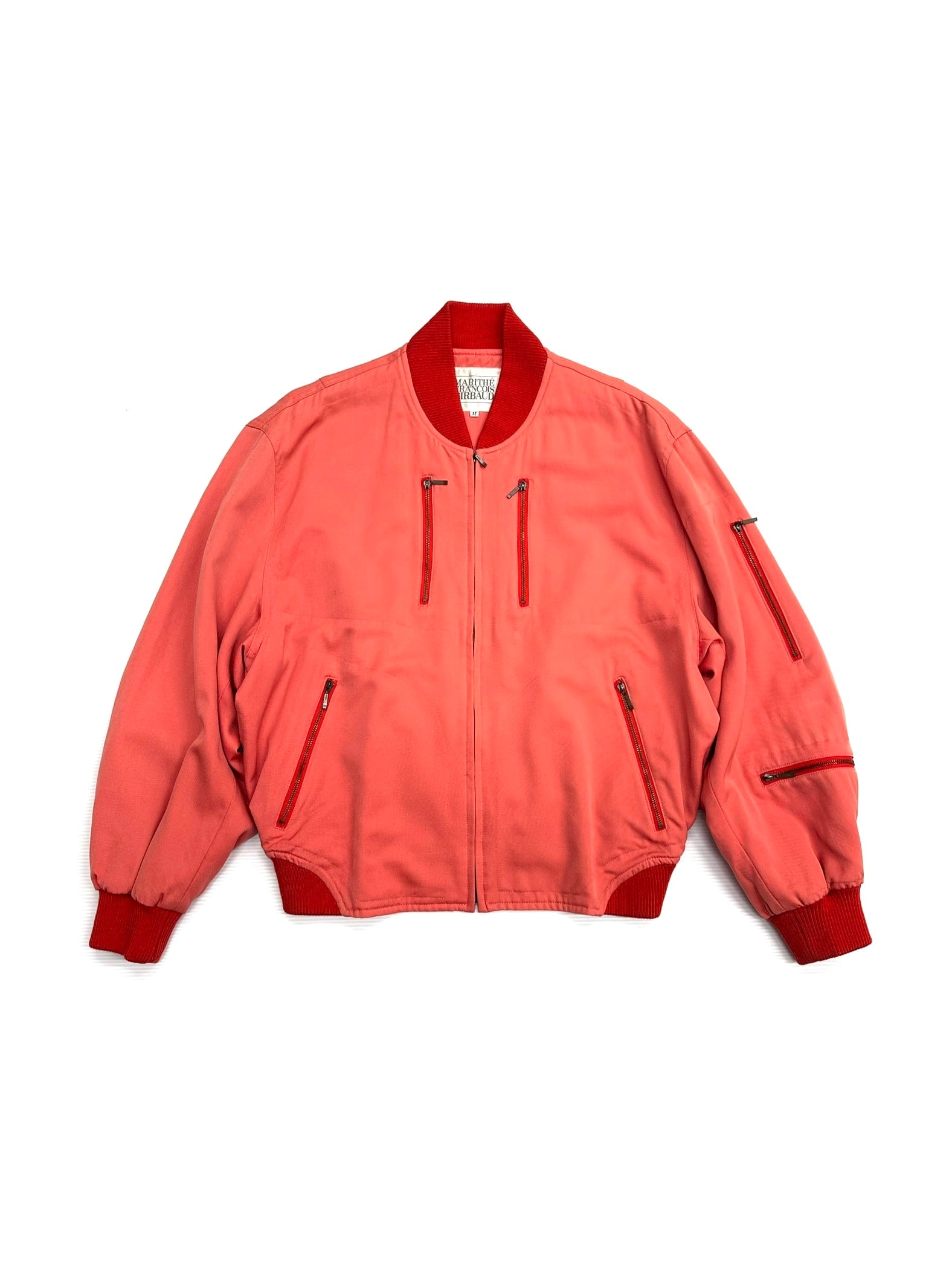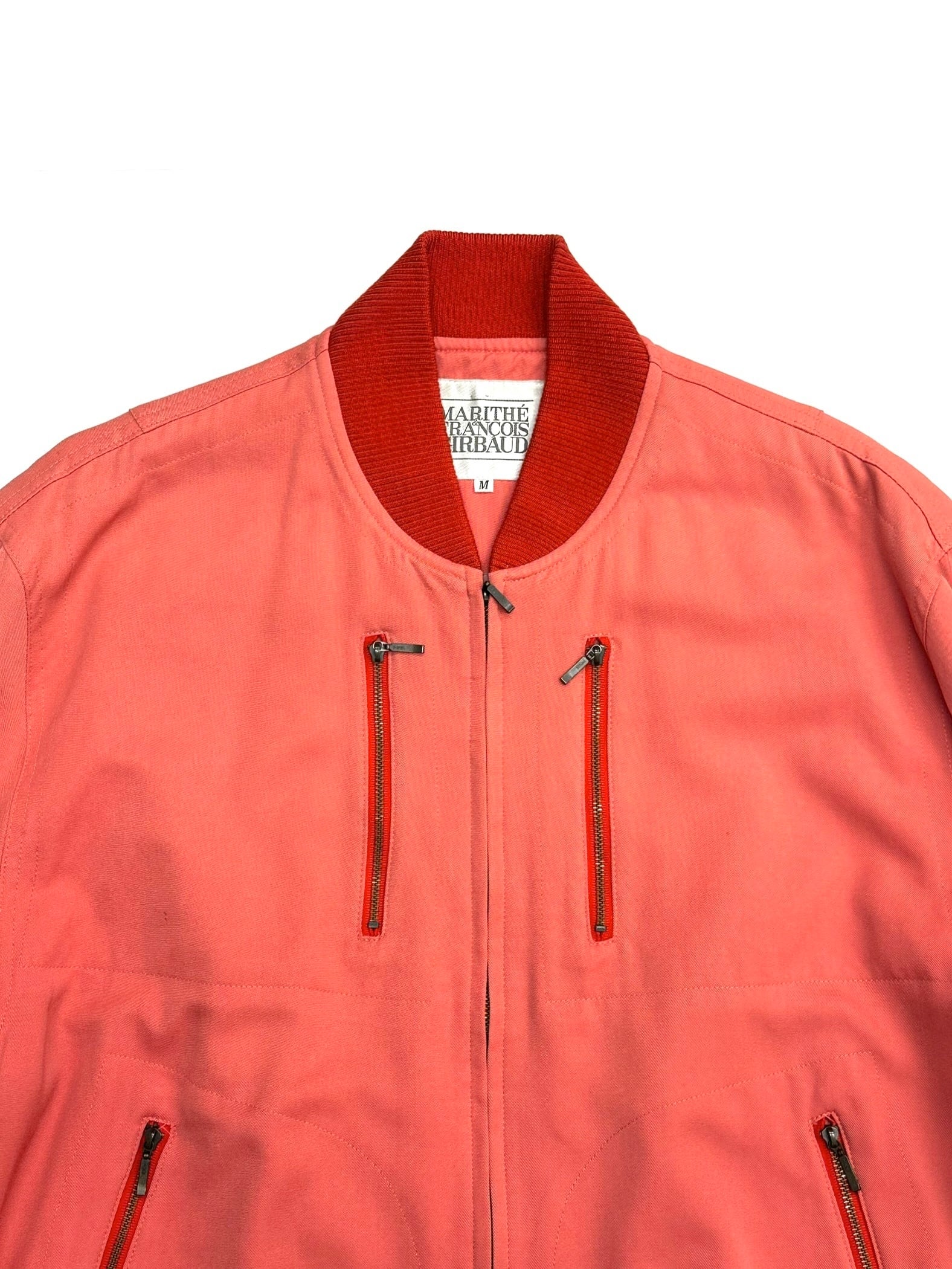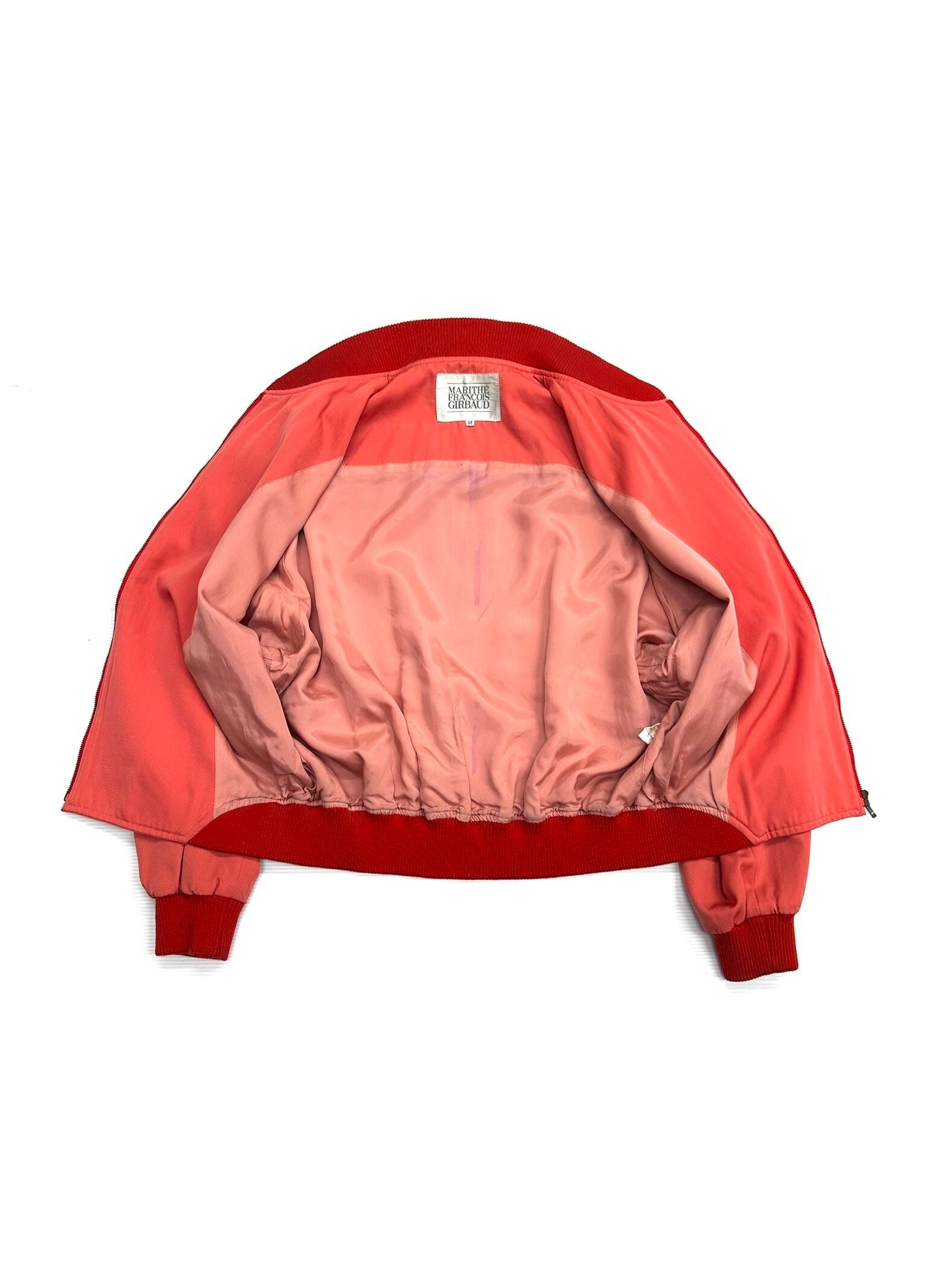 淡いコーラルピンクのウールギャバジンで仕立てられたボマージャケット。