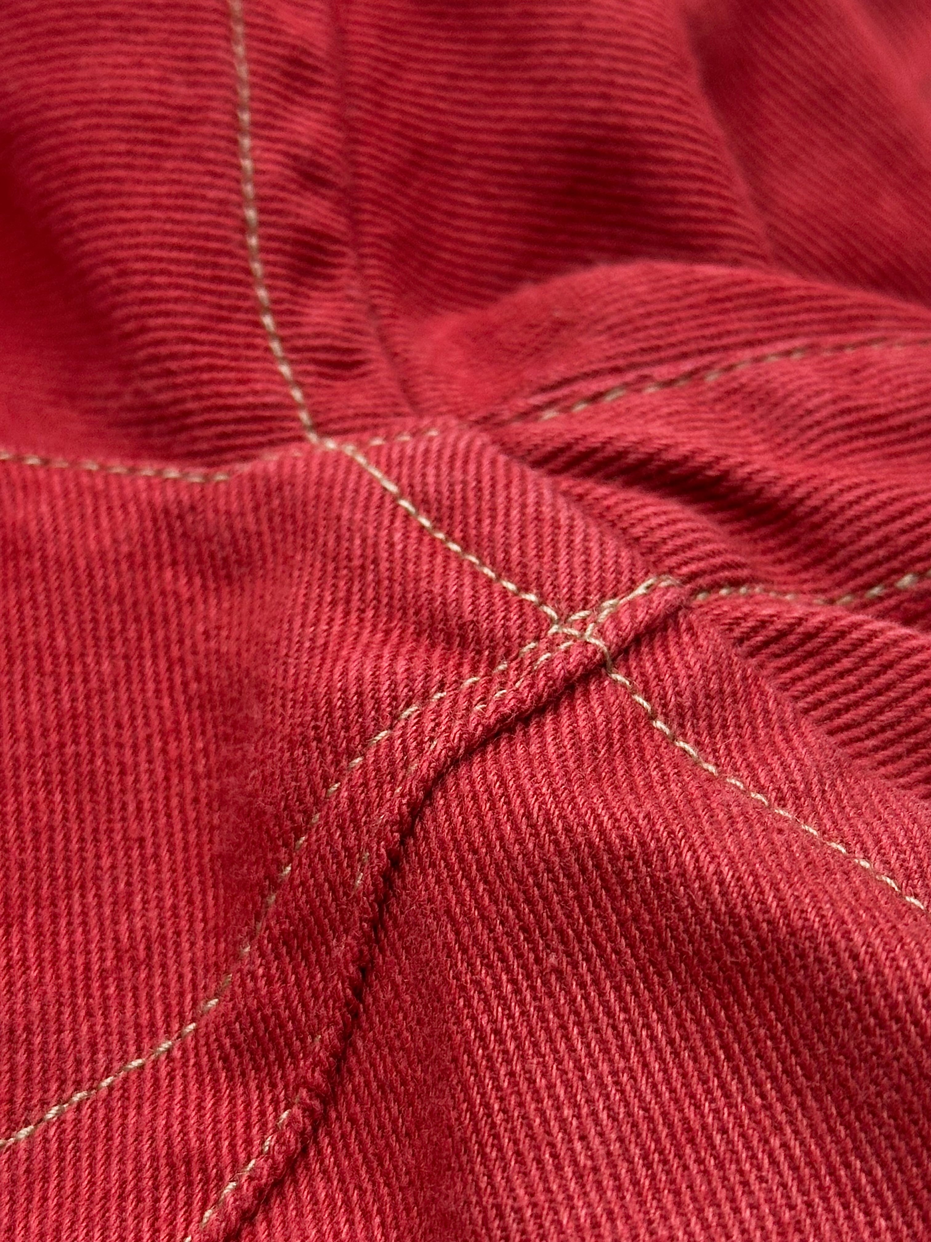 ガーメントダイにて綺麗に染められた左綾のコットンドリルに走る糸は、なんとホワイトではなくミントグリーン。