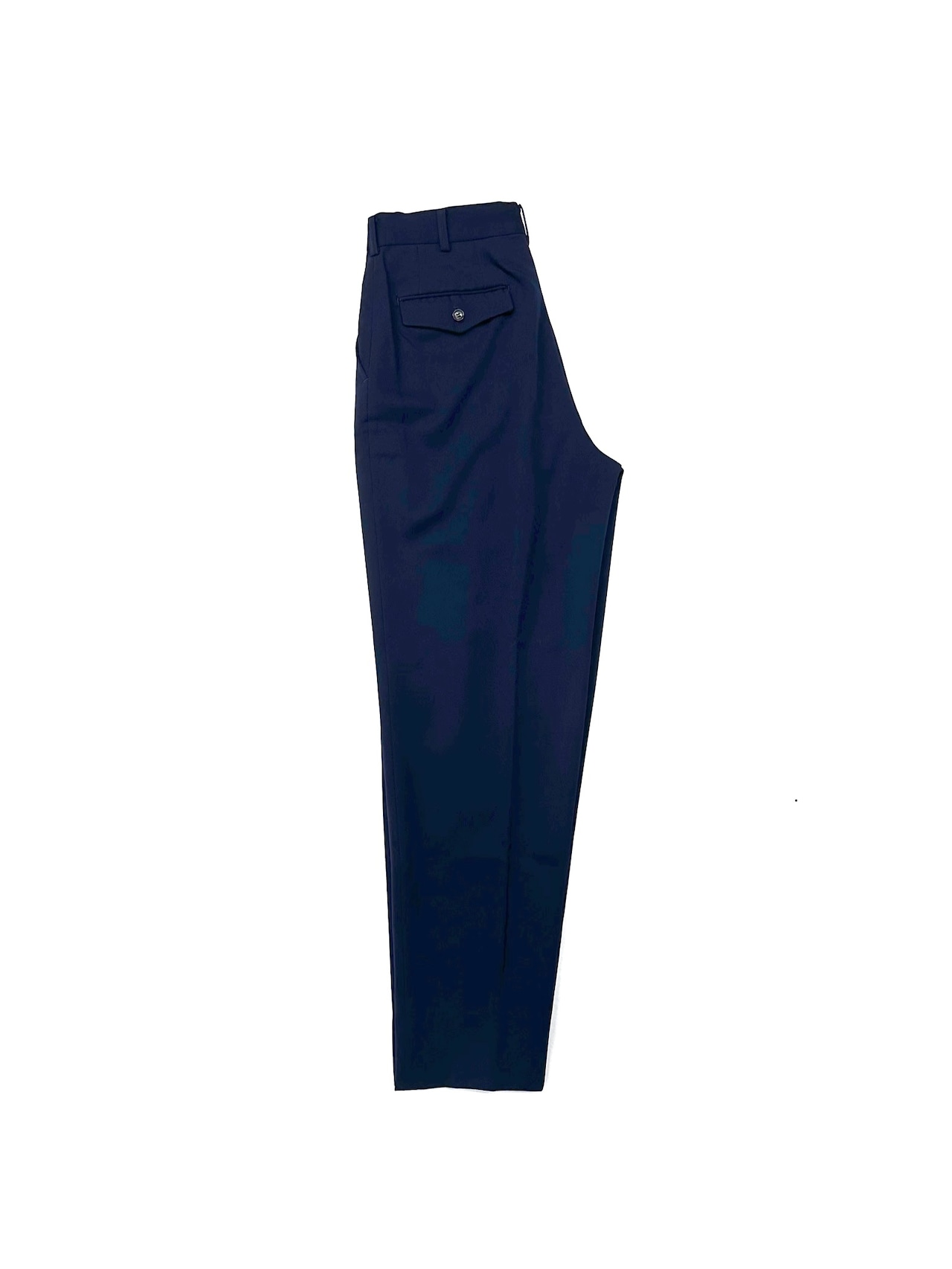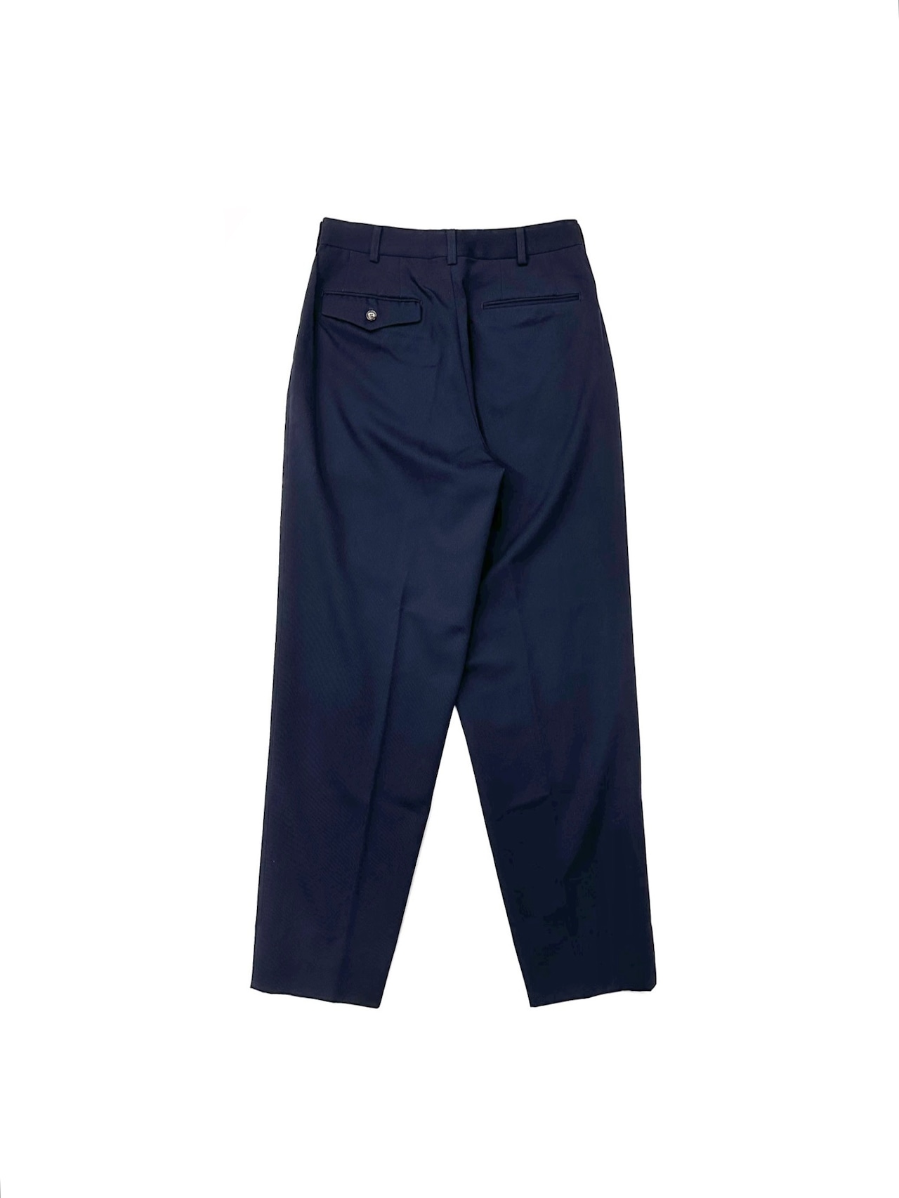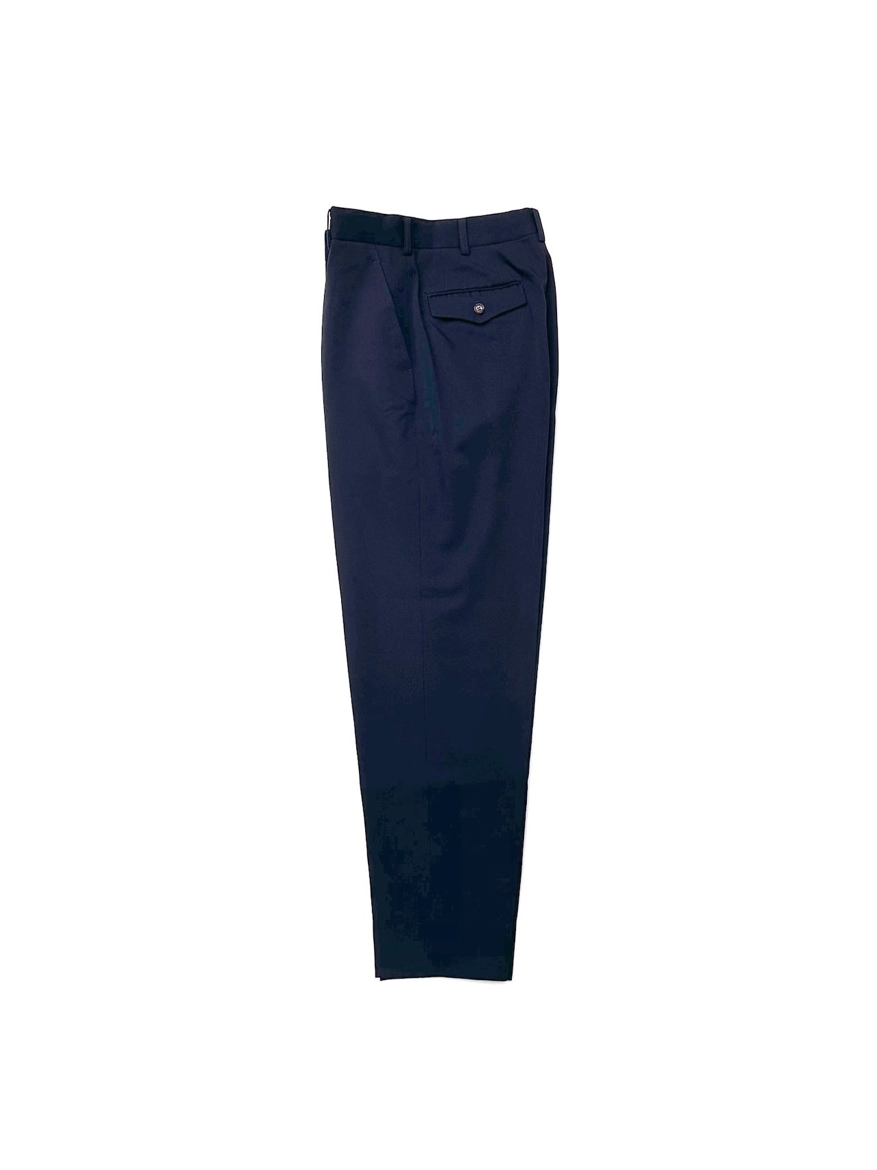 ネイビーのウールギャバジン仕立て、シルエットはルーズなテーパード。