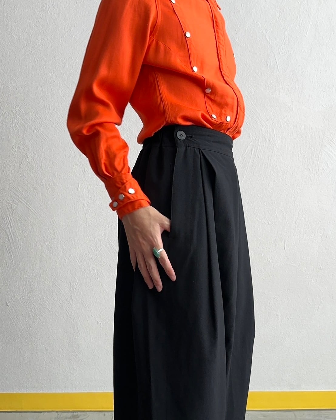 こんなドレープ映えするディテールを主役に据えつつ、パンツのベース構造にはセーラーパンツのような左右明きを採用。