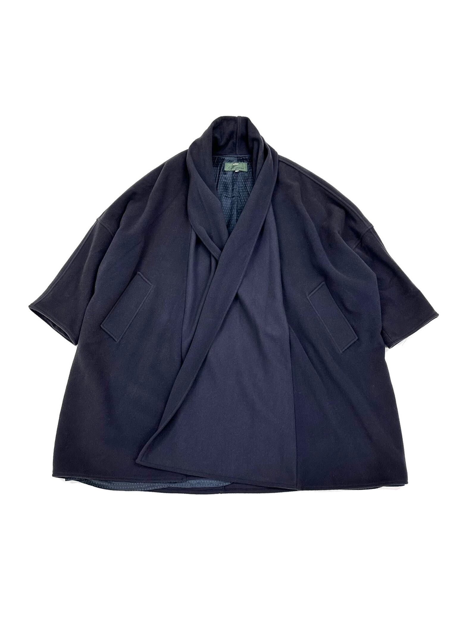 正しく着ると打ち合わせの深いショールカラーになるのですが、人間が前を留めずに着る都合上、布は縦横無尽に動き回ります。