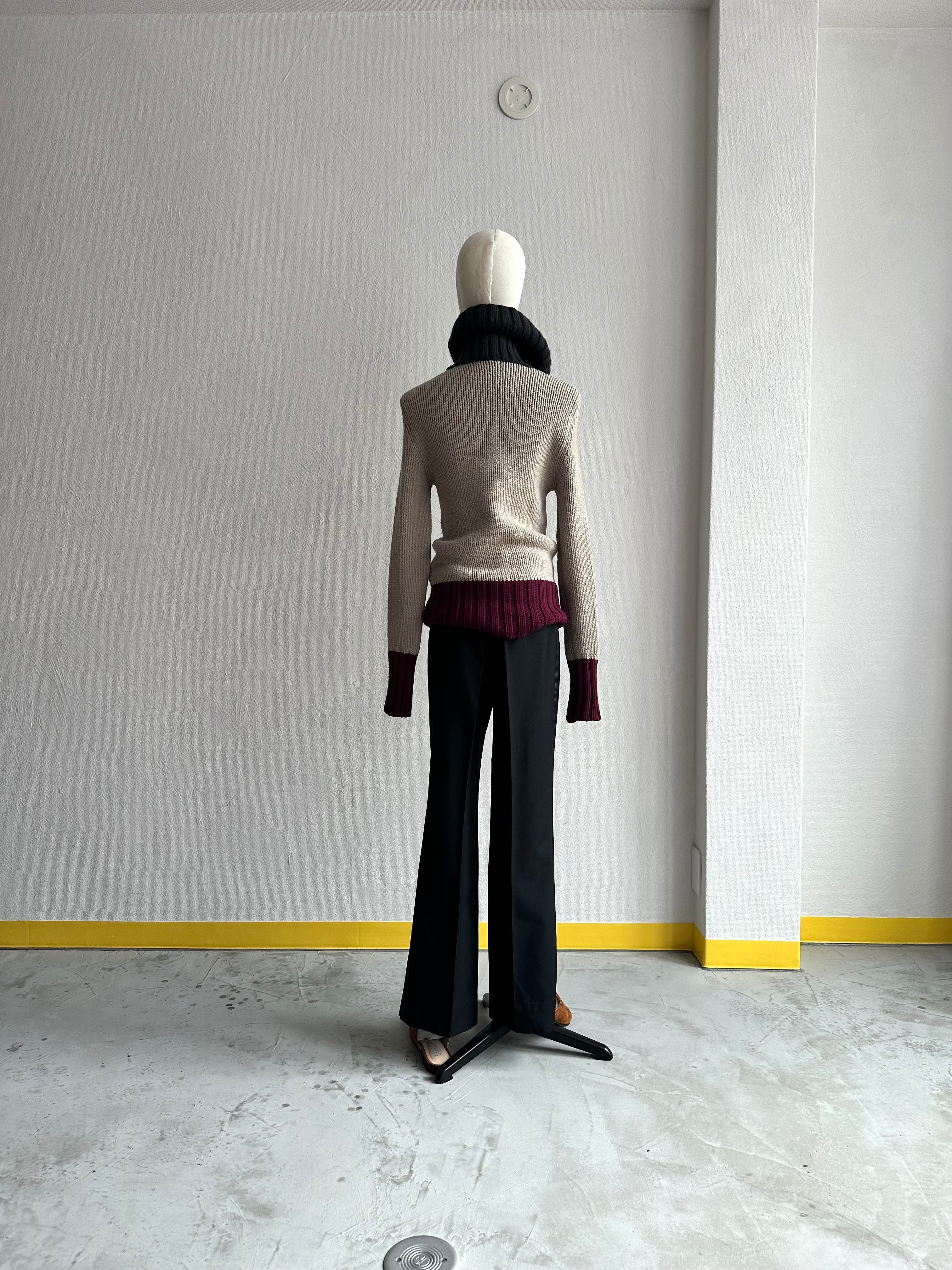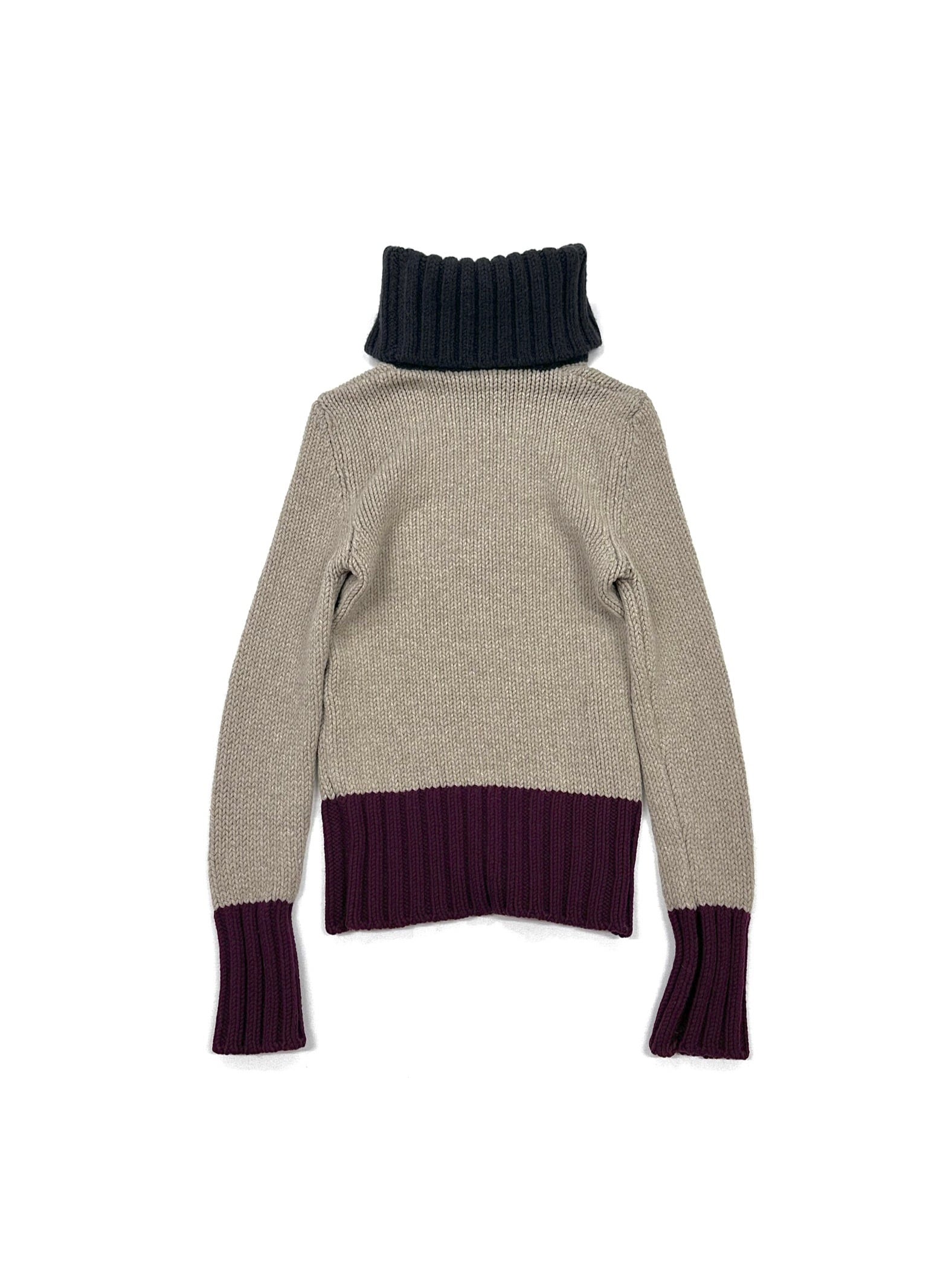 このタートルネックはモスグリーンで、袖と裾はダークグレープ。