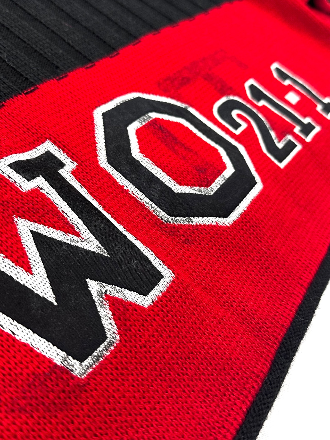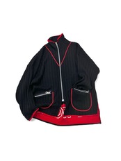 ジップアップのハイネックとは別に赤糸でVネックが騙し絵的にレイヤードされていたり、フロントポケットのアウトラインは赤糸のオーバーロックで縁取られていたり。