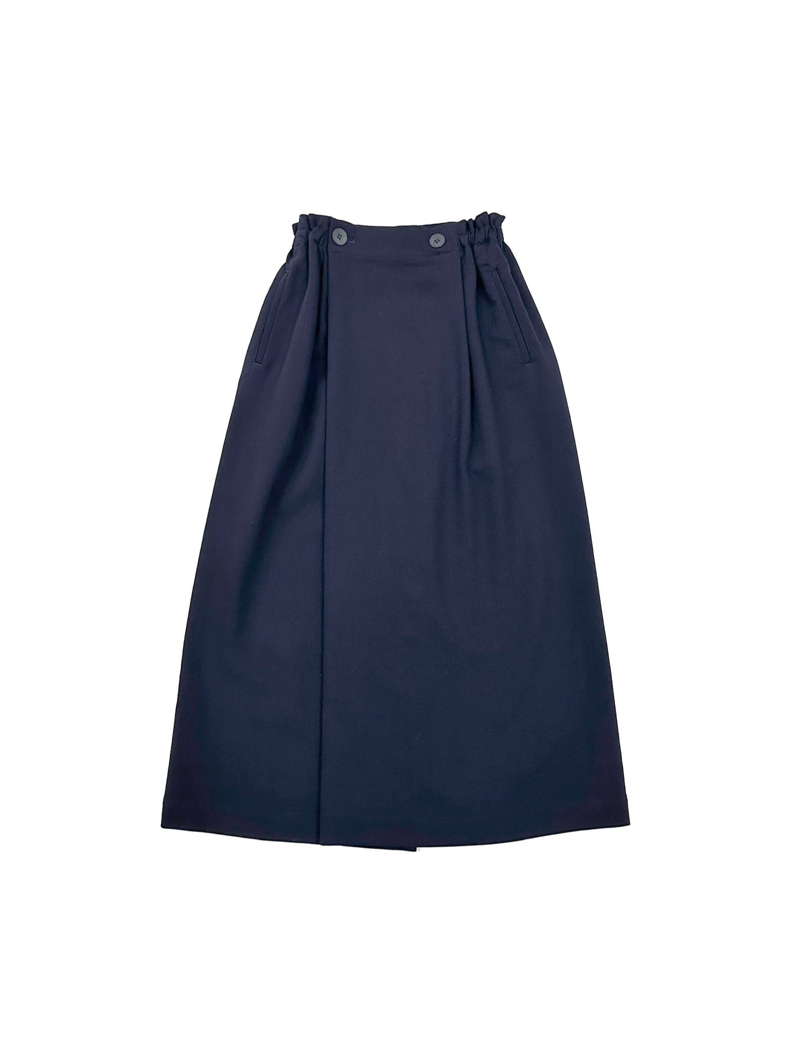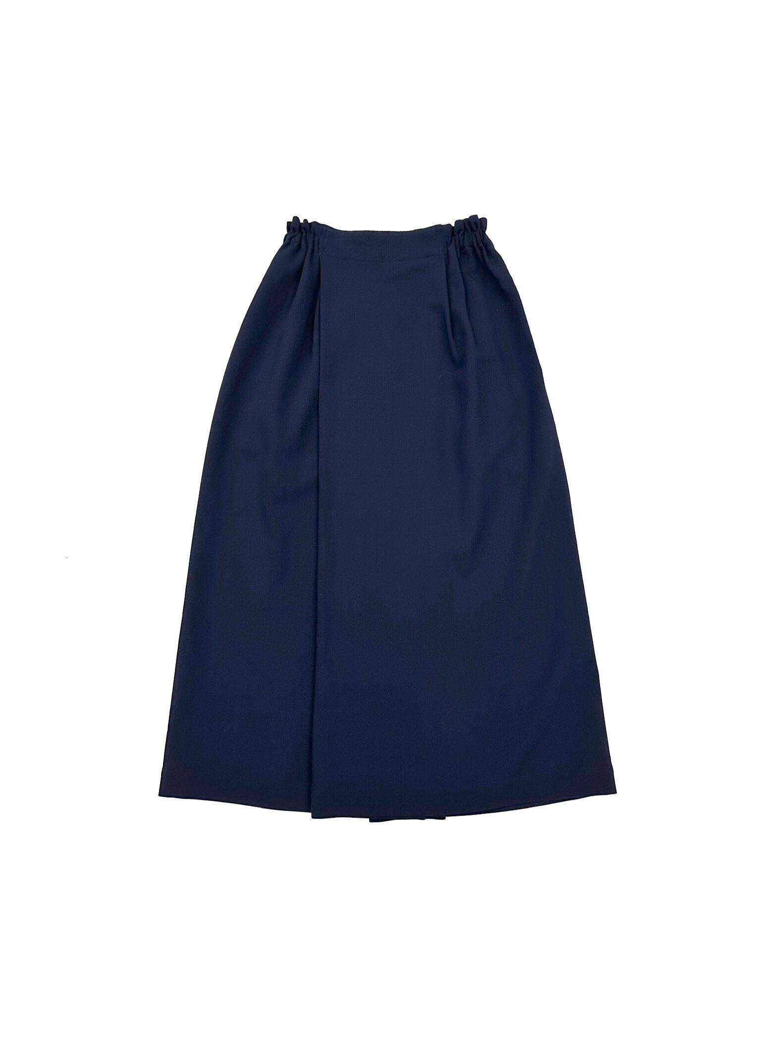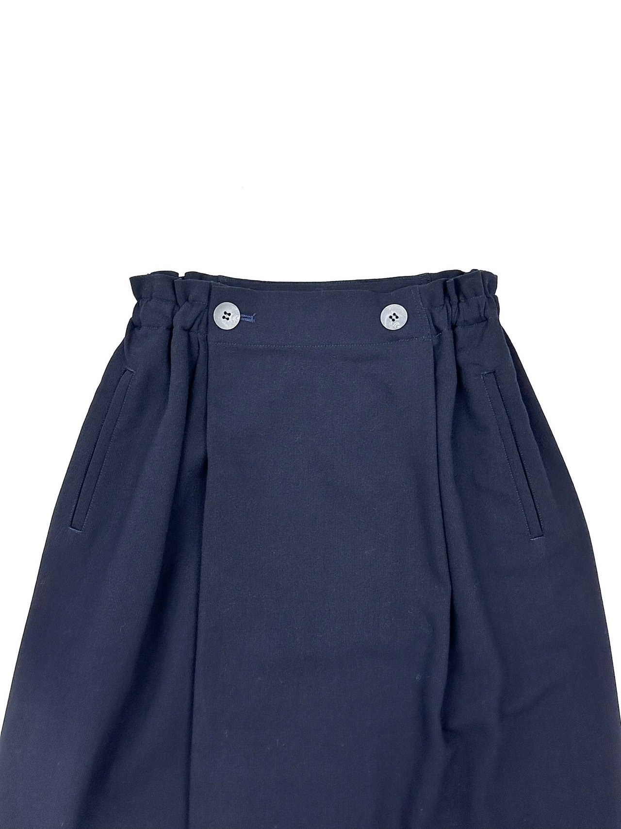 前後にアシンメトリーな大型タックを畳んだデザインのロングスカート。