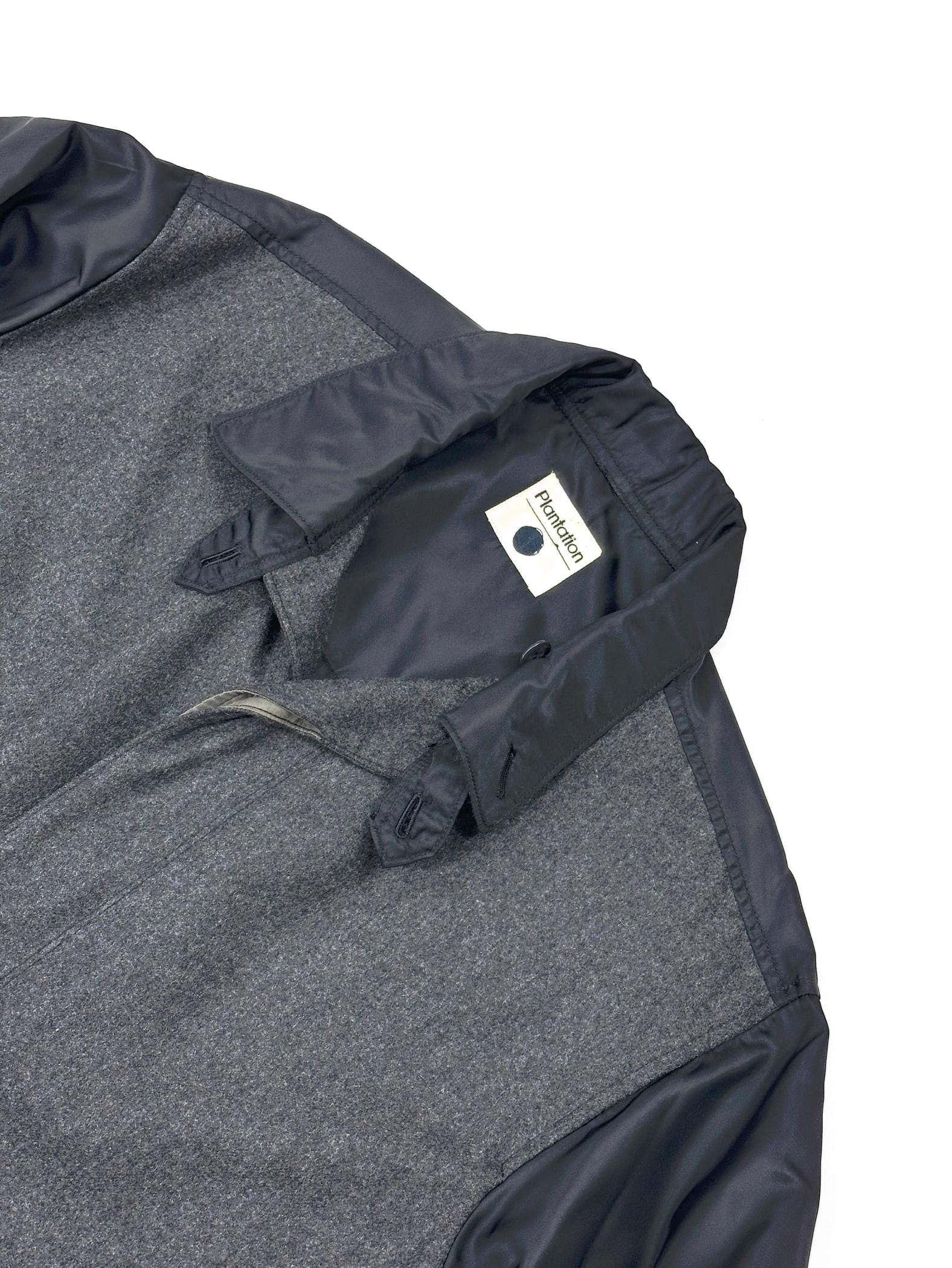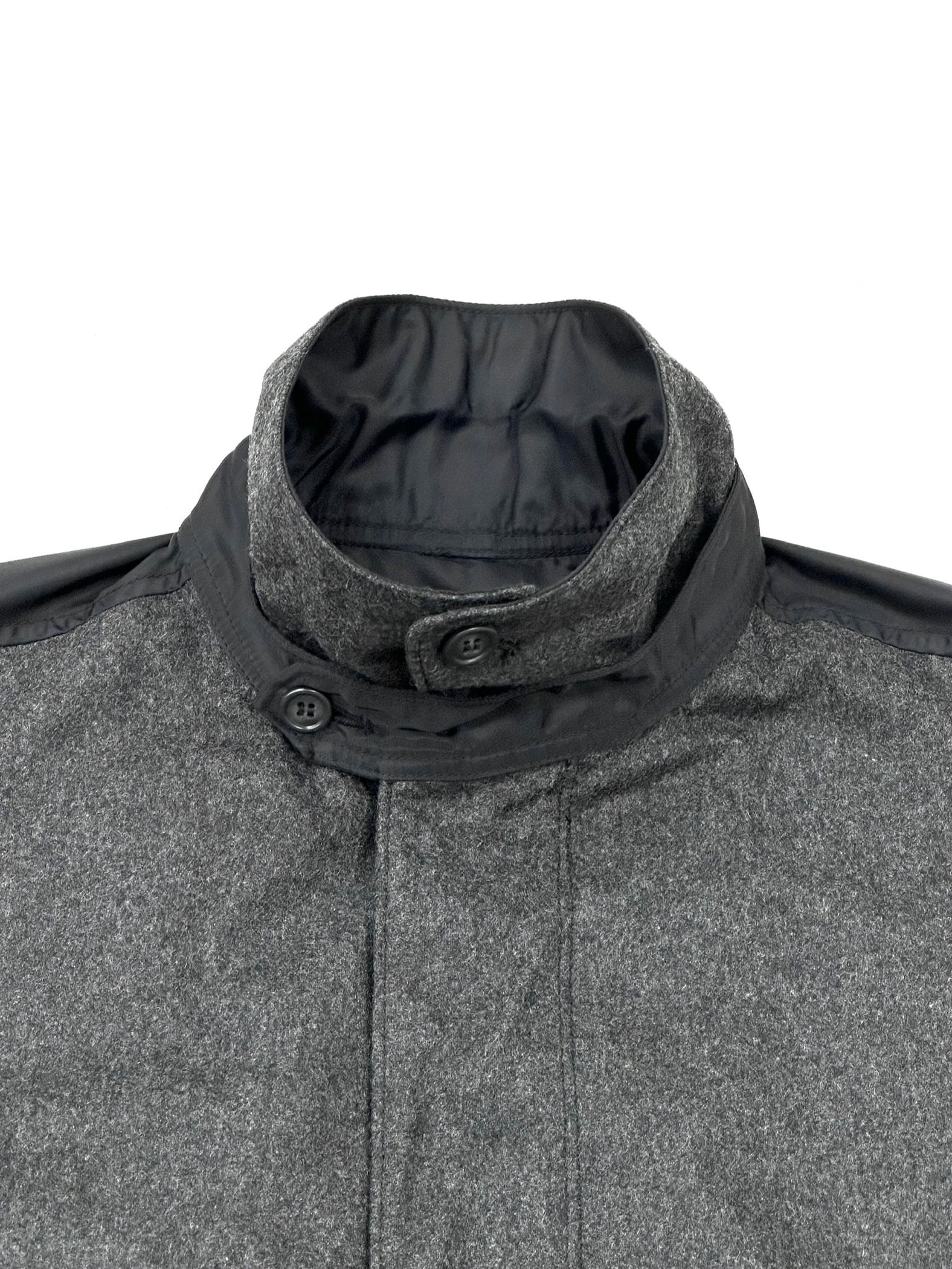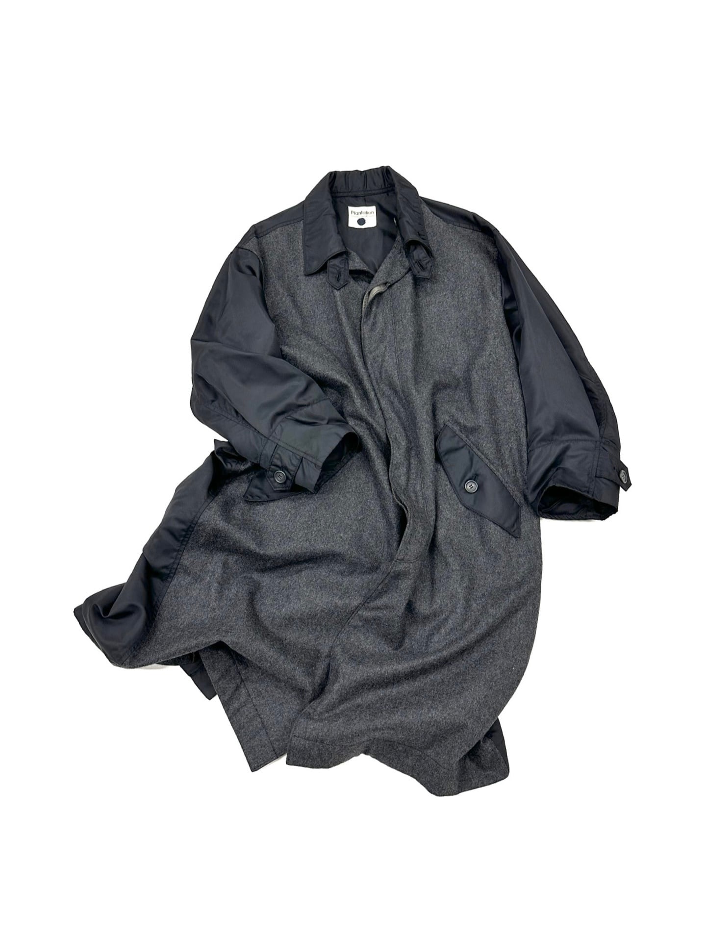 前見頃はチャコールグレーのウールフラノ、後ろ身頃と袖はブラックナイロンで構成されたコート。