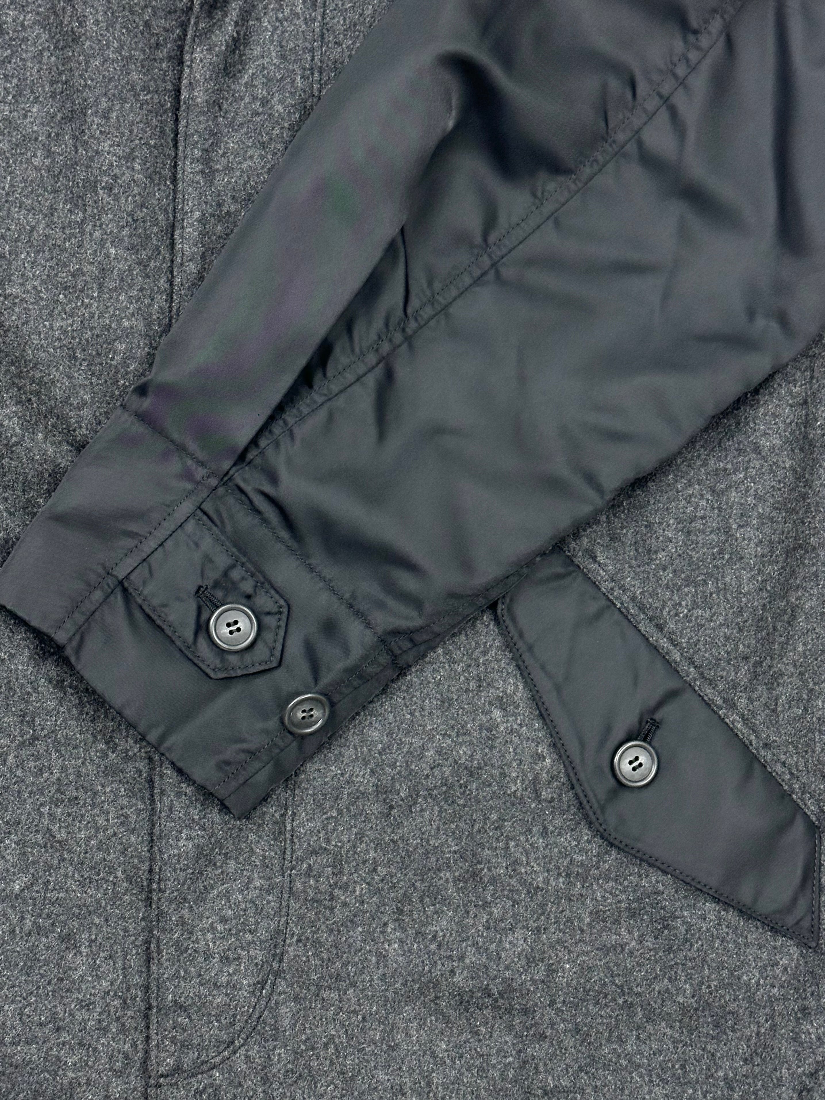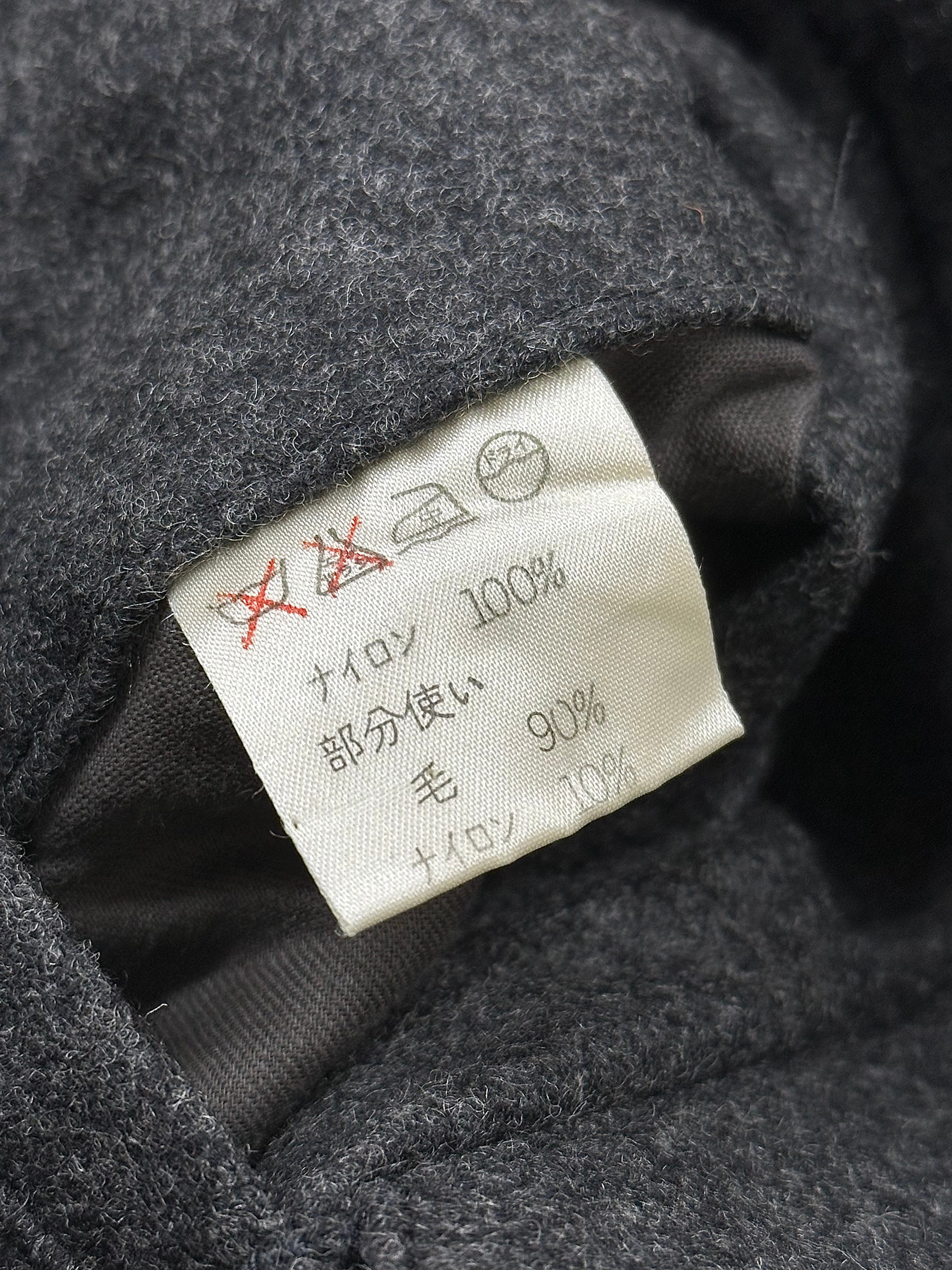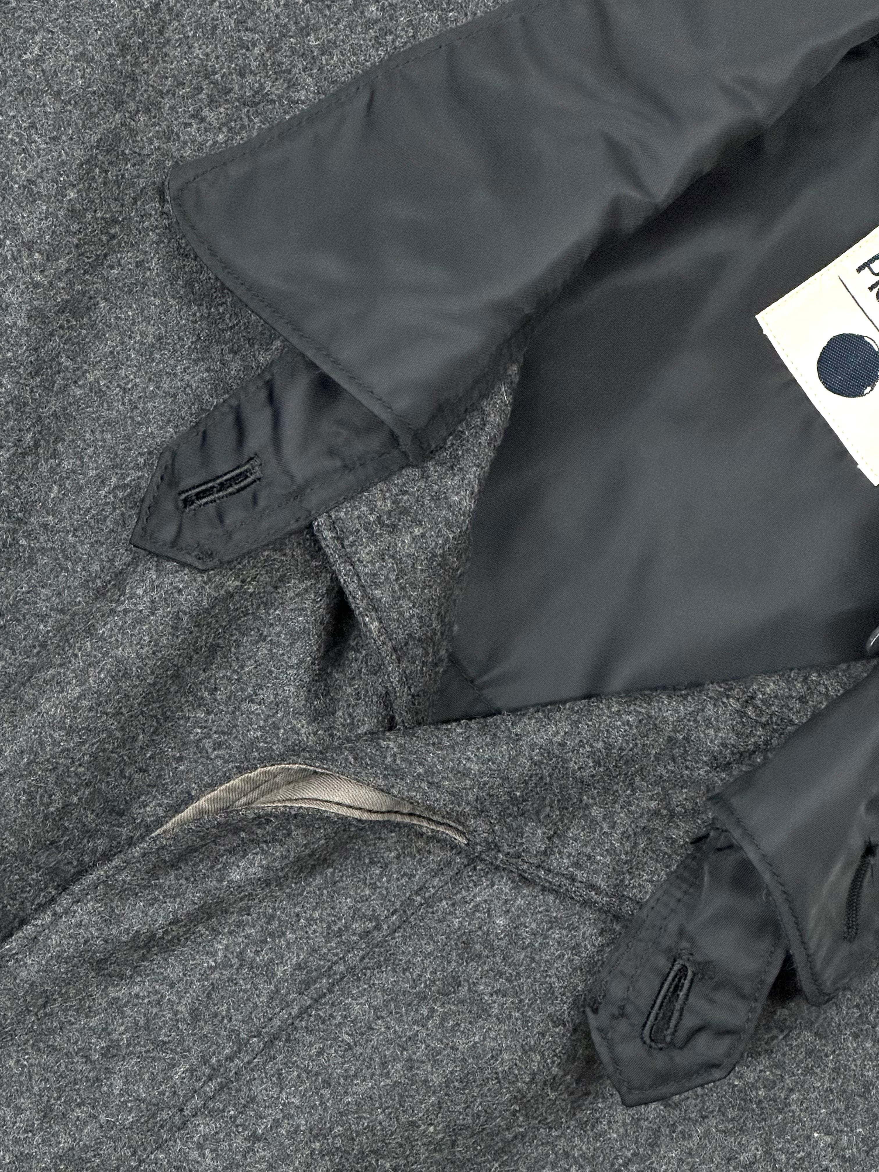 前見頃はチャコールグレーのウールフラノ、後ろ身頃と袖はブラックナイロンで構成されたコート。