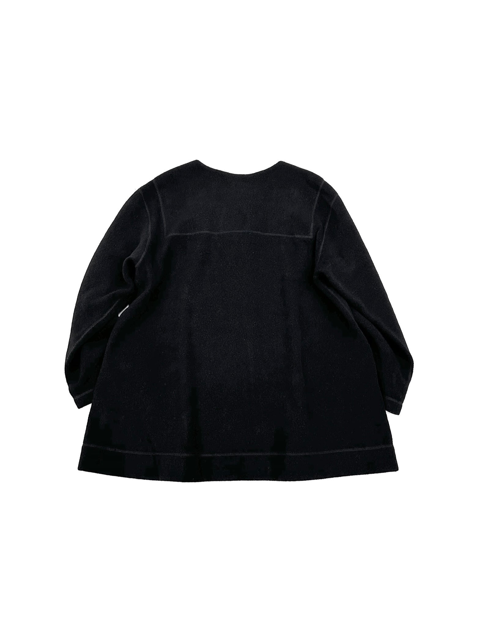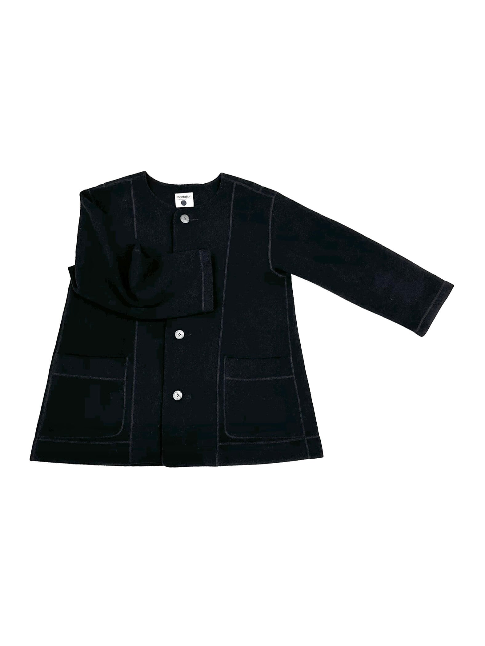 襟を排したノーカラーの設計はありとあらゆるポイントで角を落とした丸っこいビジュアル。