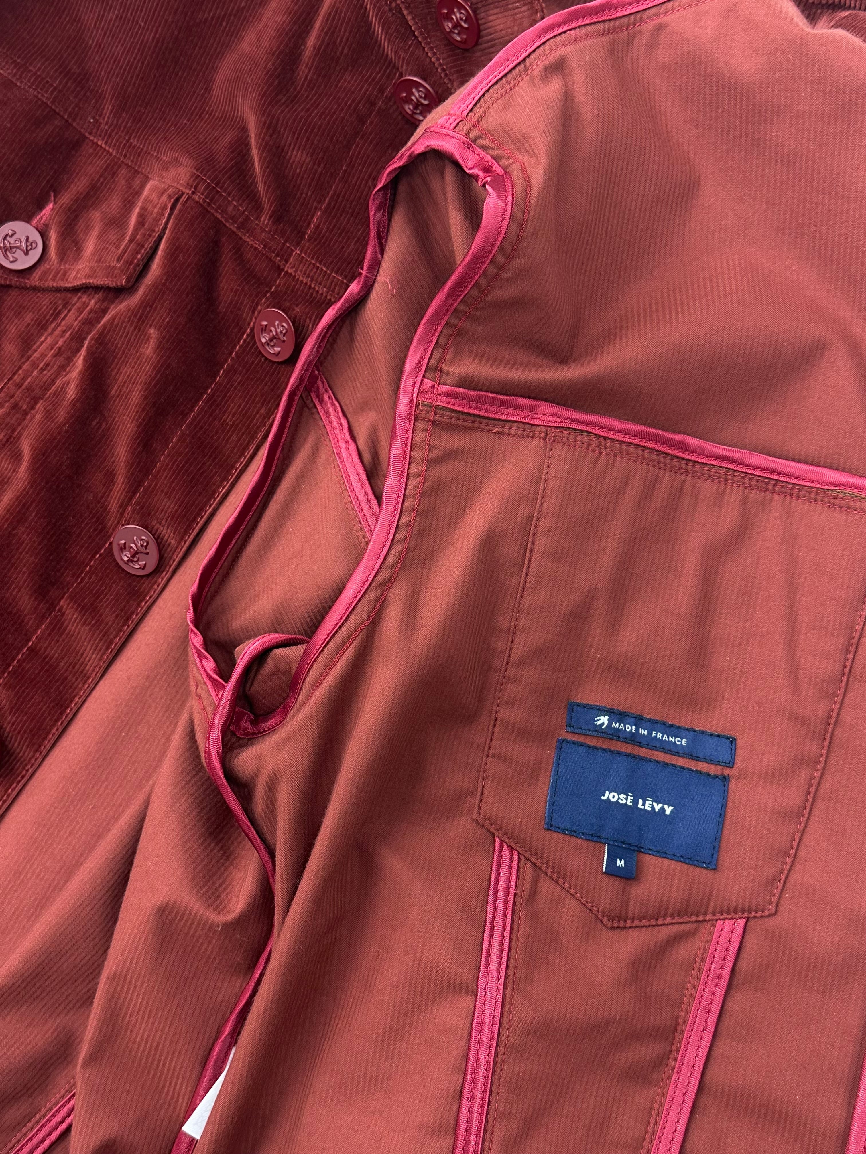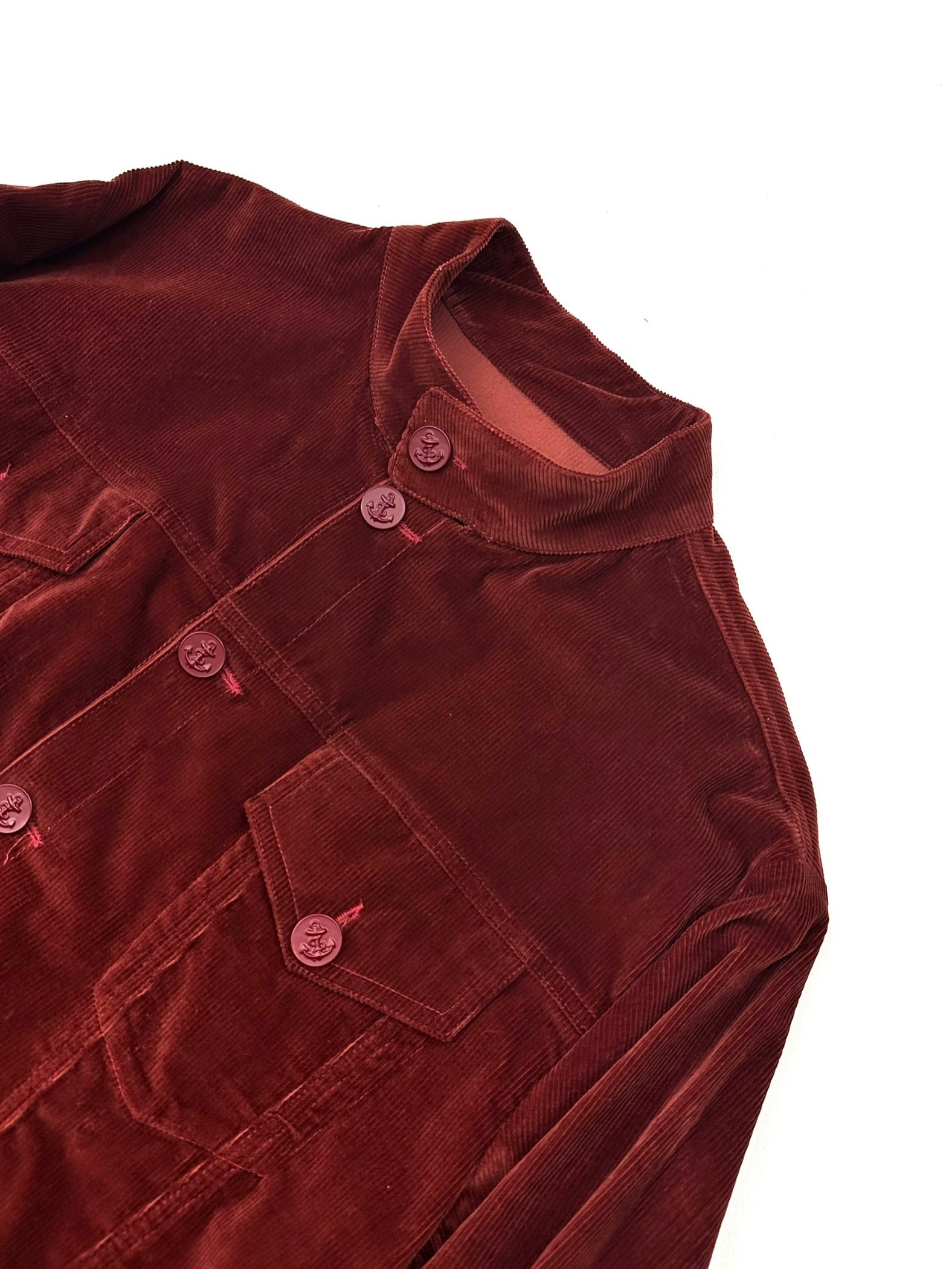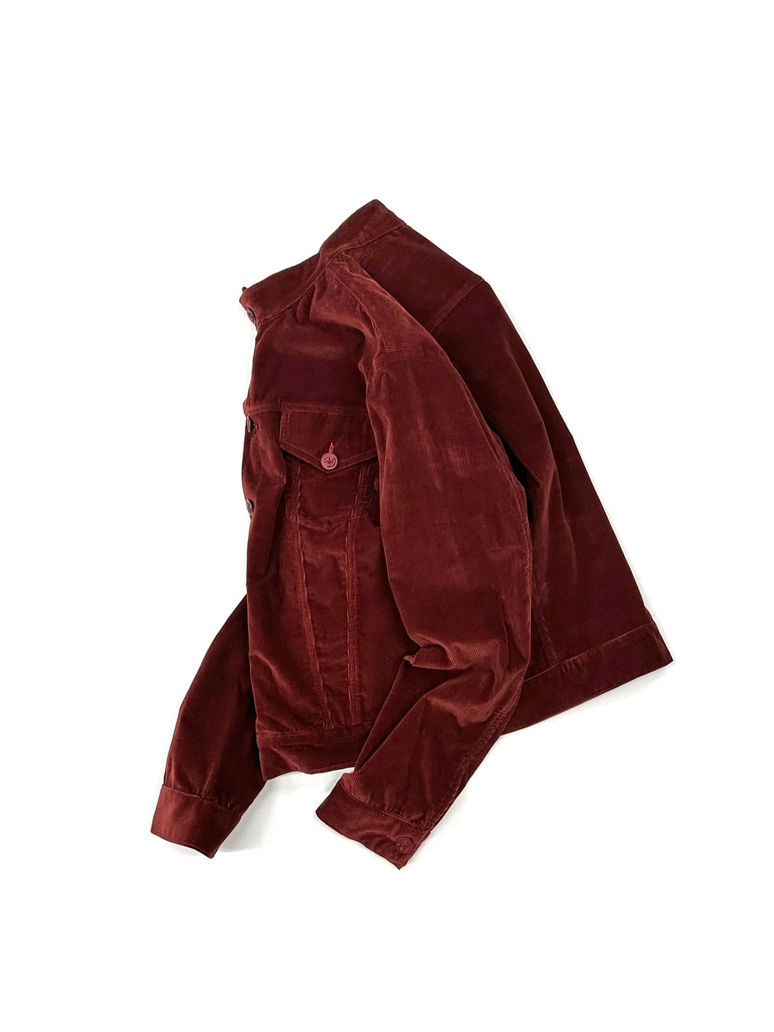 ワインレッドのコーデュロイで仕立てられたトラッカージャケット。