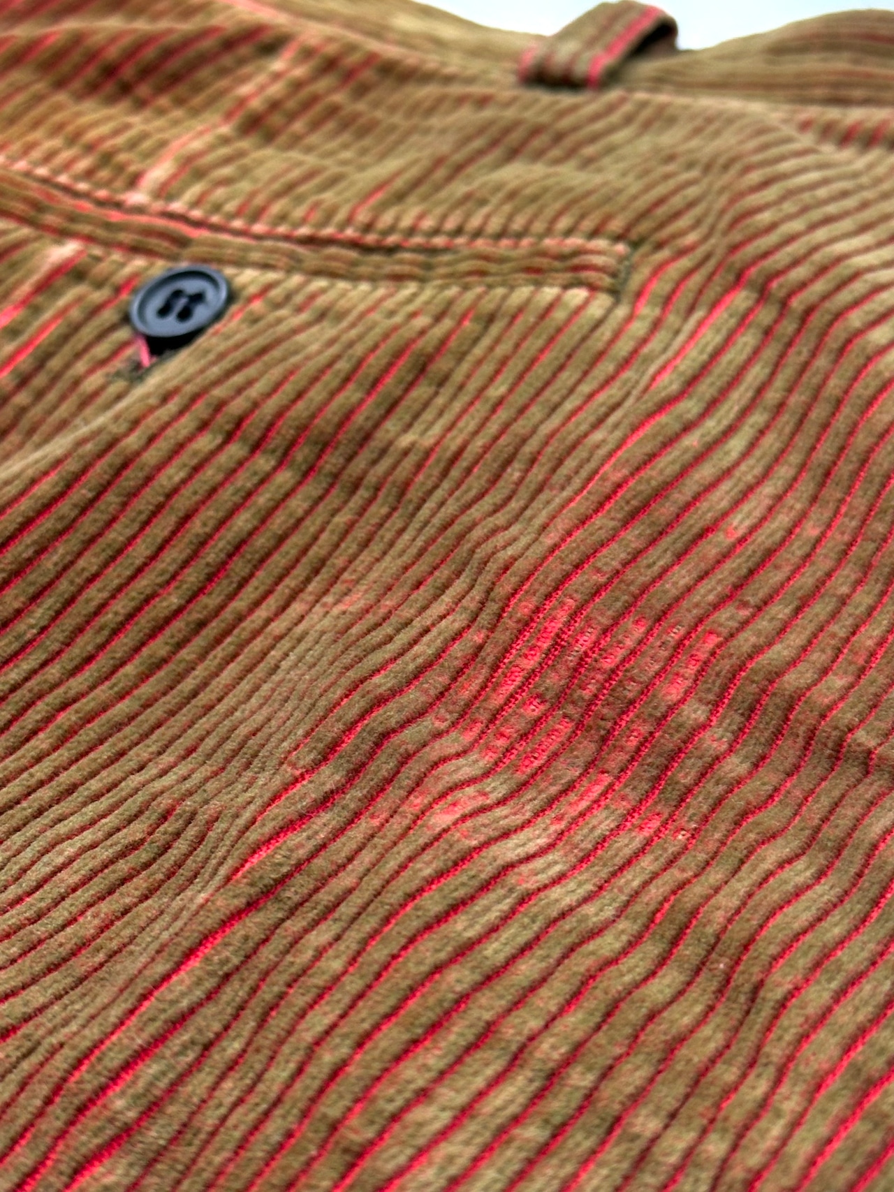 着用につれコーデュロイが少しずつヘタレていき、その部分の色がグラデーションで変わっていく。