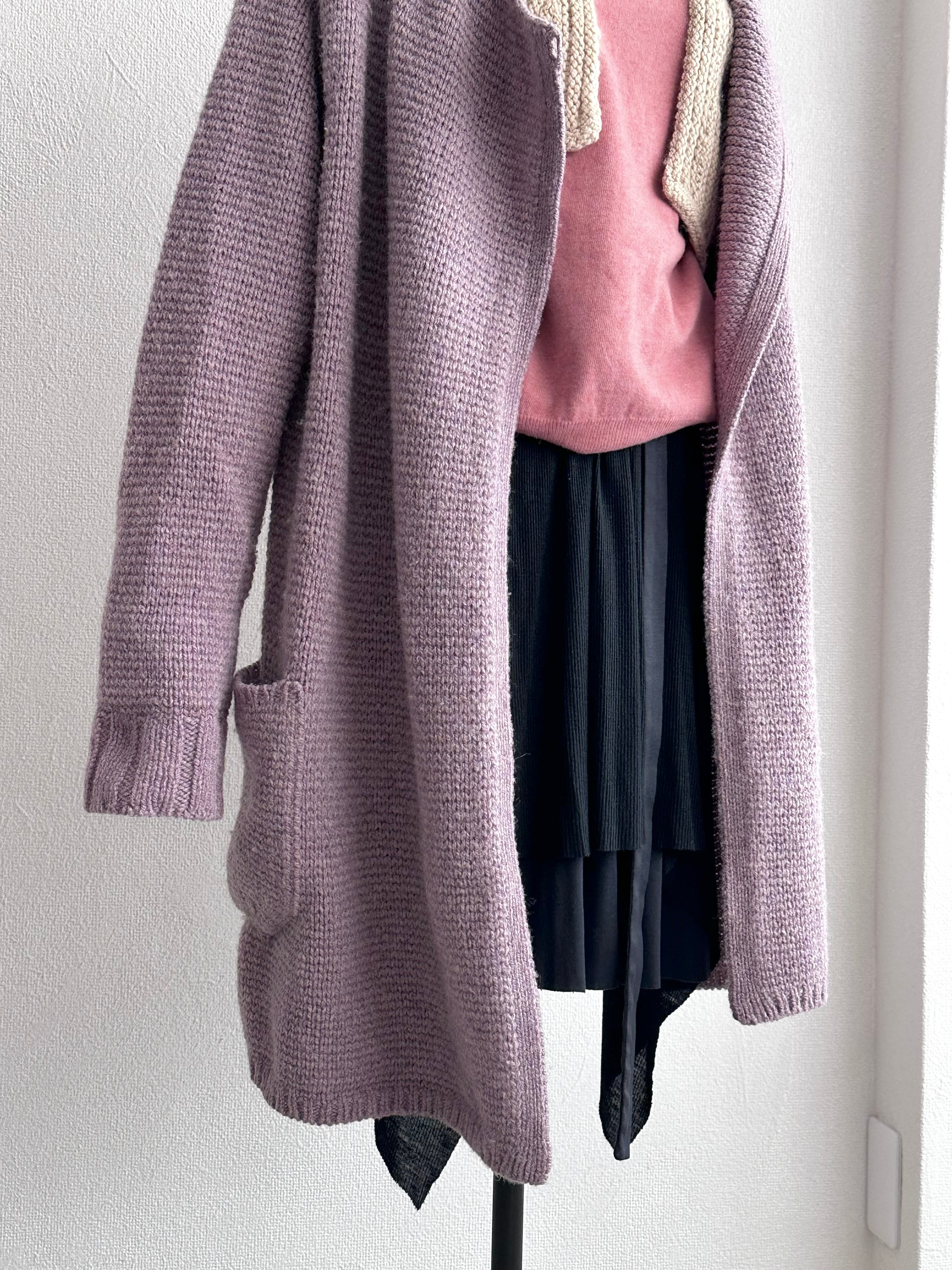 ホワイトメランジで柔らかく濁った淡いピンクパープルの編み地。