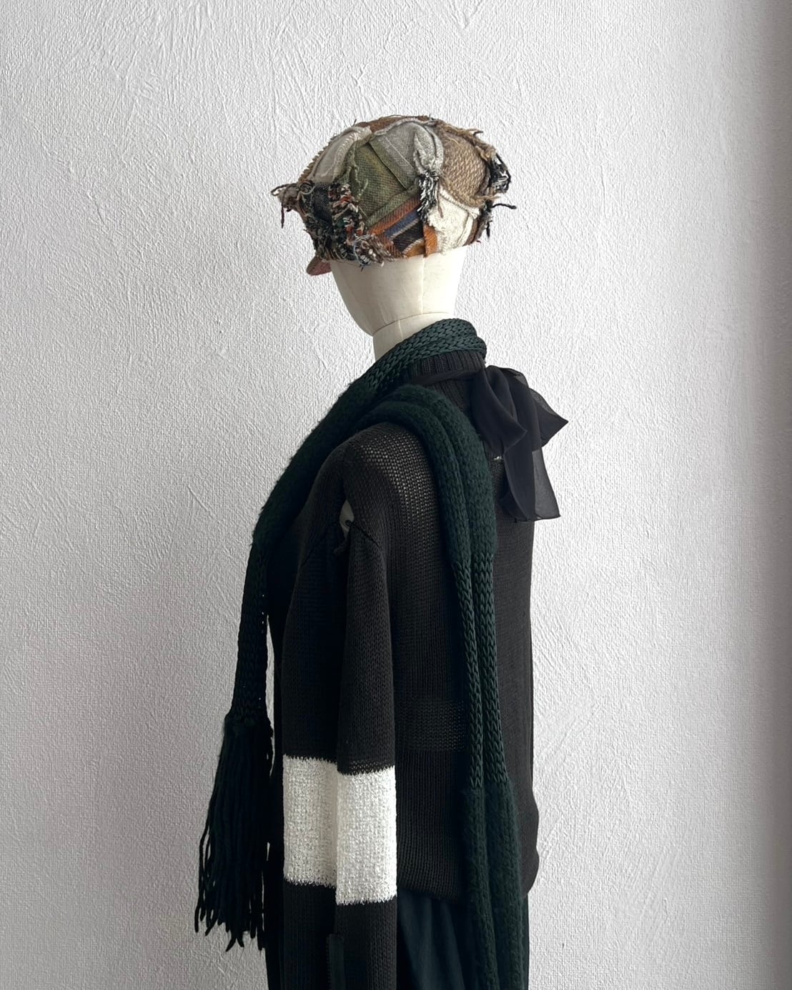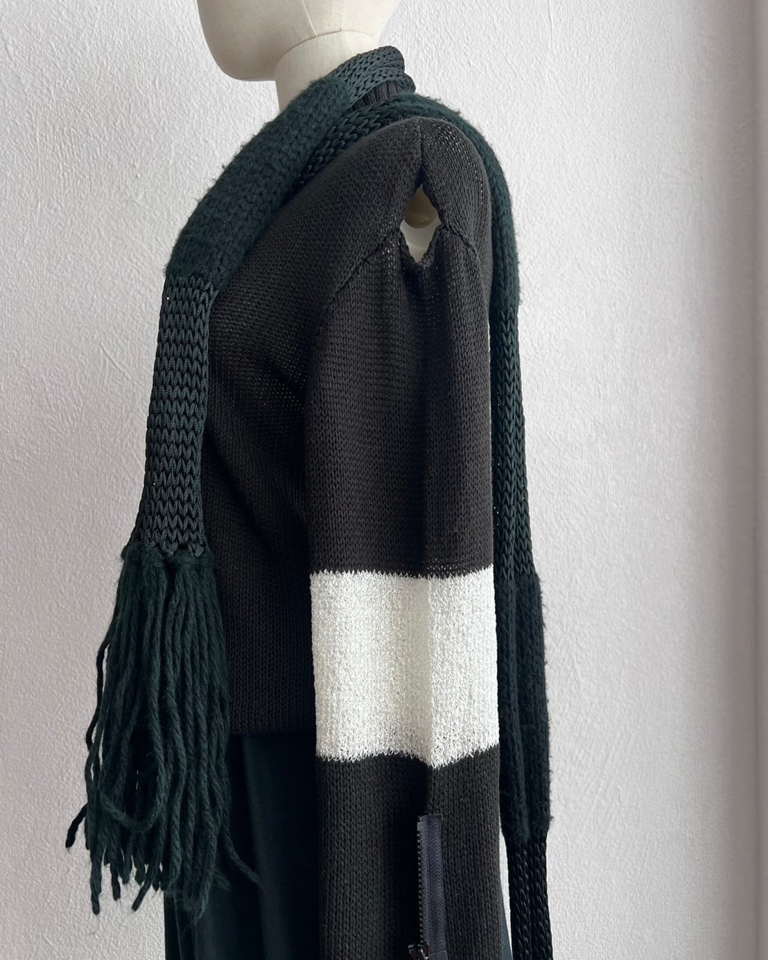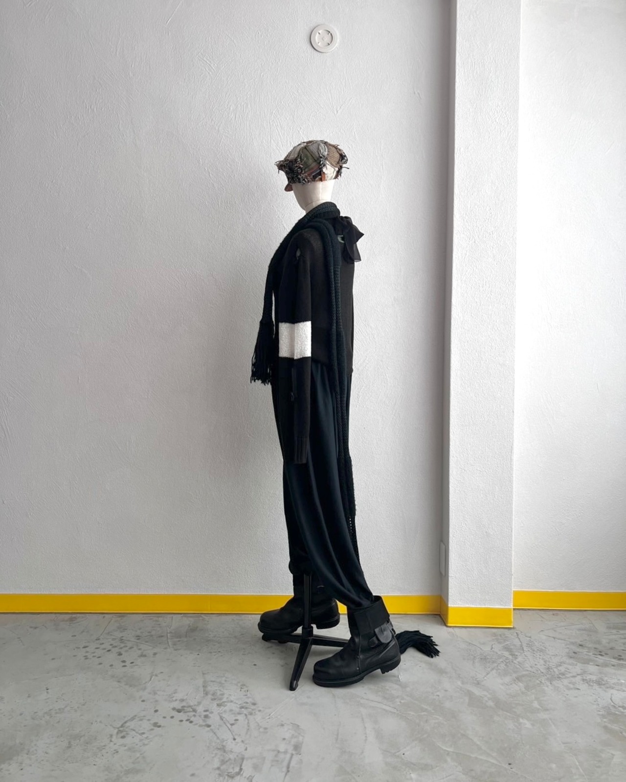 カットアウトって言うと後から切り裂いたみたいな印象が付くかもしれないけれど、正しく編み地設計の段階から部分的スラッシュをデザインされたディテール。