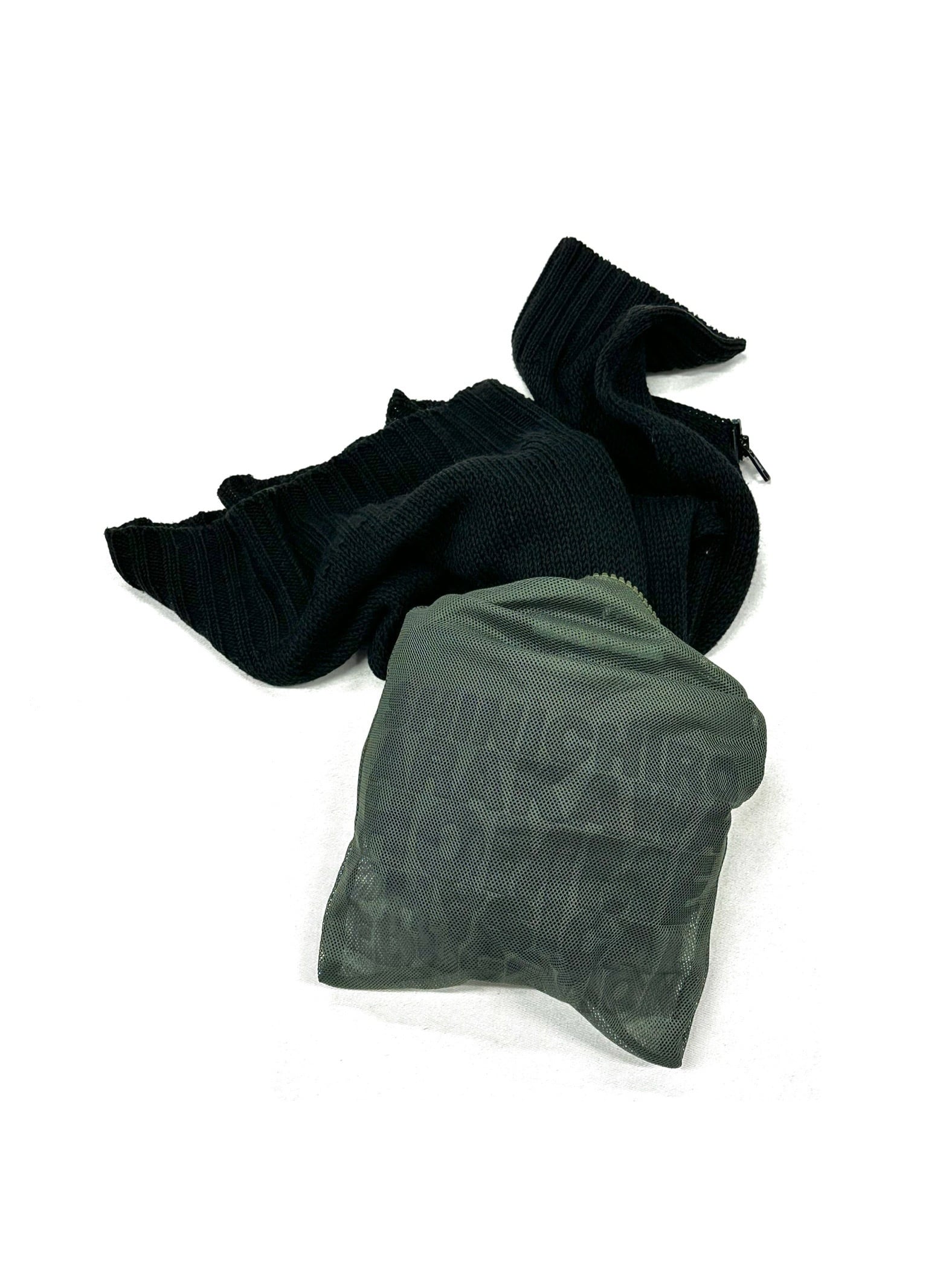 レーベルロゴがプリントされたメッシュバッグから飛び出してくるのは、なんとセーター。