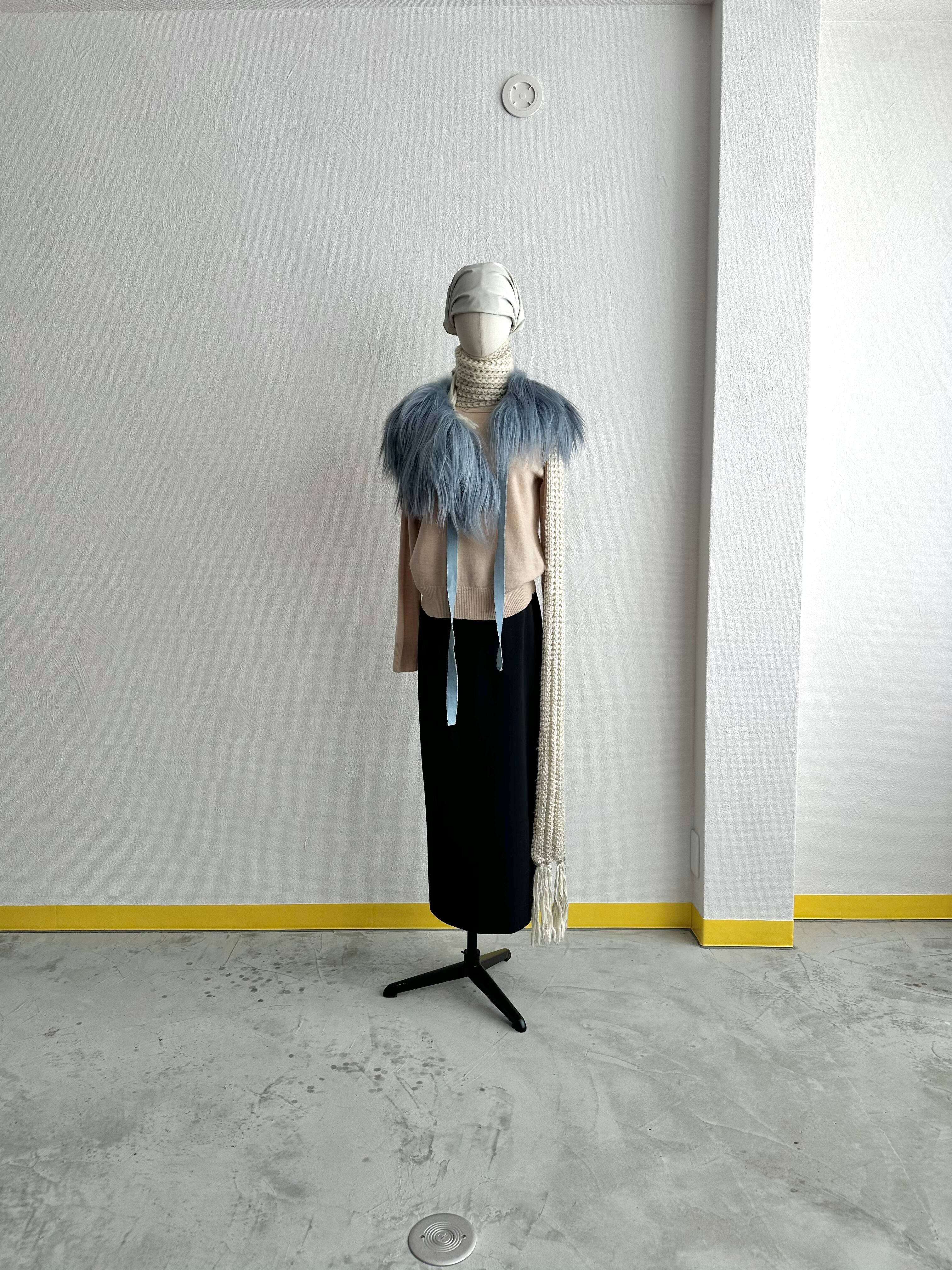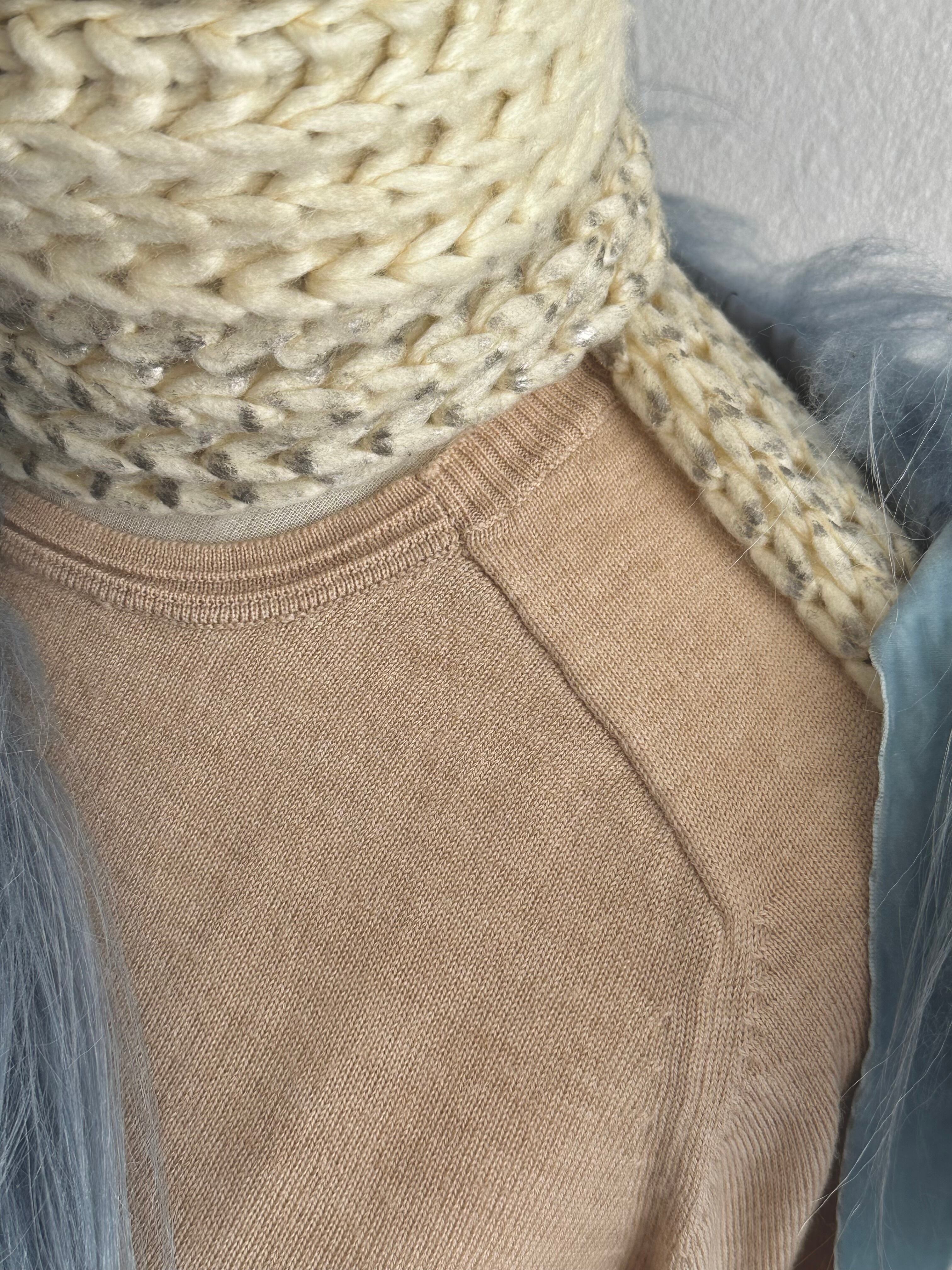 ご覧ください、ミニマルなネックデザインの大胆なスイッチニッティング。