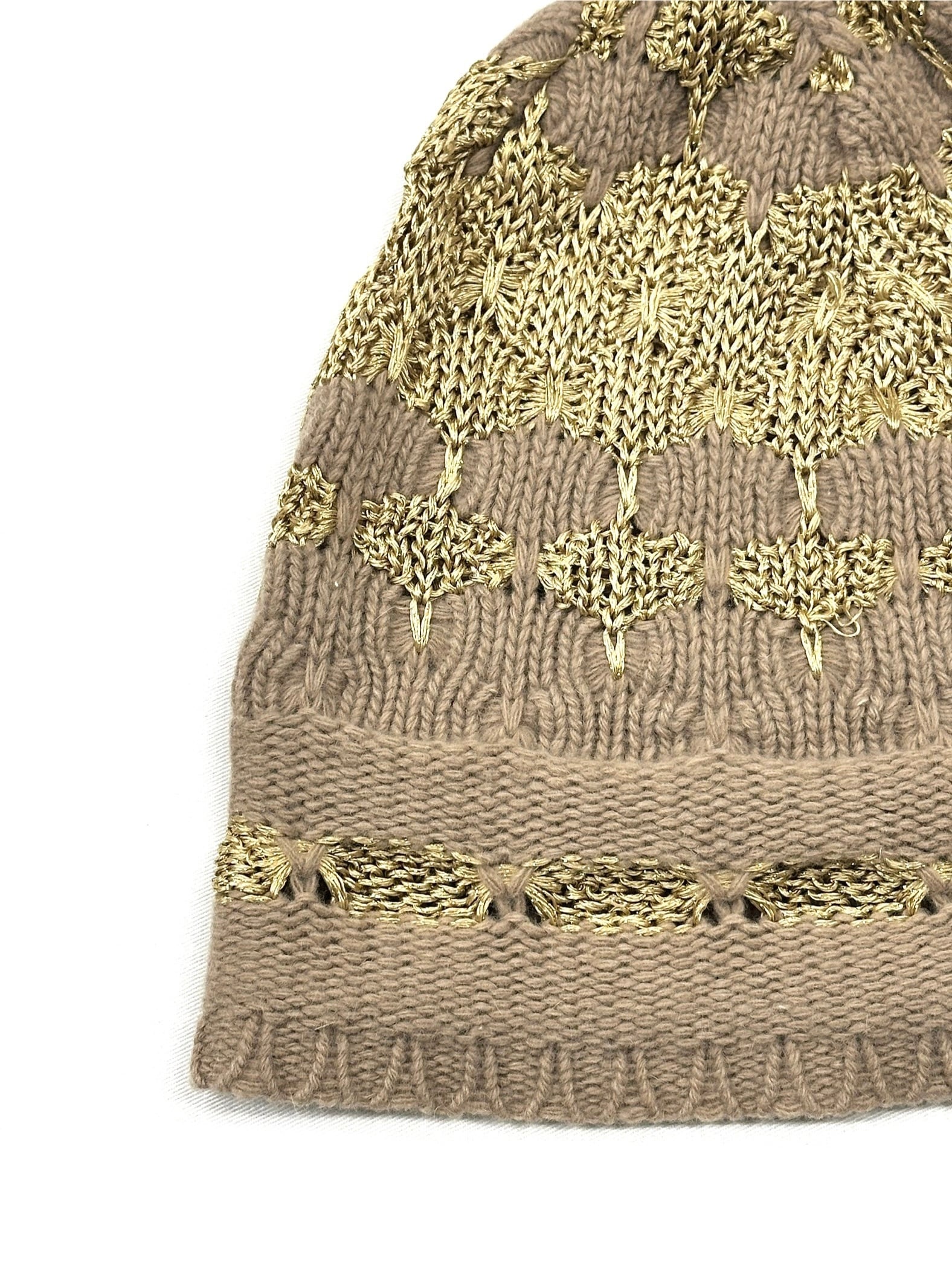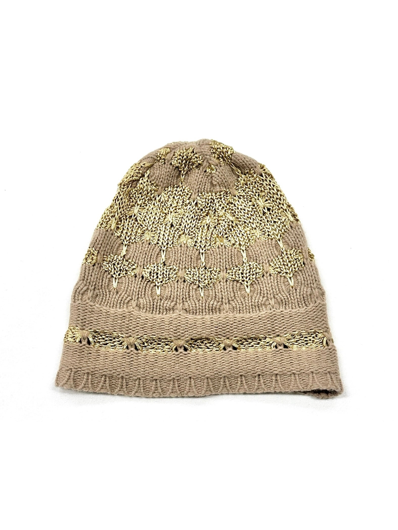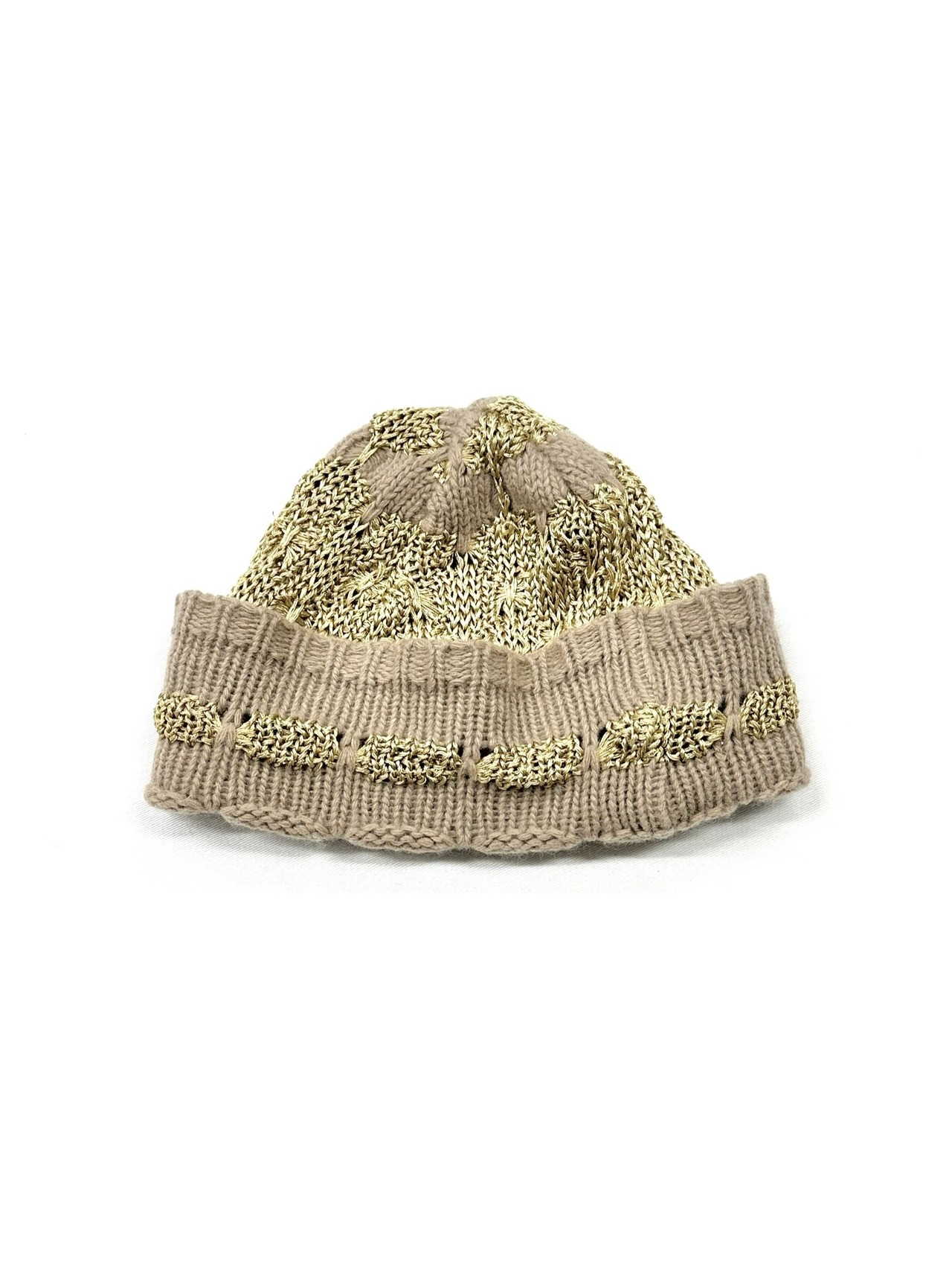 ベージュボディに金色毛糸の編み変えで柄をデザインしたニット帽。