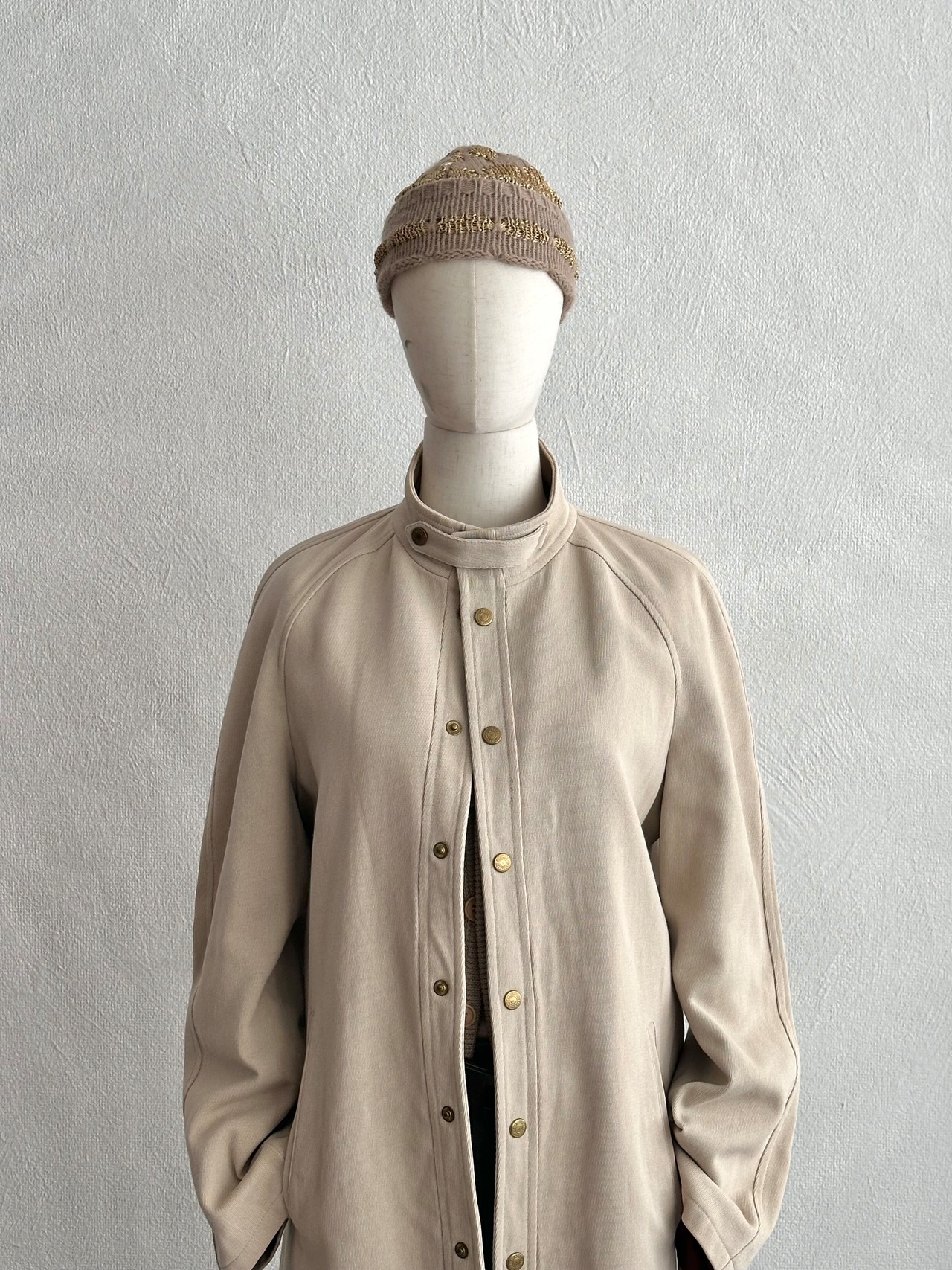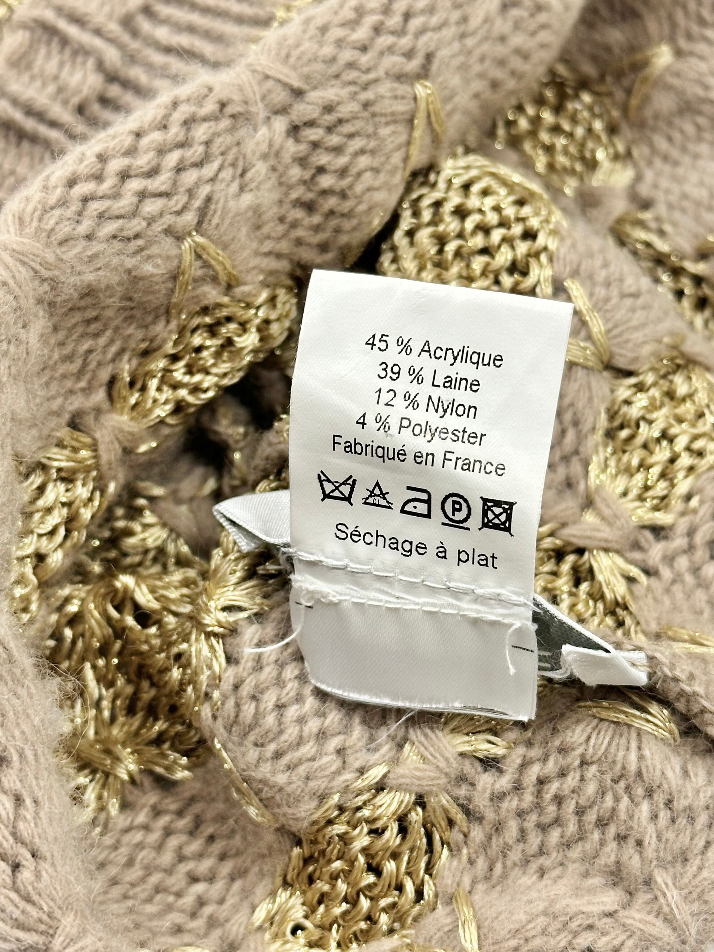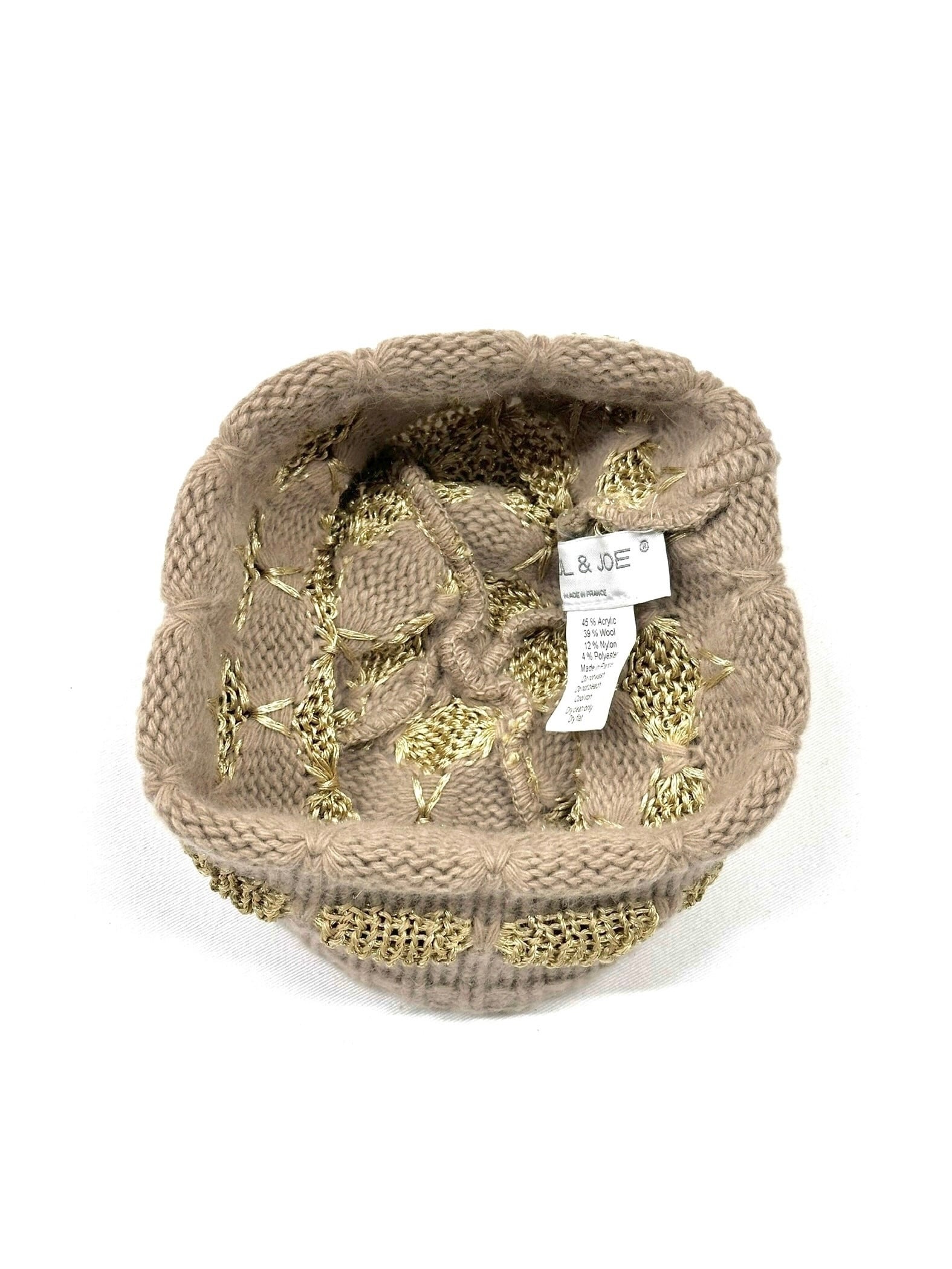ベージュボディに金色毛糸の編み変えで柄をデザインしたニット帽。