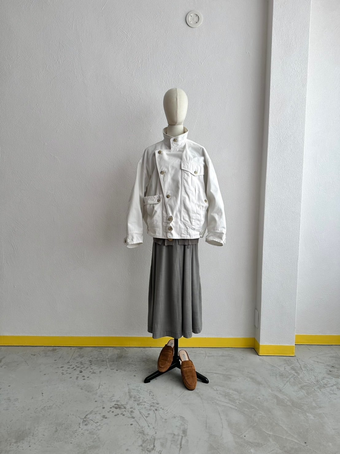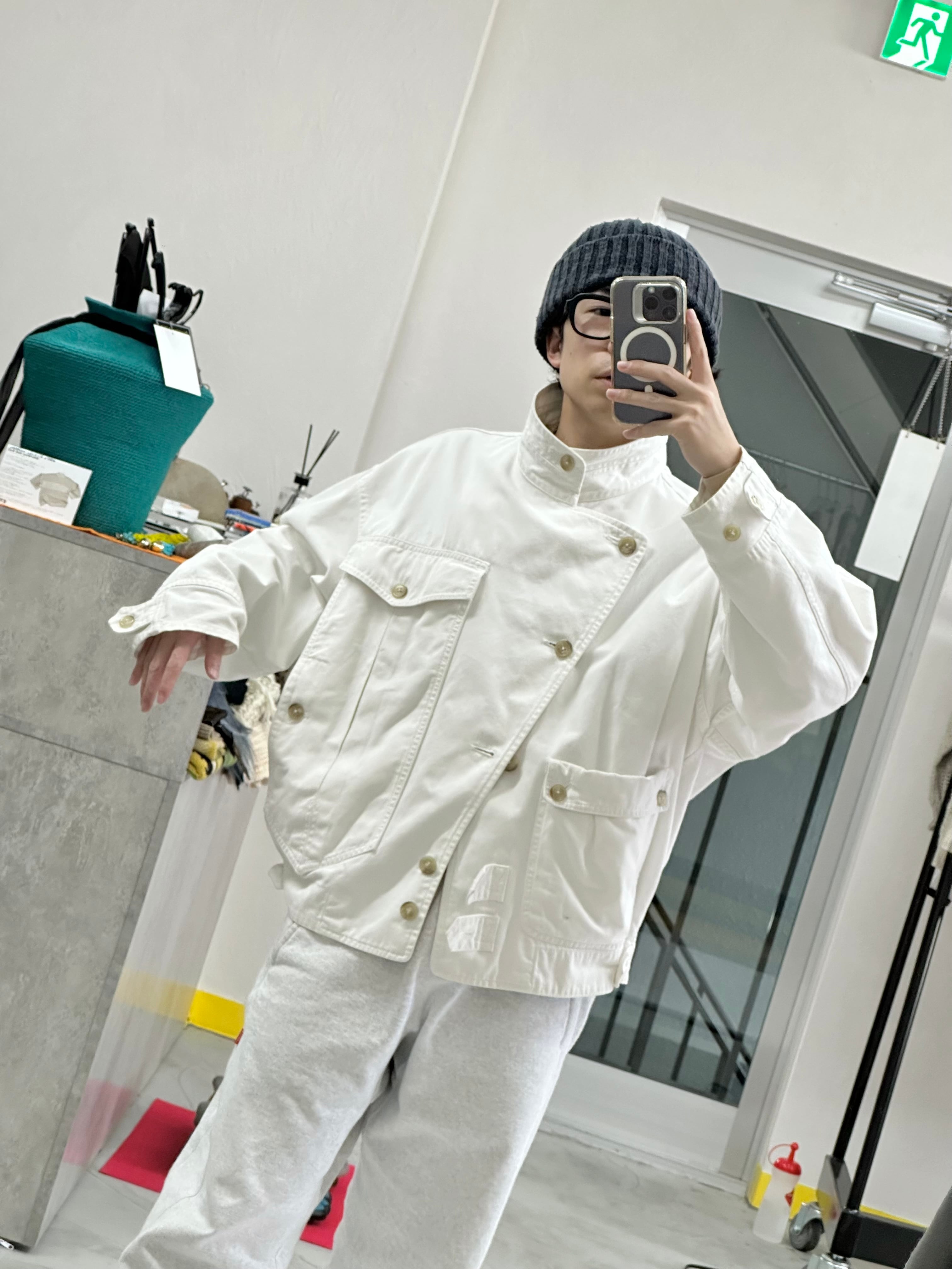 アシンメトリーフロントと完璧なバランスのハイネック、そして奇天烈なポケットデザイン。