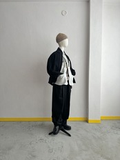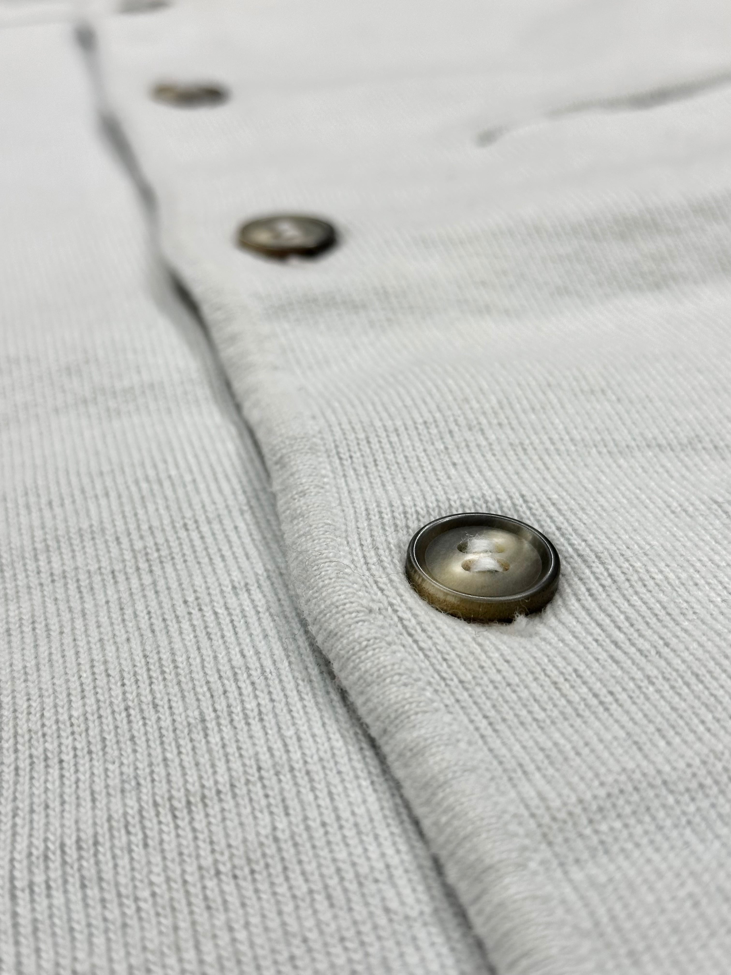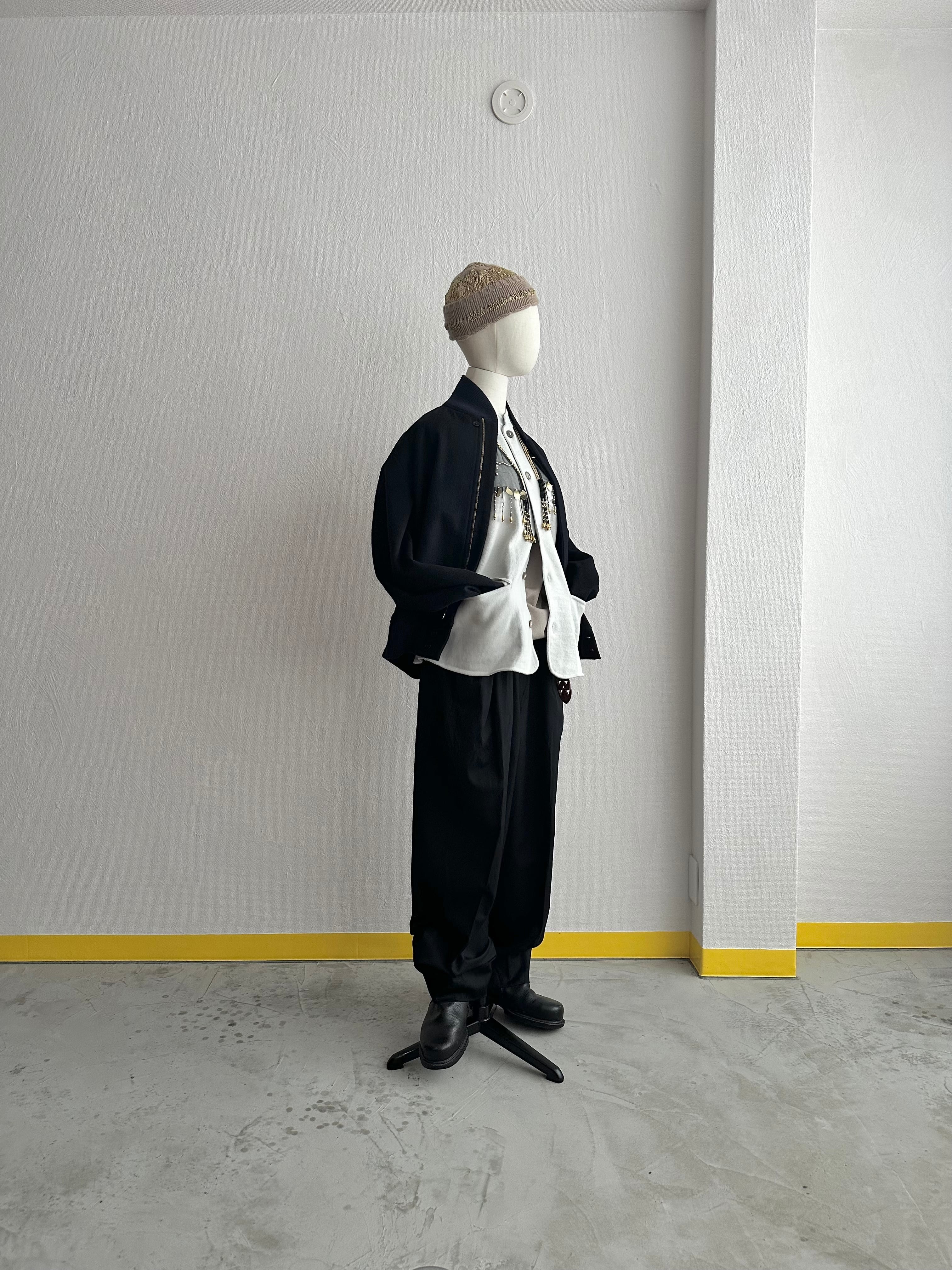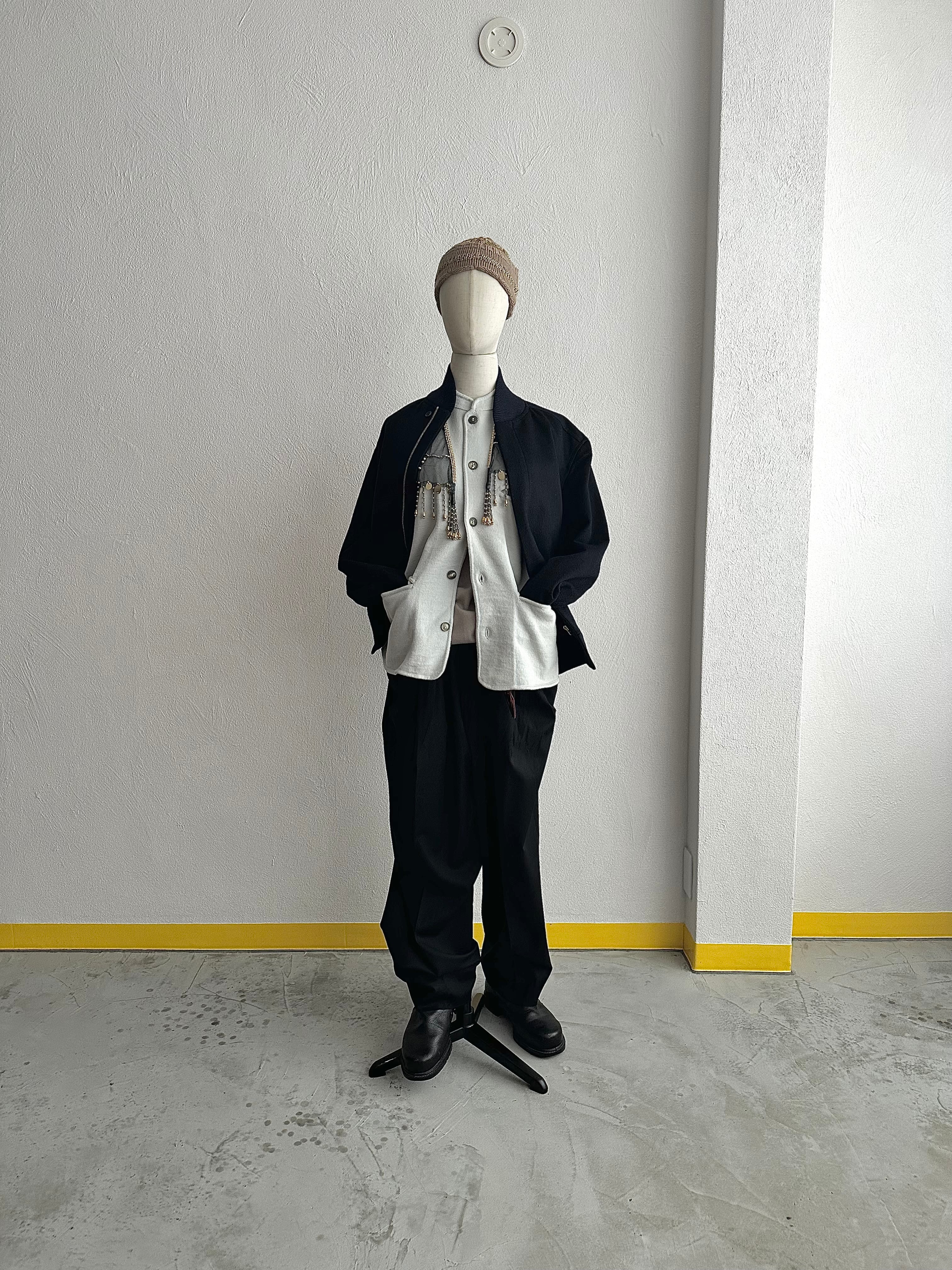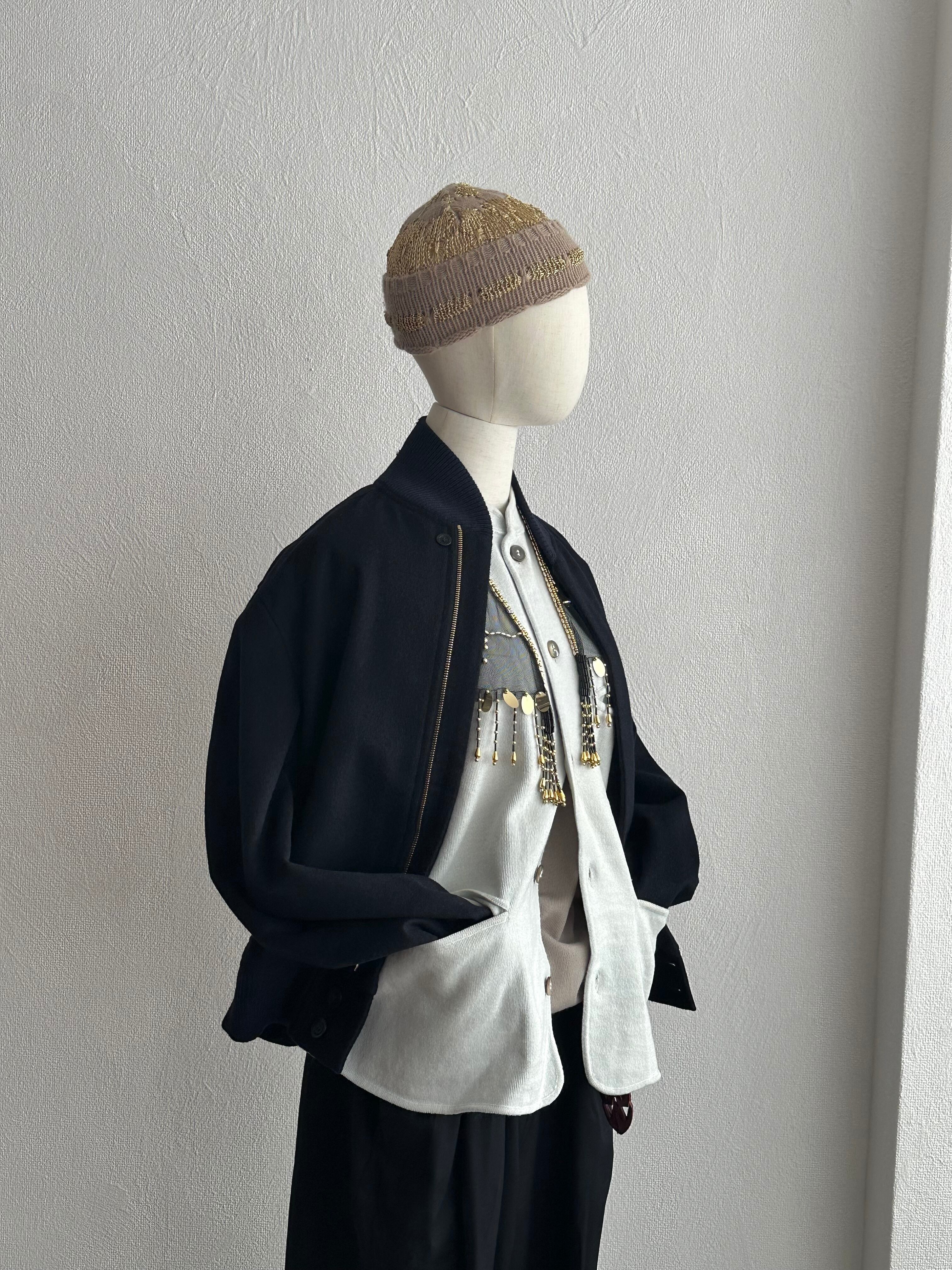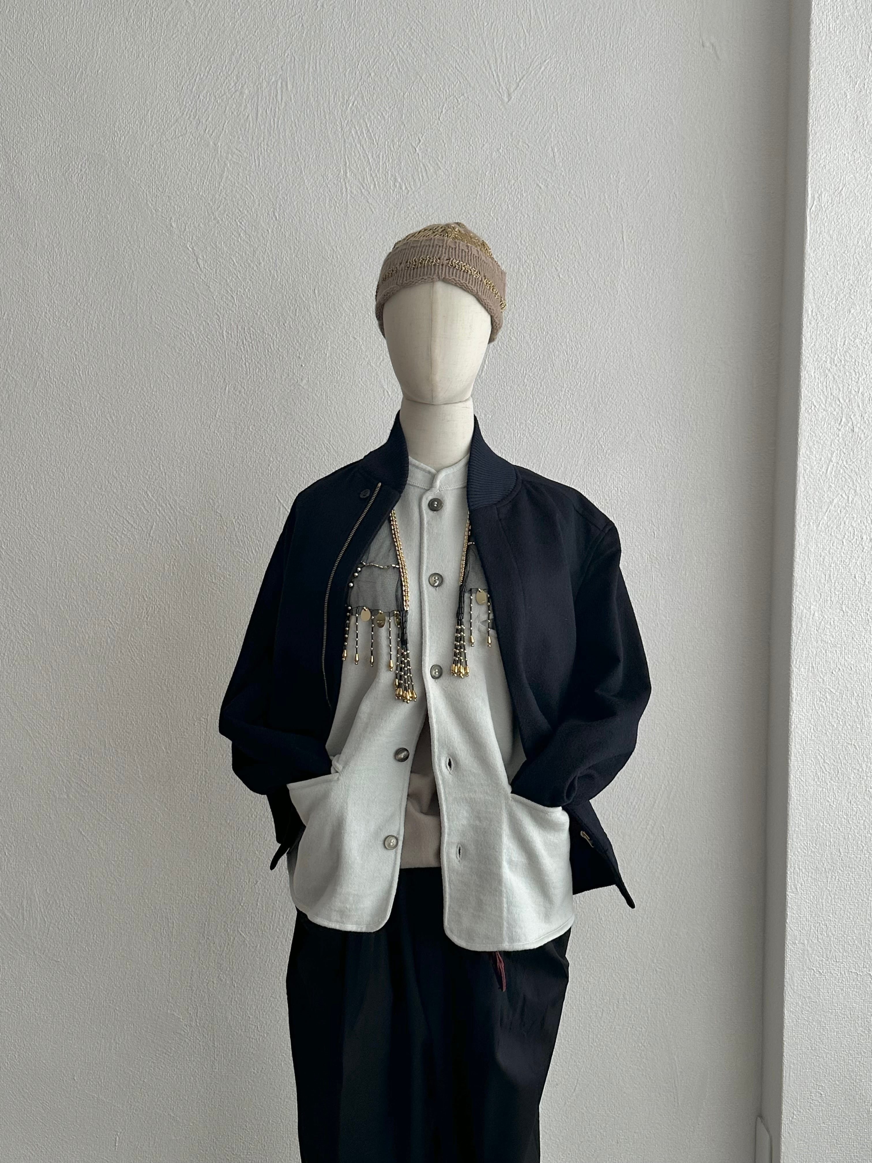パーツ端の密な太幅トリミングやボタン選定に至るまで、Jean Touitouの審美眼が最高まで研ぎ澄まされた仕事です。
