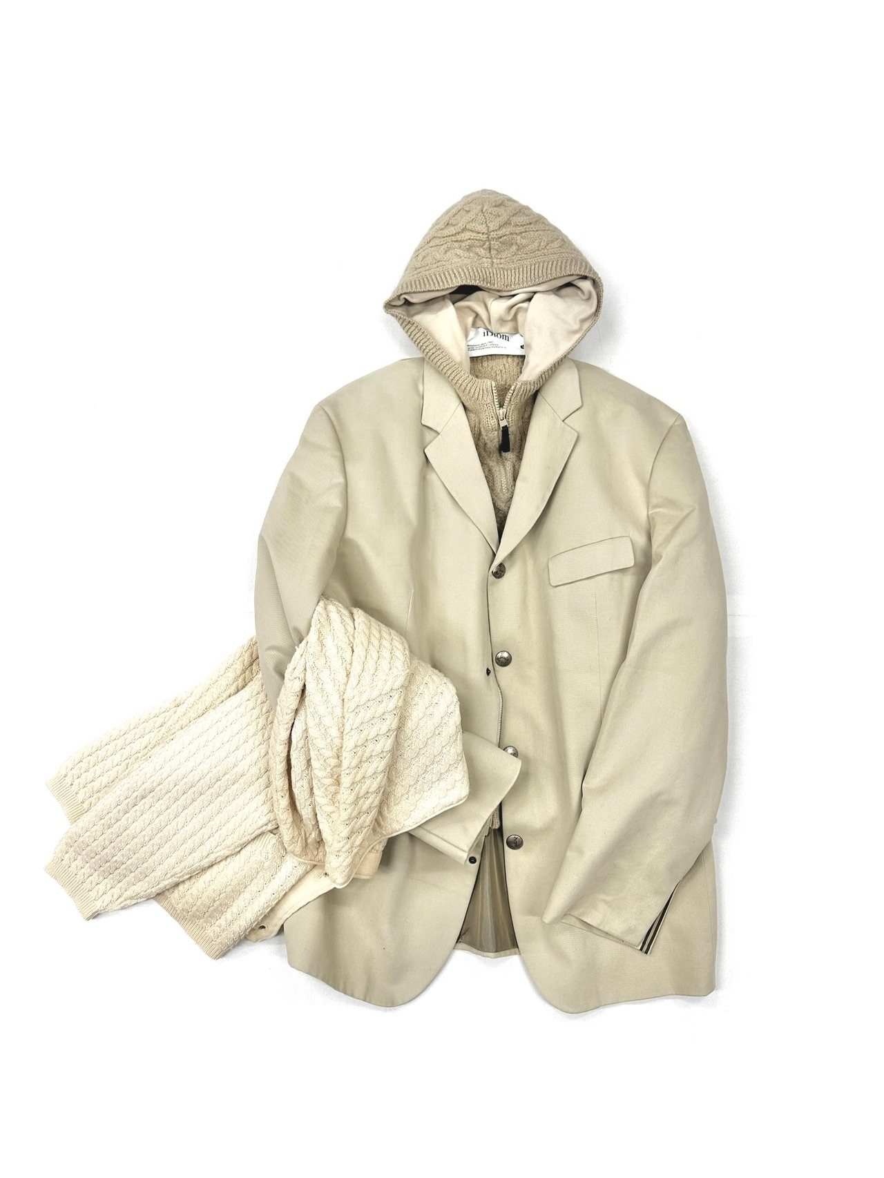 漁師のために編まれたアランニットを叩き台に、現代的なアクティブフーディに作り替えたデザイン。