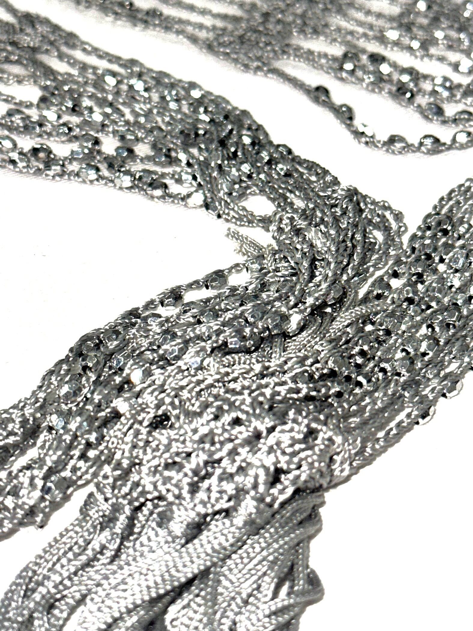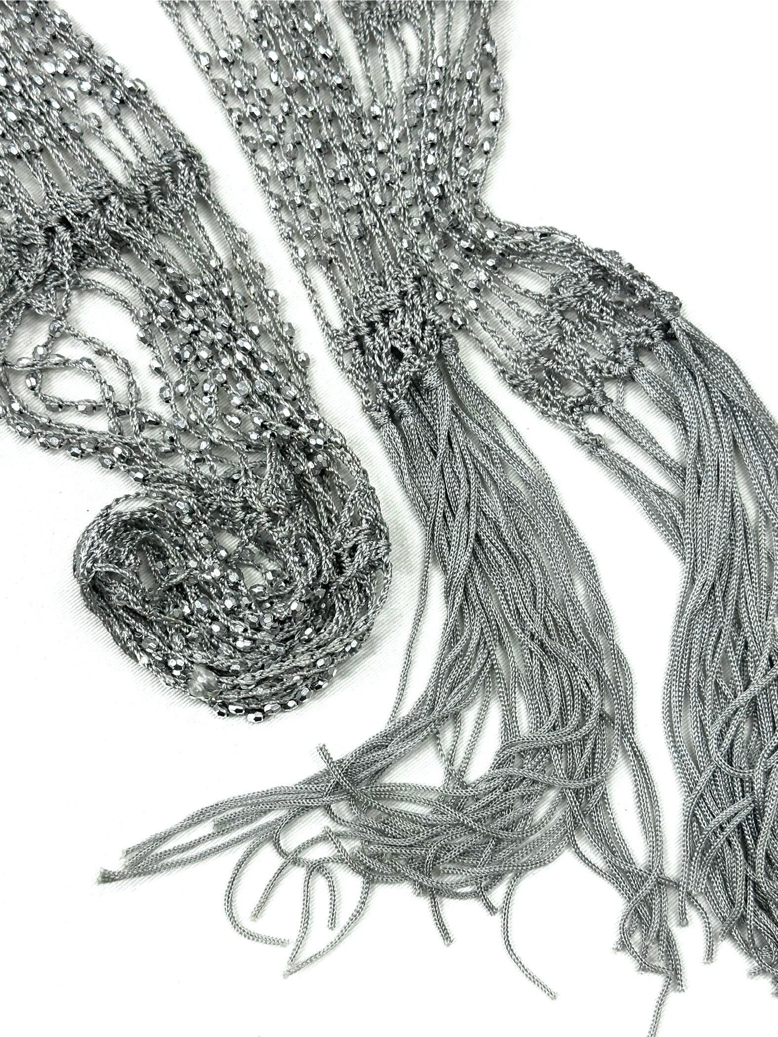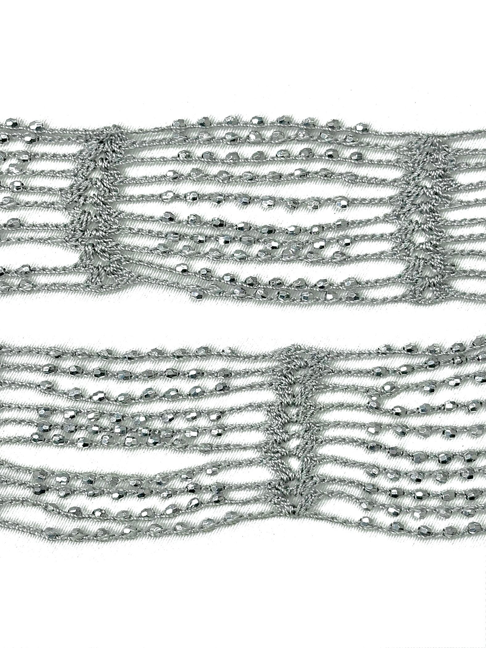 淡いスカイブルーのクロシェニットに、眩く輝くビーズの編み込みです。