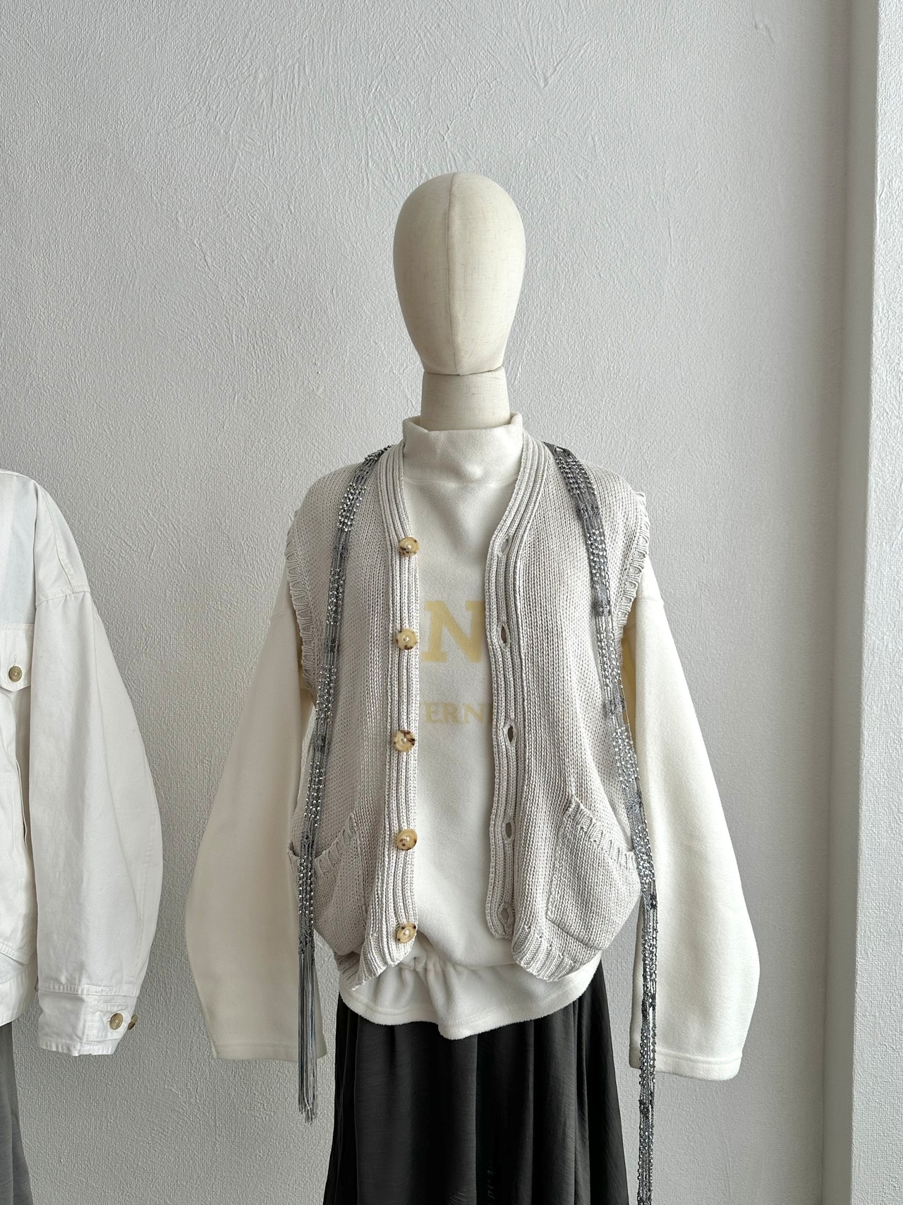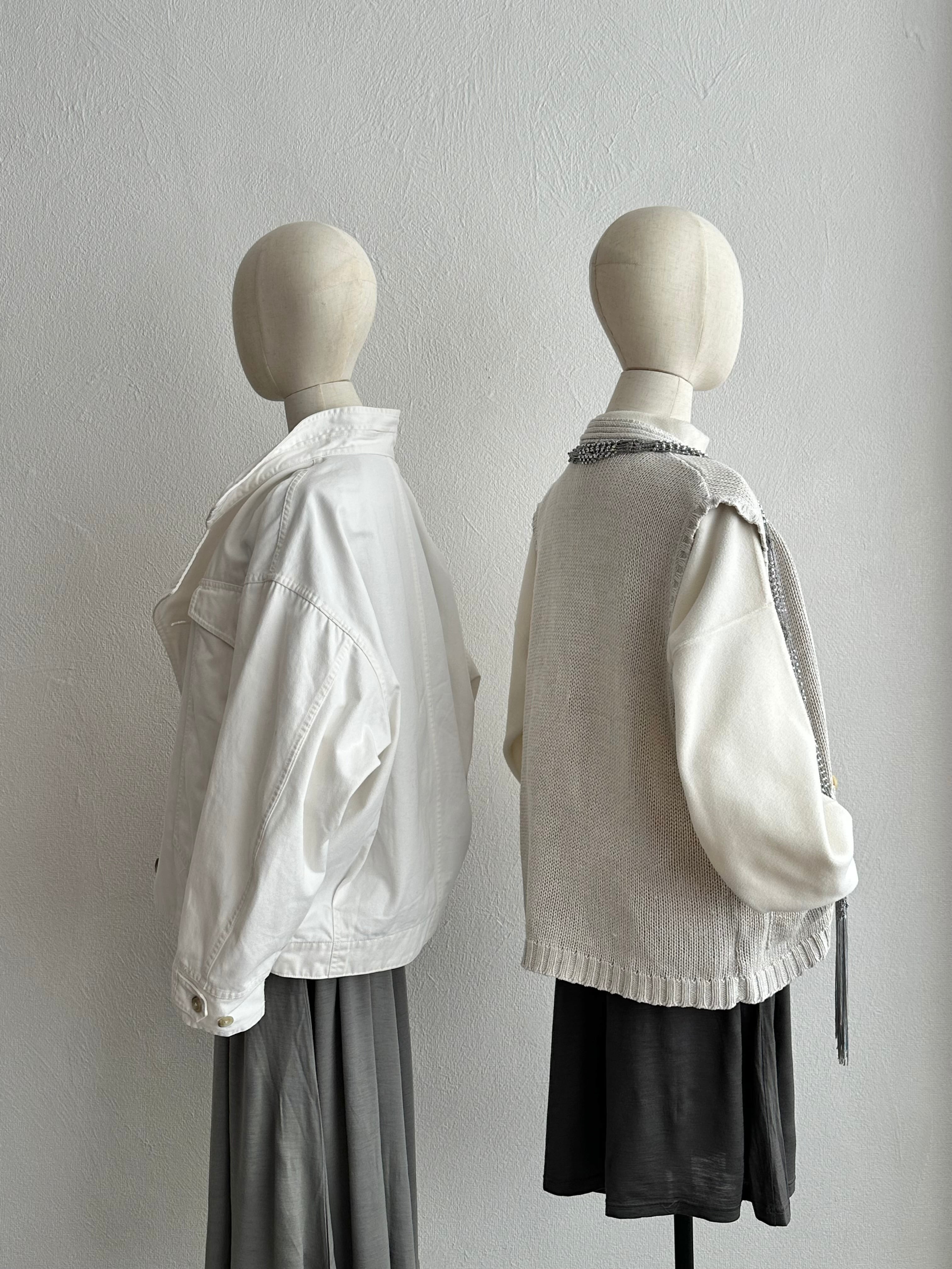 裄丈で丁度袖口を合わせる設計の意図的ドロップショルダーと中途半端なモックネックの組み合わせ。