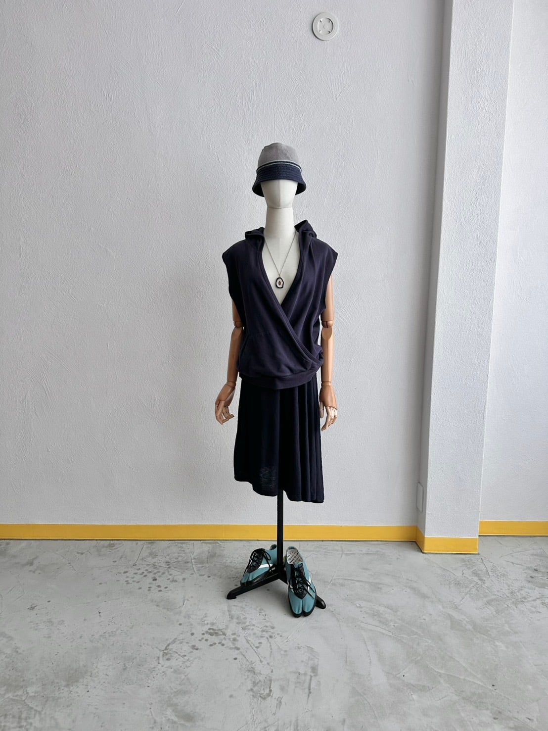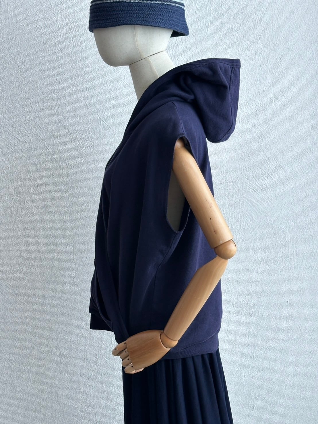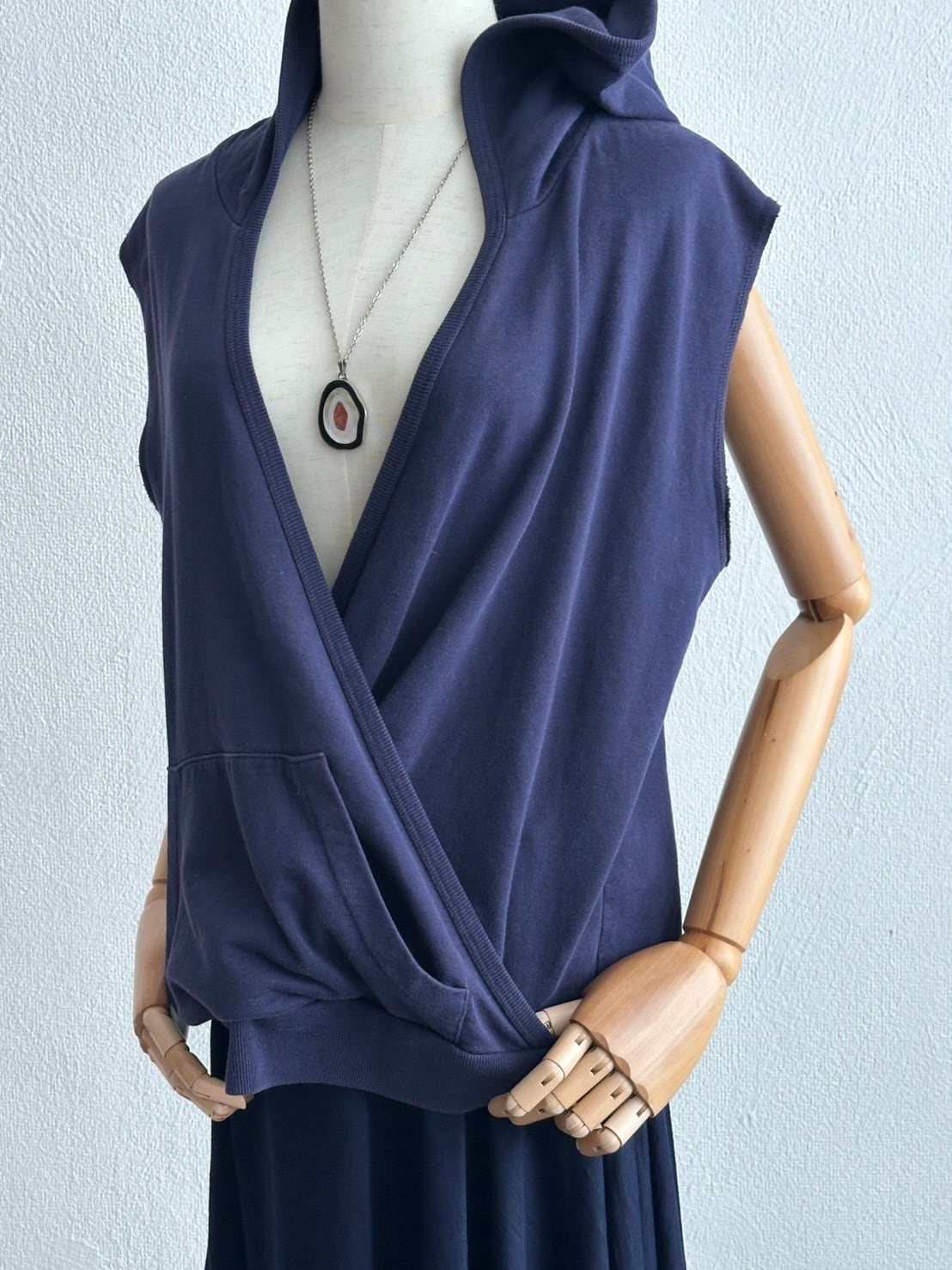 ノースリーブパーカーの少年性みたいなニュアンスと、カシュクールが持つ強烈な女性性のミックス。