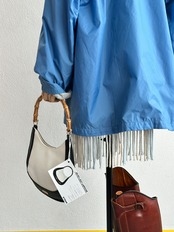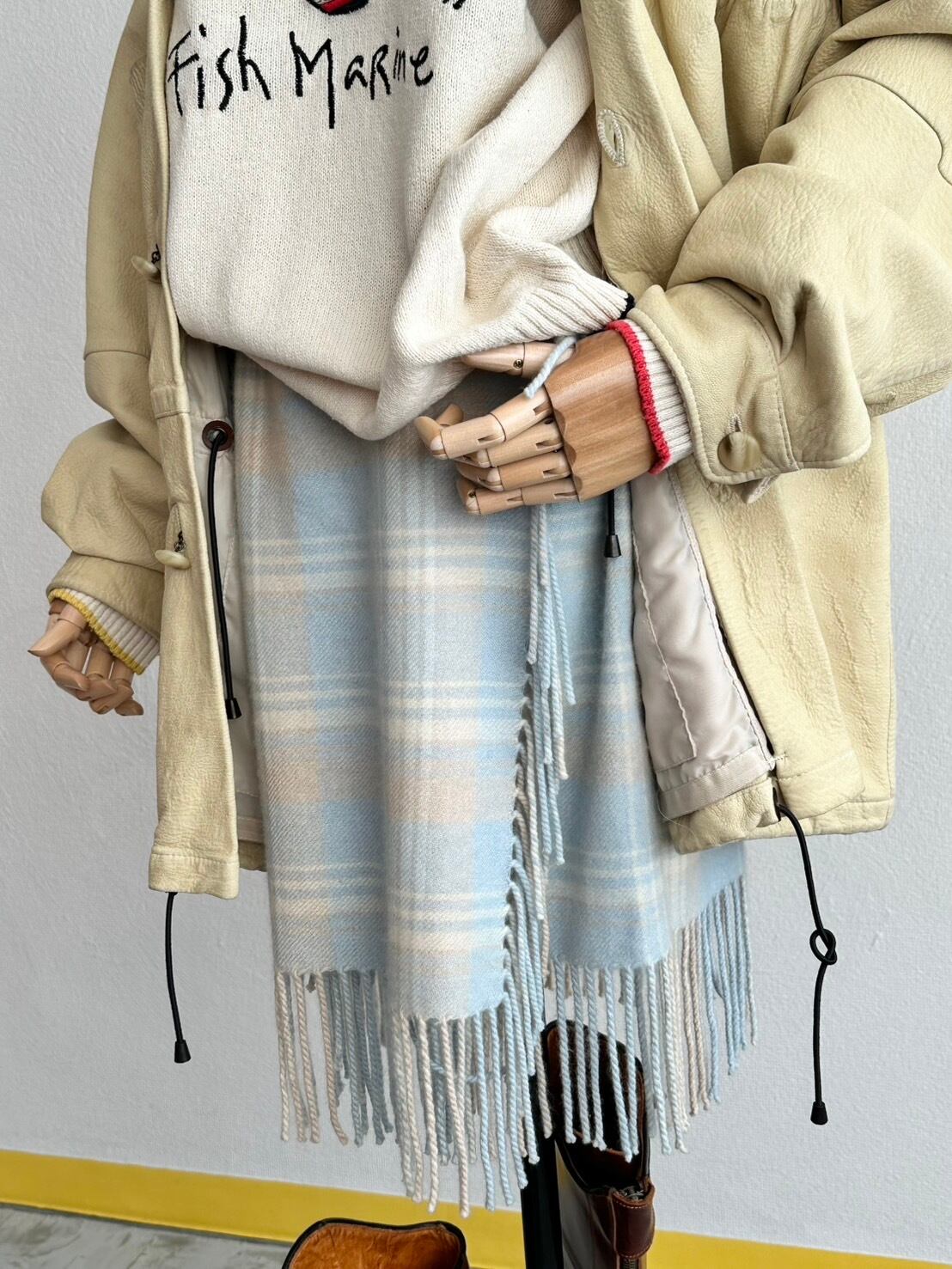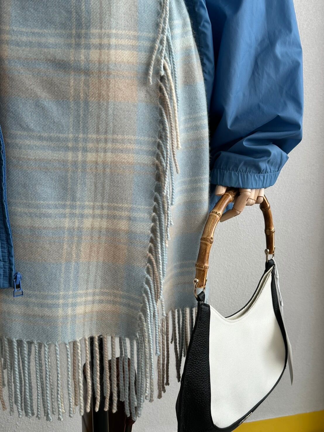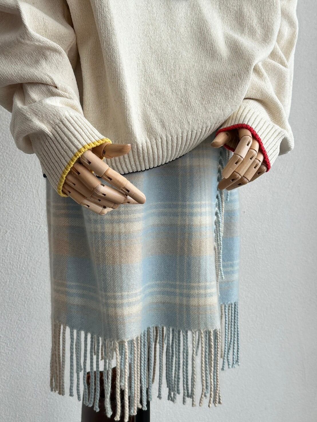 さて、こうしたストレートな“良い生地”、品格のあるタータンチェック、そしてフリンジエッジ……とくれば、デザインの道筋としてはマフラーがリファレンスにあるだろうとは察しが届くところ。