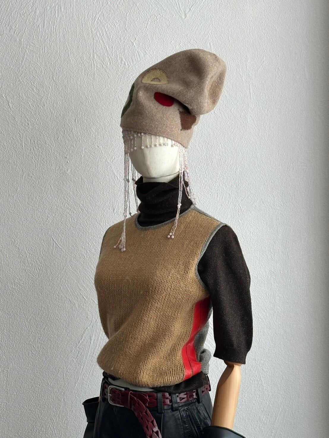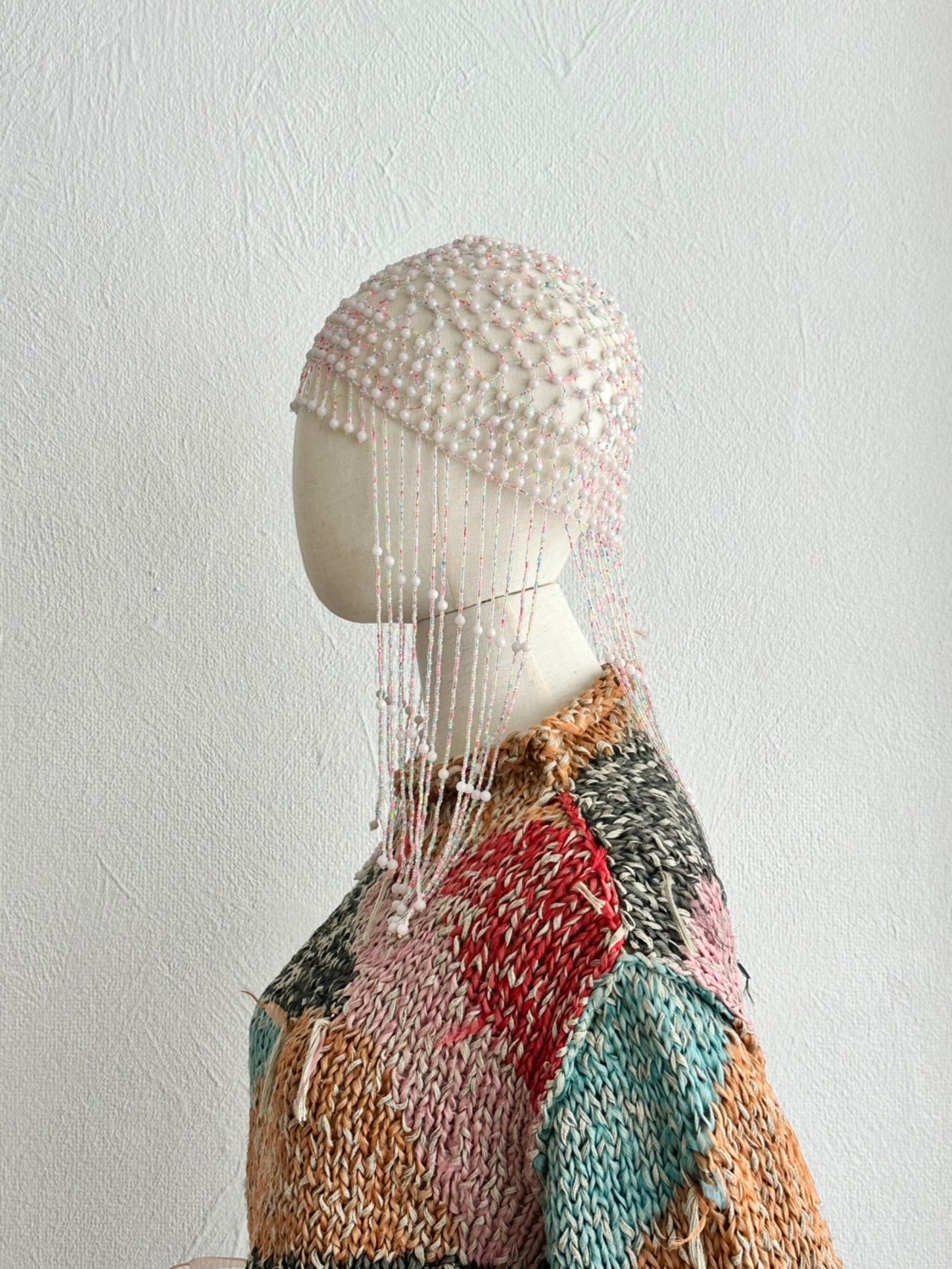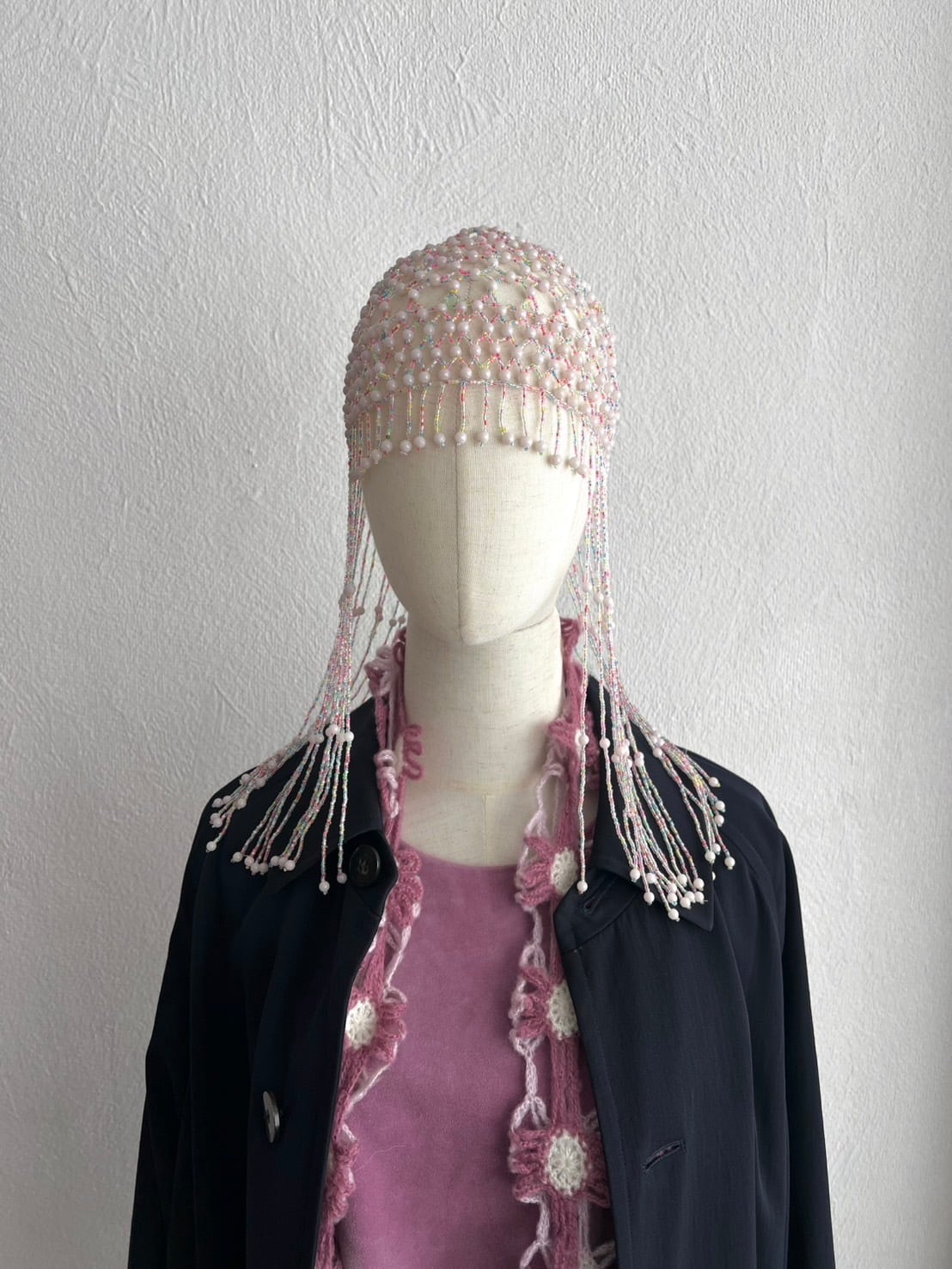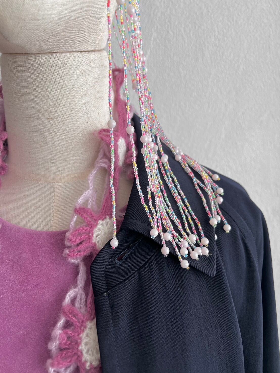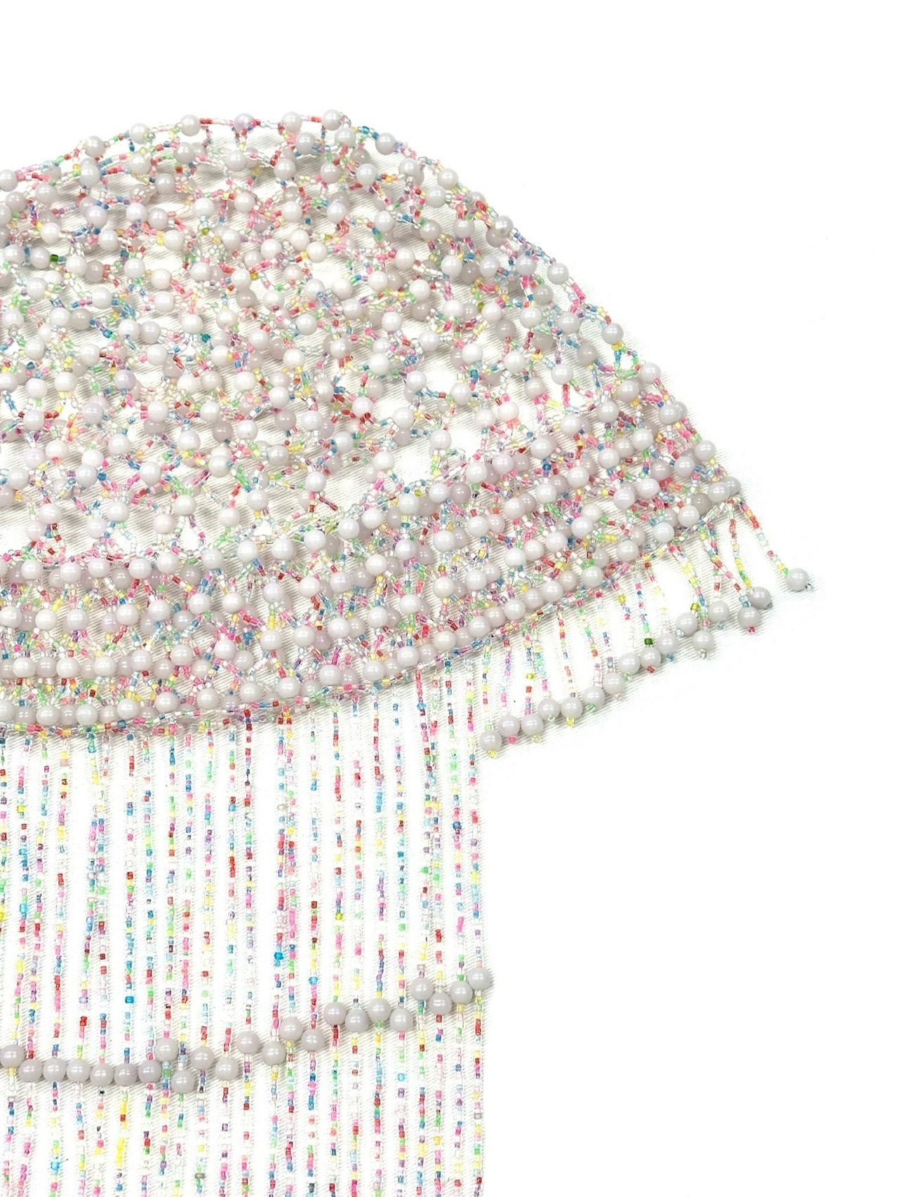 チャリチャリと長く靡いたビーズフリンジ、レイヤードしても厚みの出ない控えめなボリューム感。