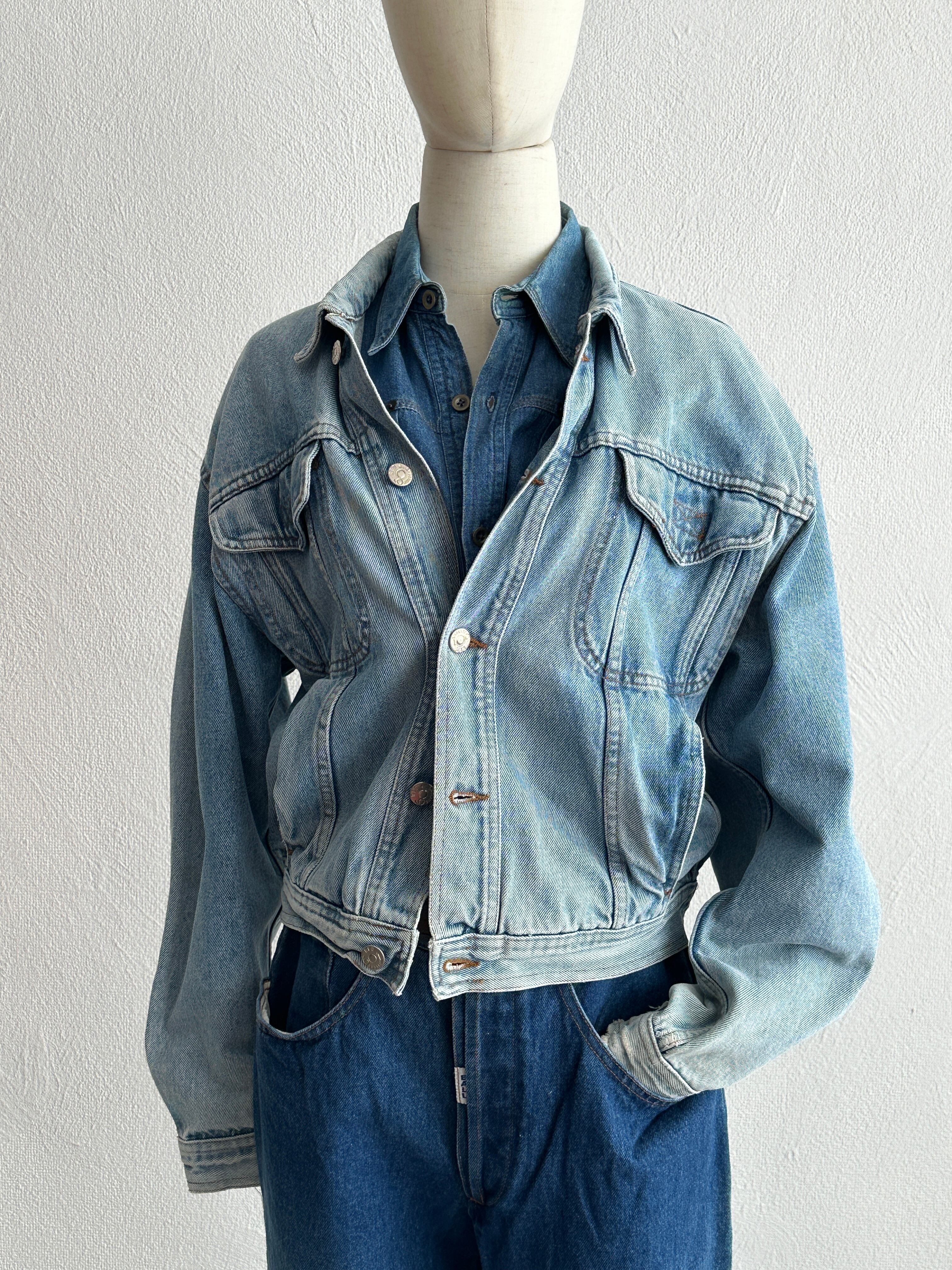 今回はアウターとパンツでデニムを重ねて新感覚のデニムミックスを提案するのですが、ジャケット無しでもフロントにビジュアルポイントがあるし、シルエットにもユニークな変化が付いてる。