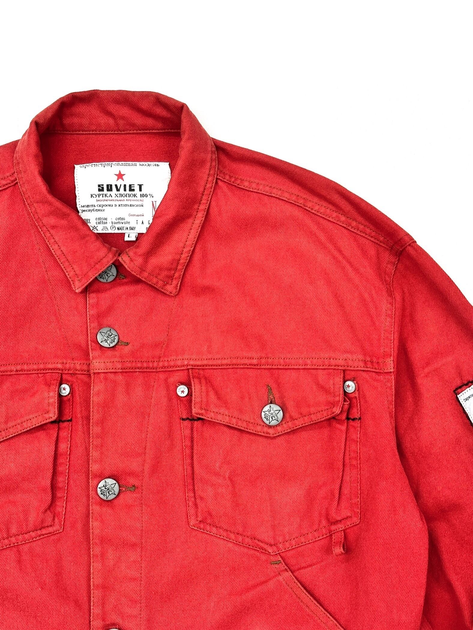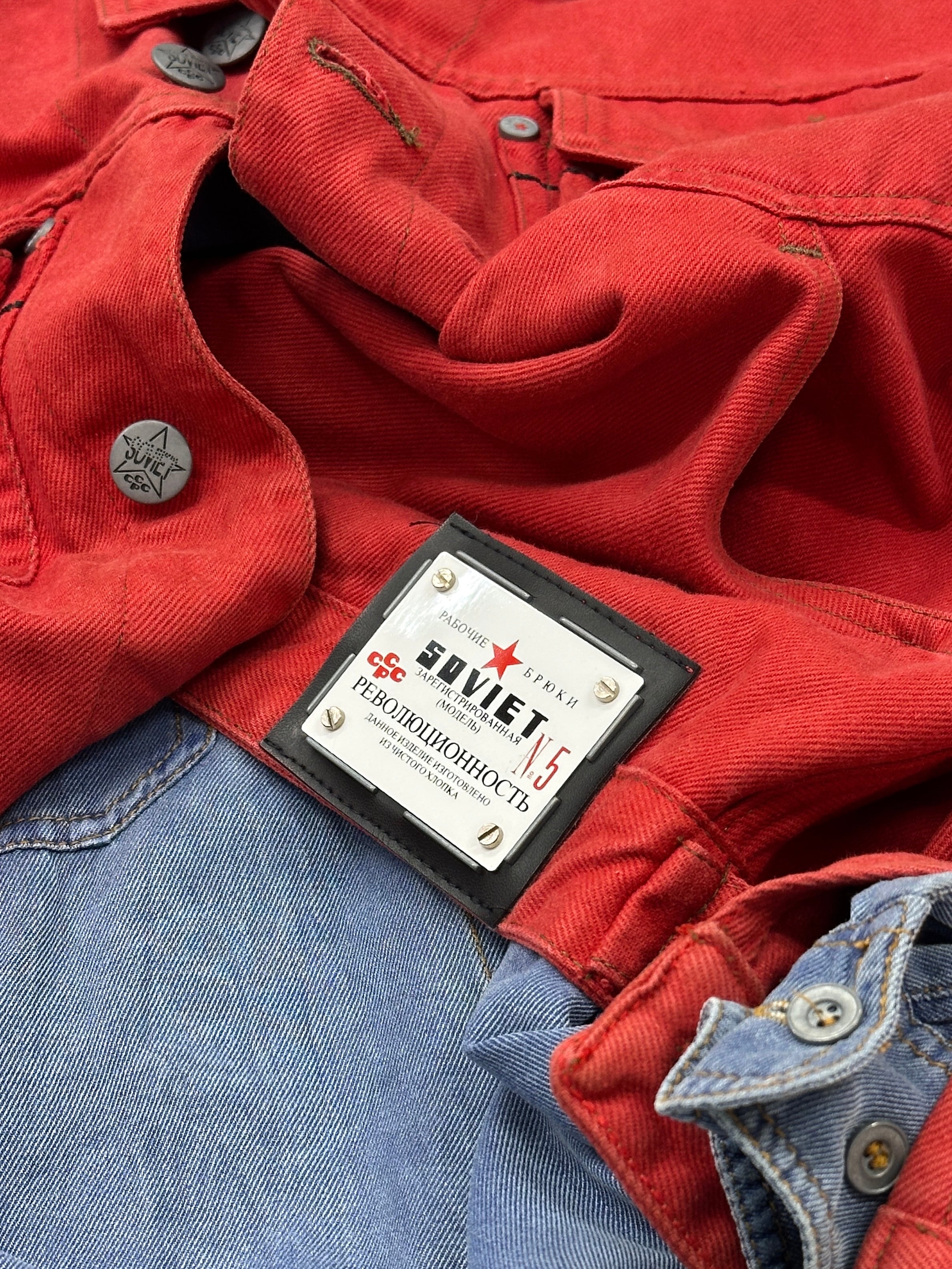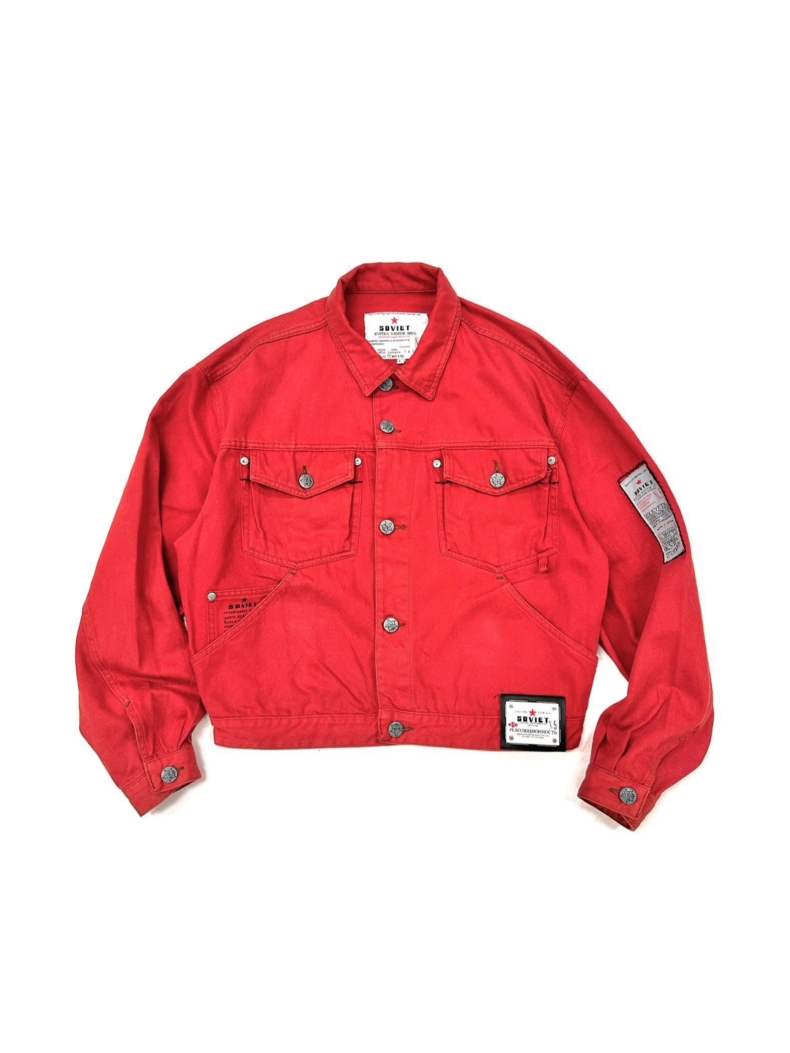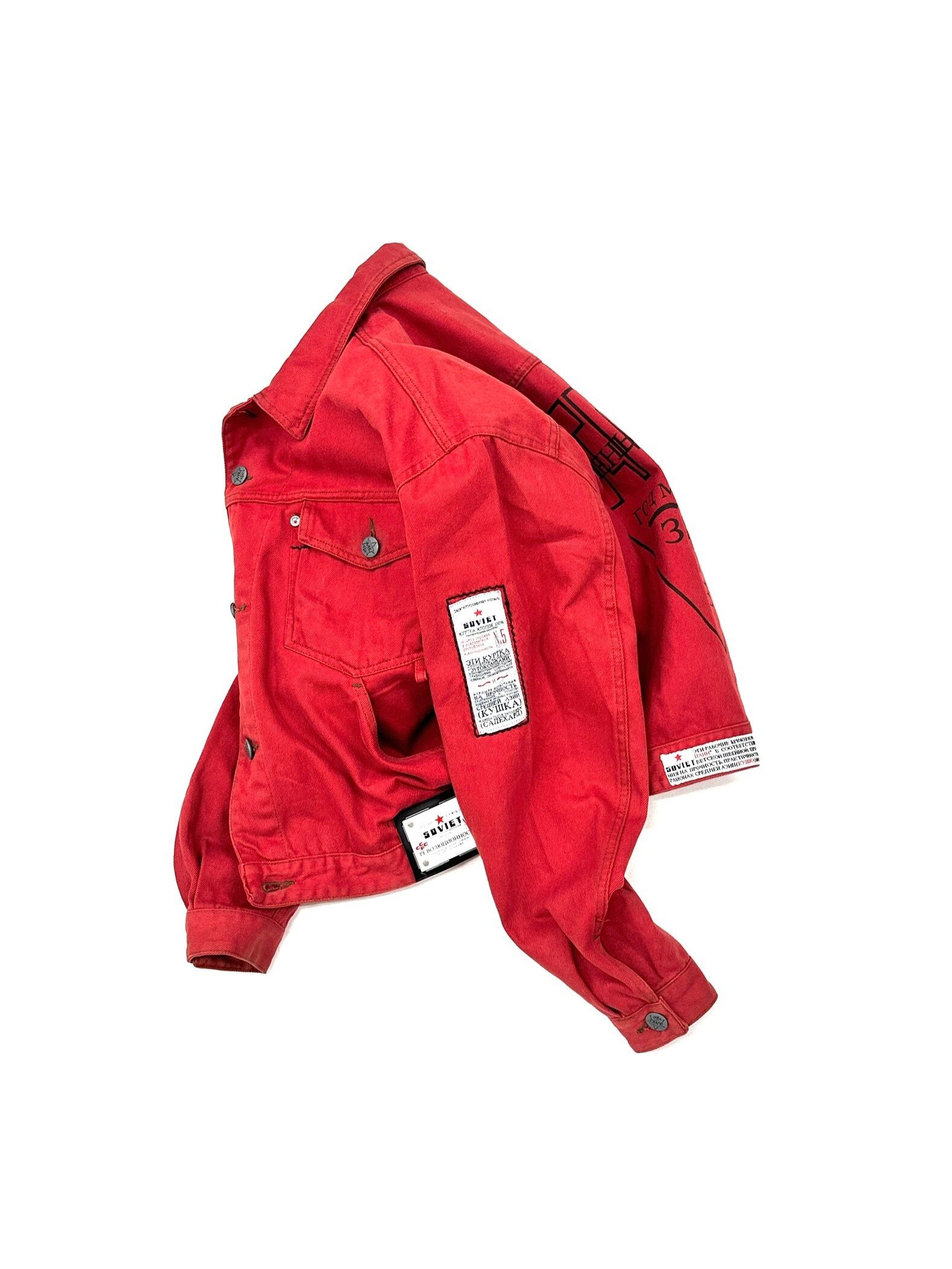真っ赤なGジャンに様々なテキストプリントやオリジナルタグを乗せまくった過積載デザイン。
