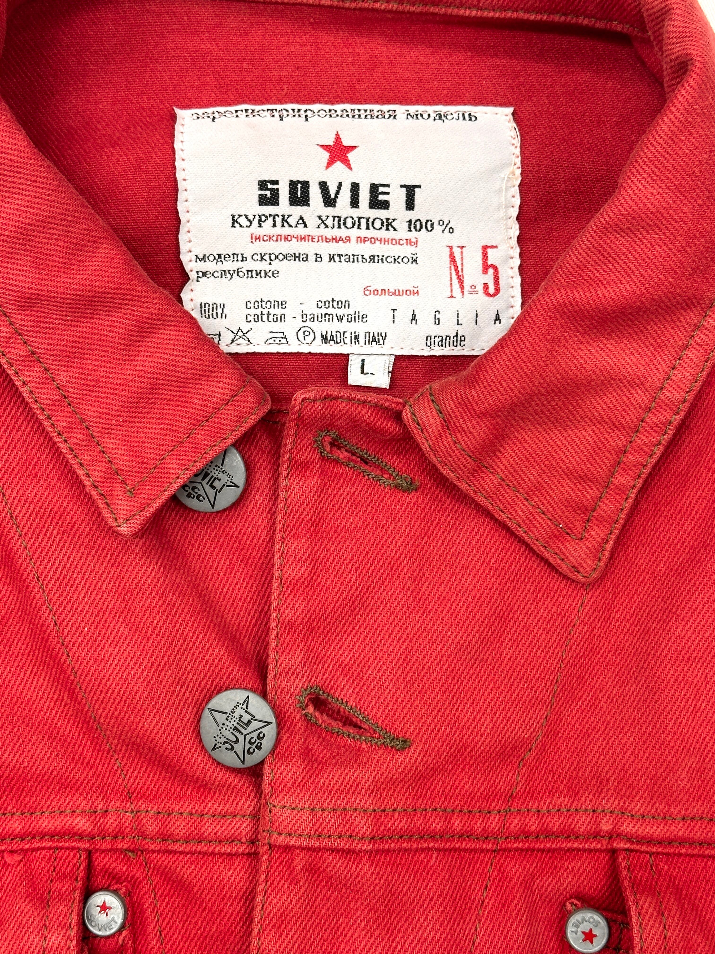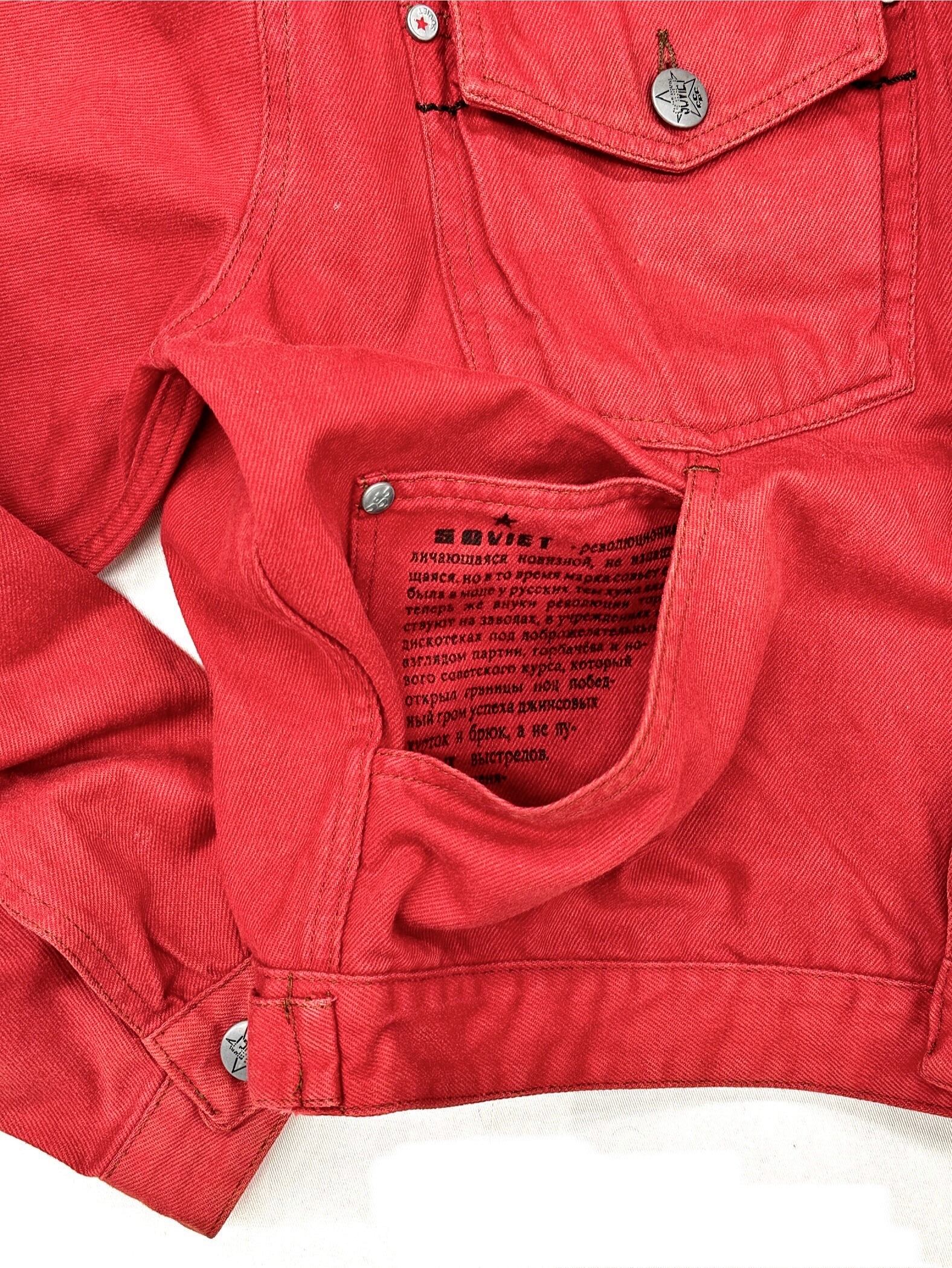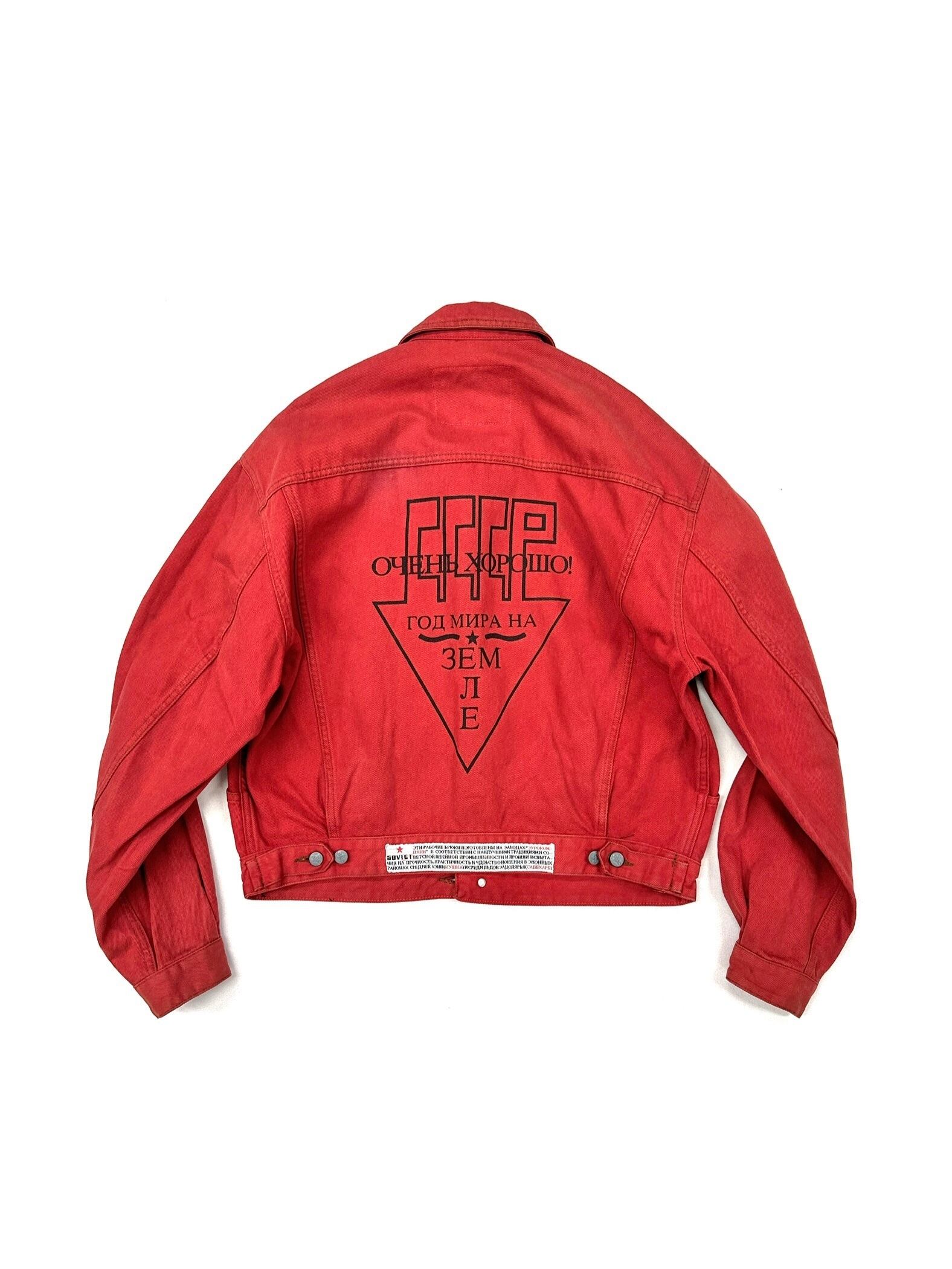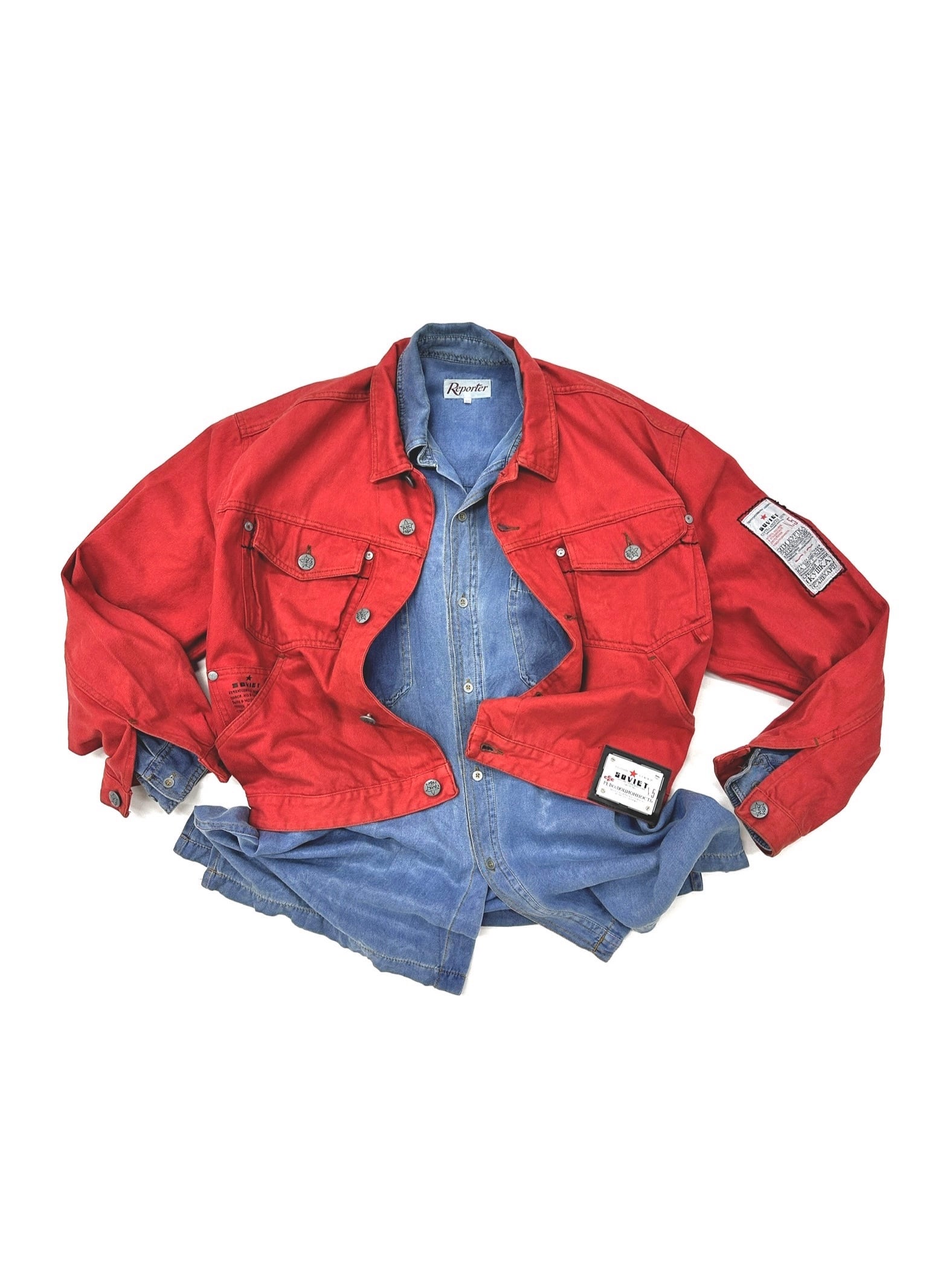 真っ赤なGジャンに様々なテキストプリントやオリジナルタグを乗せまくった過積載デザイン。
