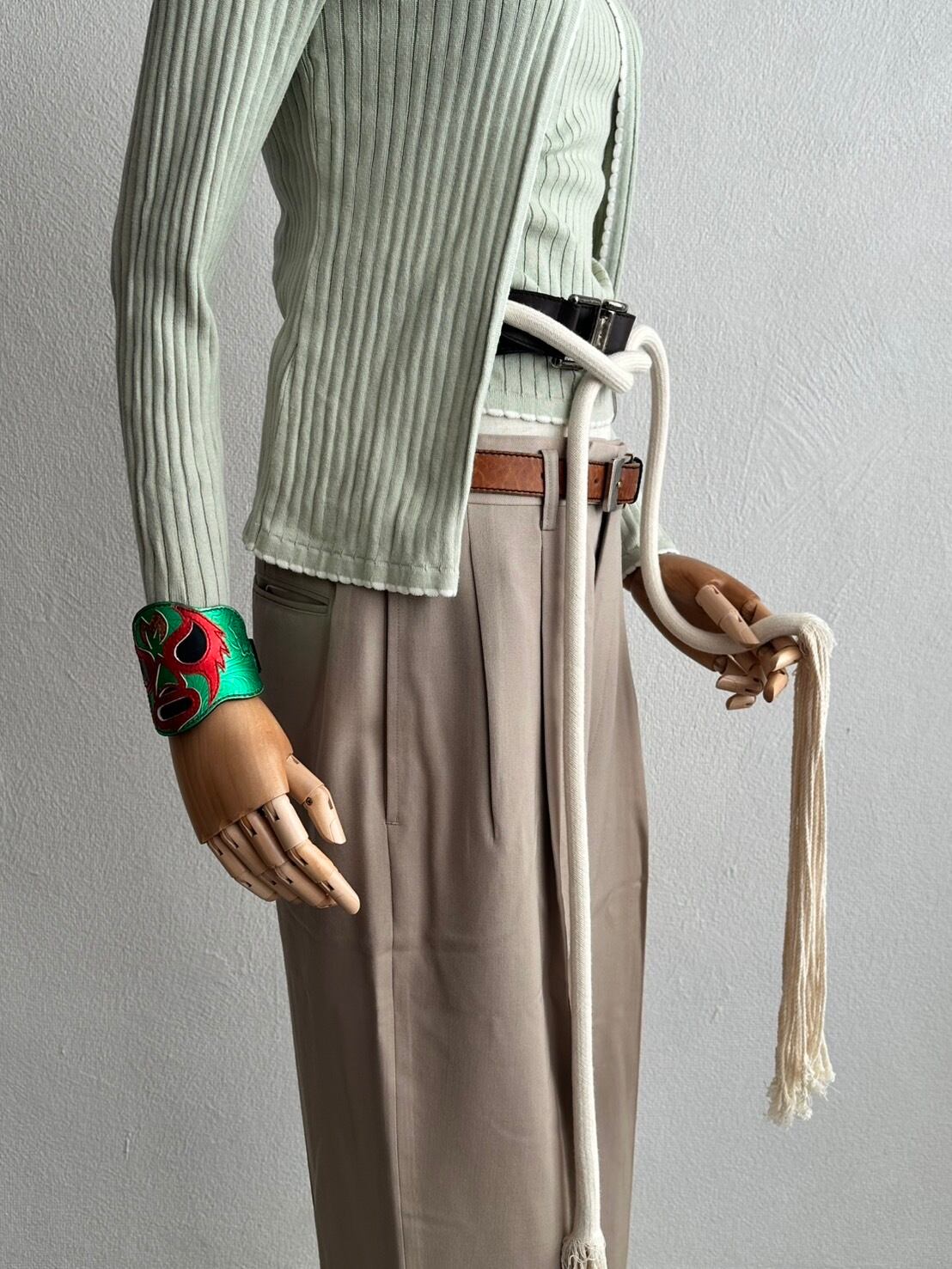 勿論、レザーもロープも両方巻いて超異素材でのベルト・レイヤードを楽しむってのも最高にファッショナブルです。