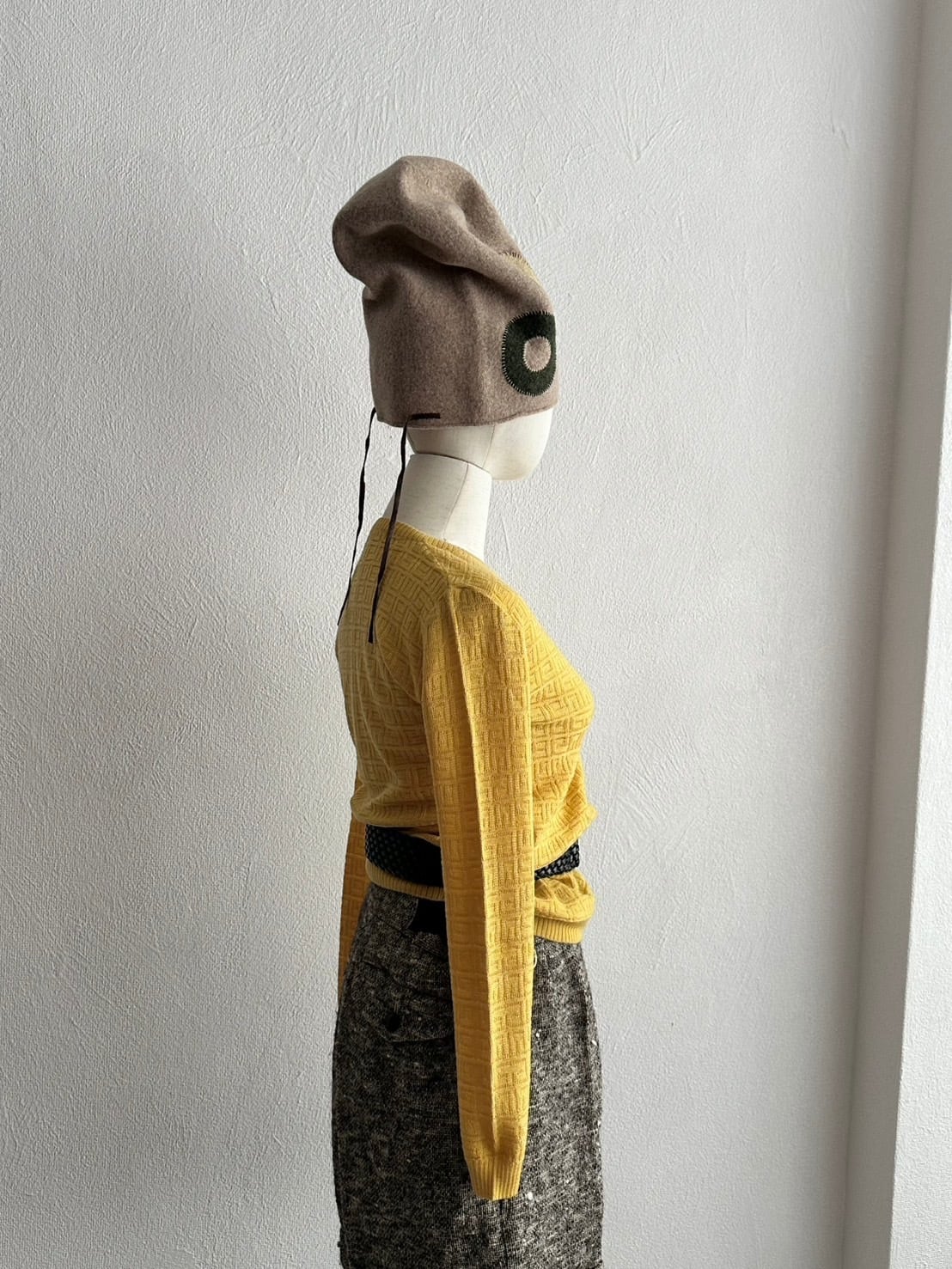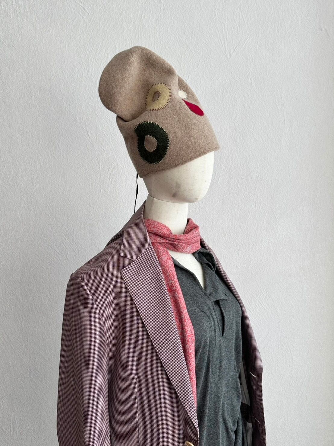 フェルトであるという点と実際の頭の高さより高いバランスで設計されている点から山高帽子と定義付けたいところだけれど、ブリムは無い。