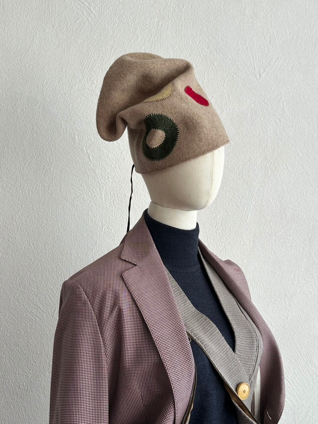 淡いピンクベージュのフェルトボディに、手縫いの円形パッチワーク。