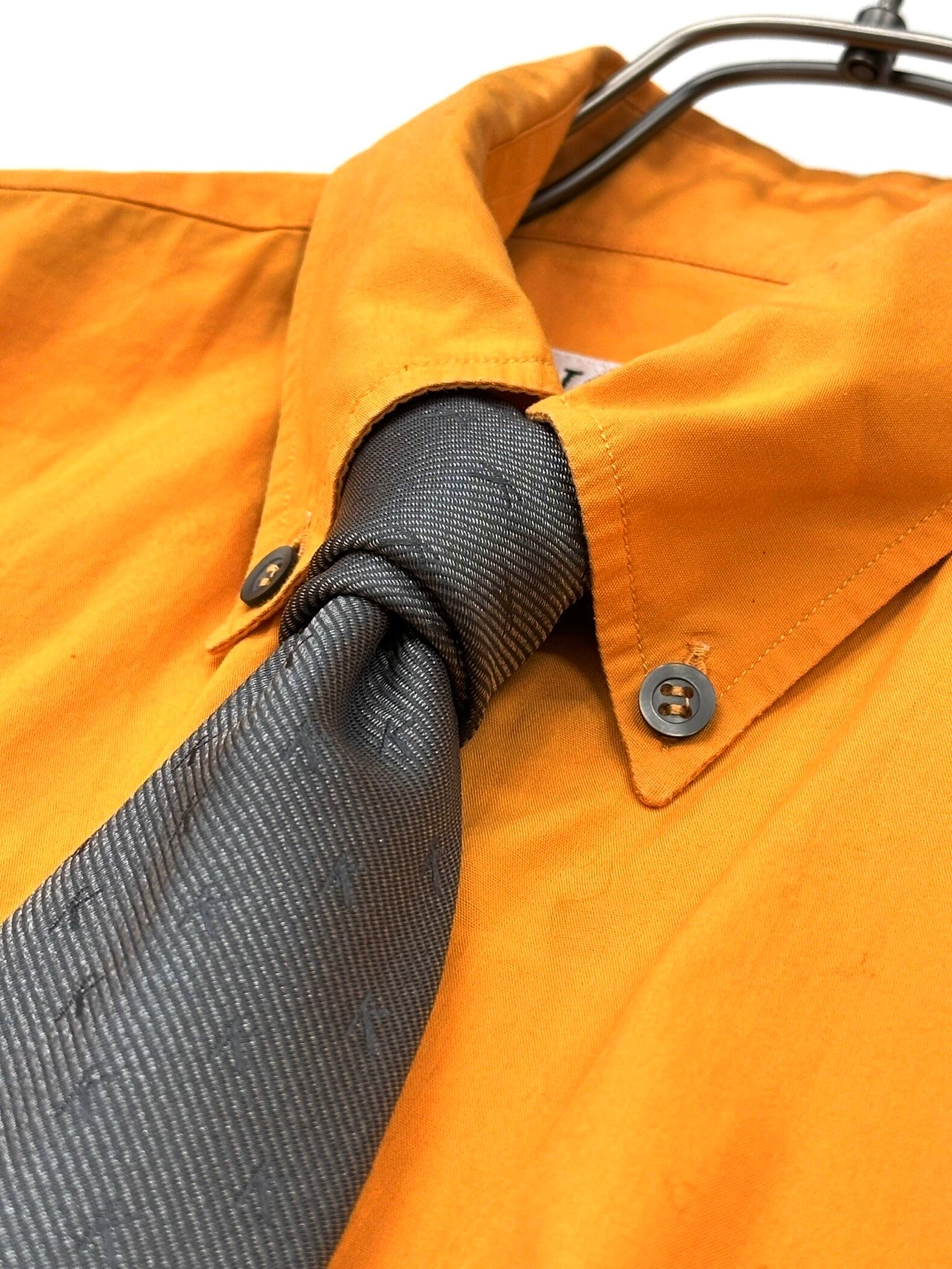 このテキスタイルデザインが、ネクタイの印象を「グレー」と「シルバー」の中間に移動させてる。