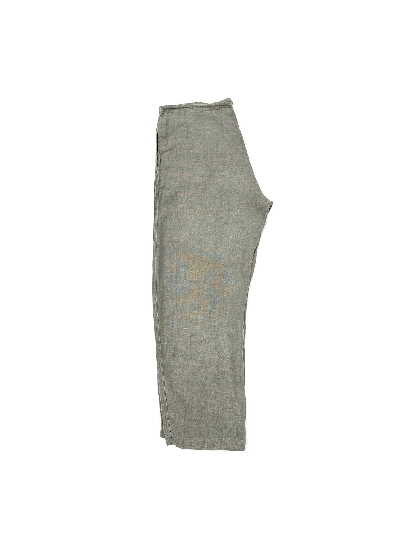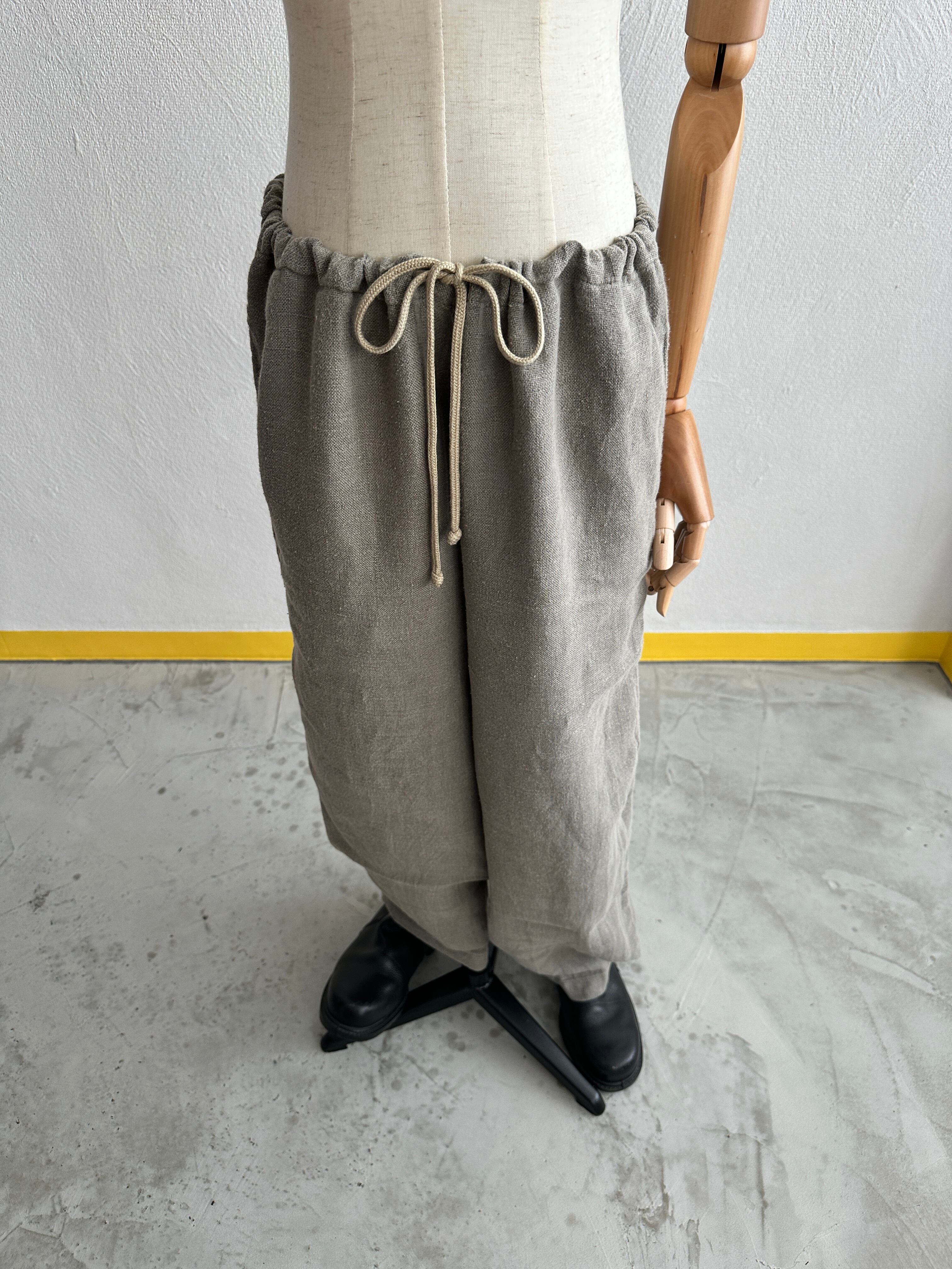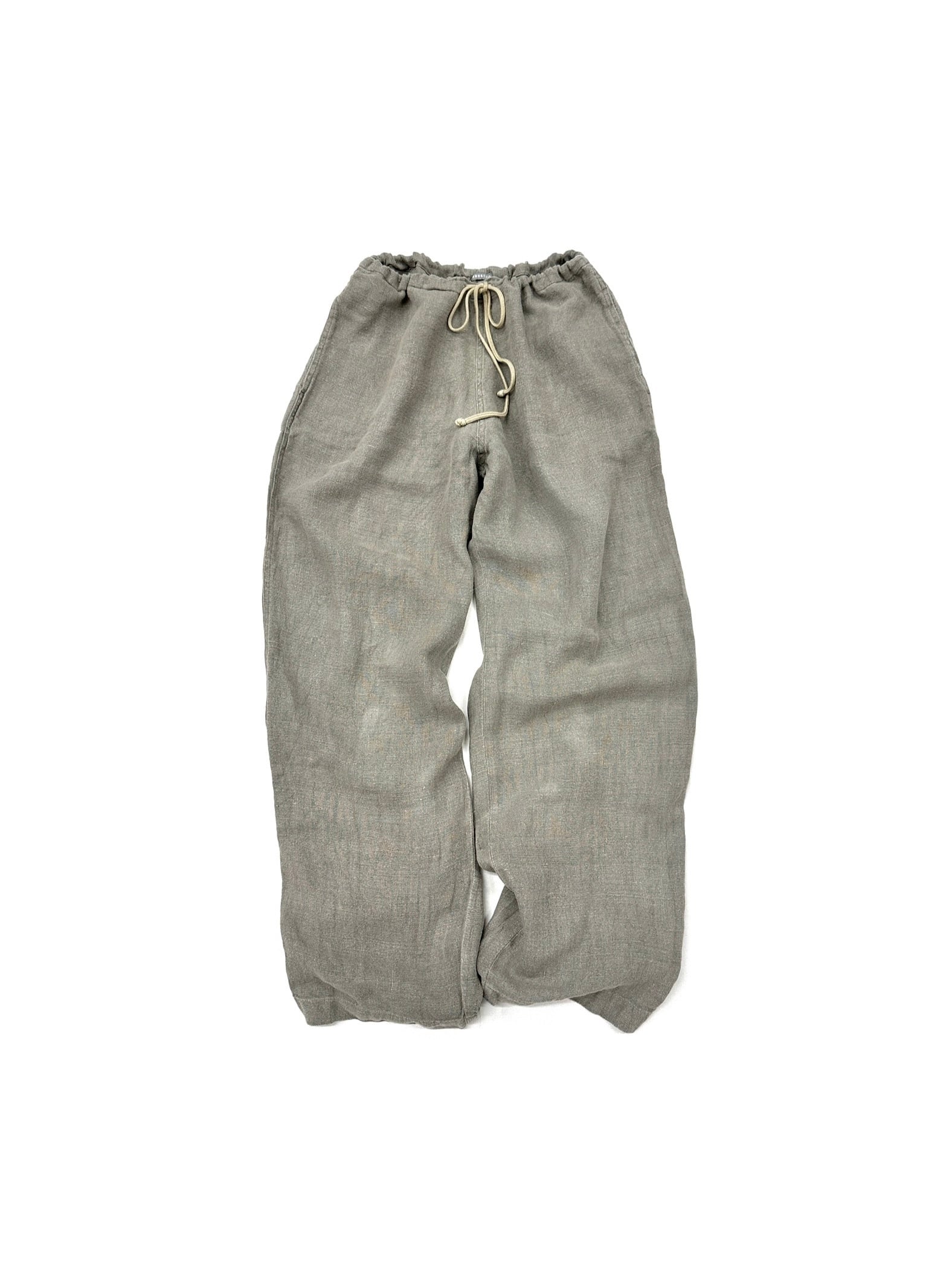 ドレープを狙ったオーバーサイズのリネンパンツは現代デザイナーズが好んで使うフォーマットですが、パッと思い付く他のどれとも違う、押し付けがましくない退廃情緒。