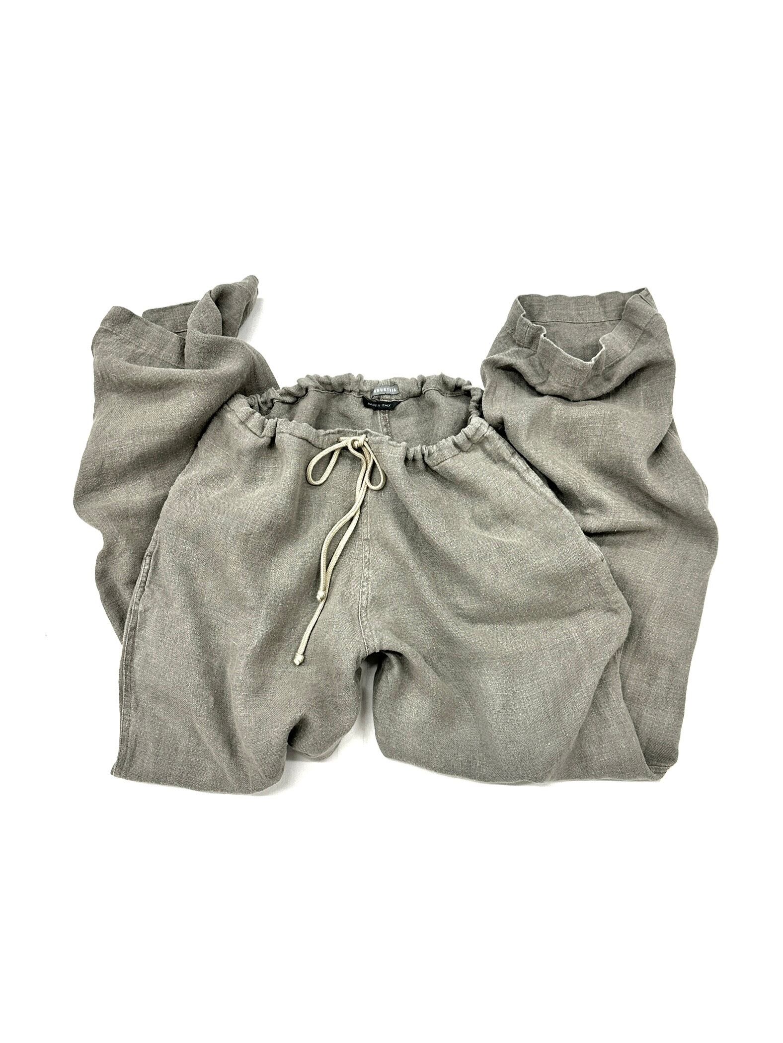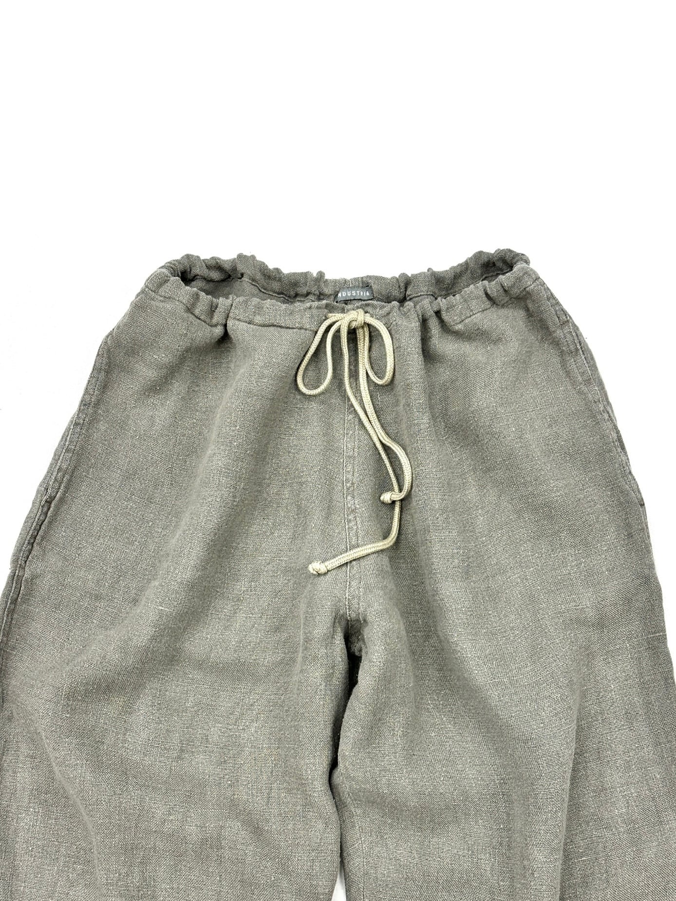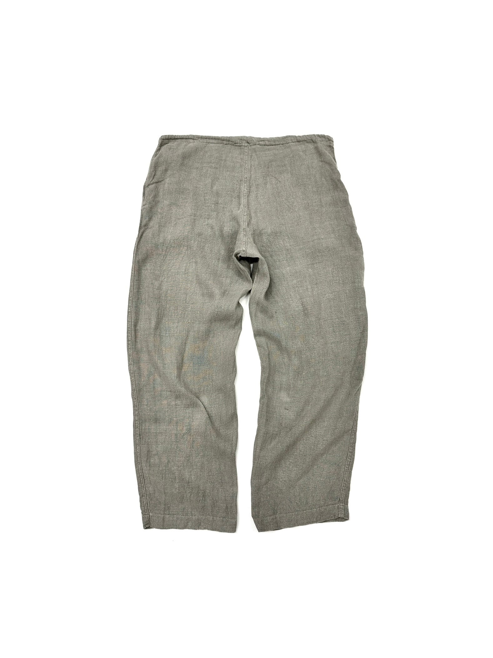 ドレープを狙ったオーバーサイズのリネンパンツは現代デザイナーズが好んで使うフォーマットですが、パッと思い付く他のどれとも違う、押し付けがましくない退廃情緒。