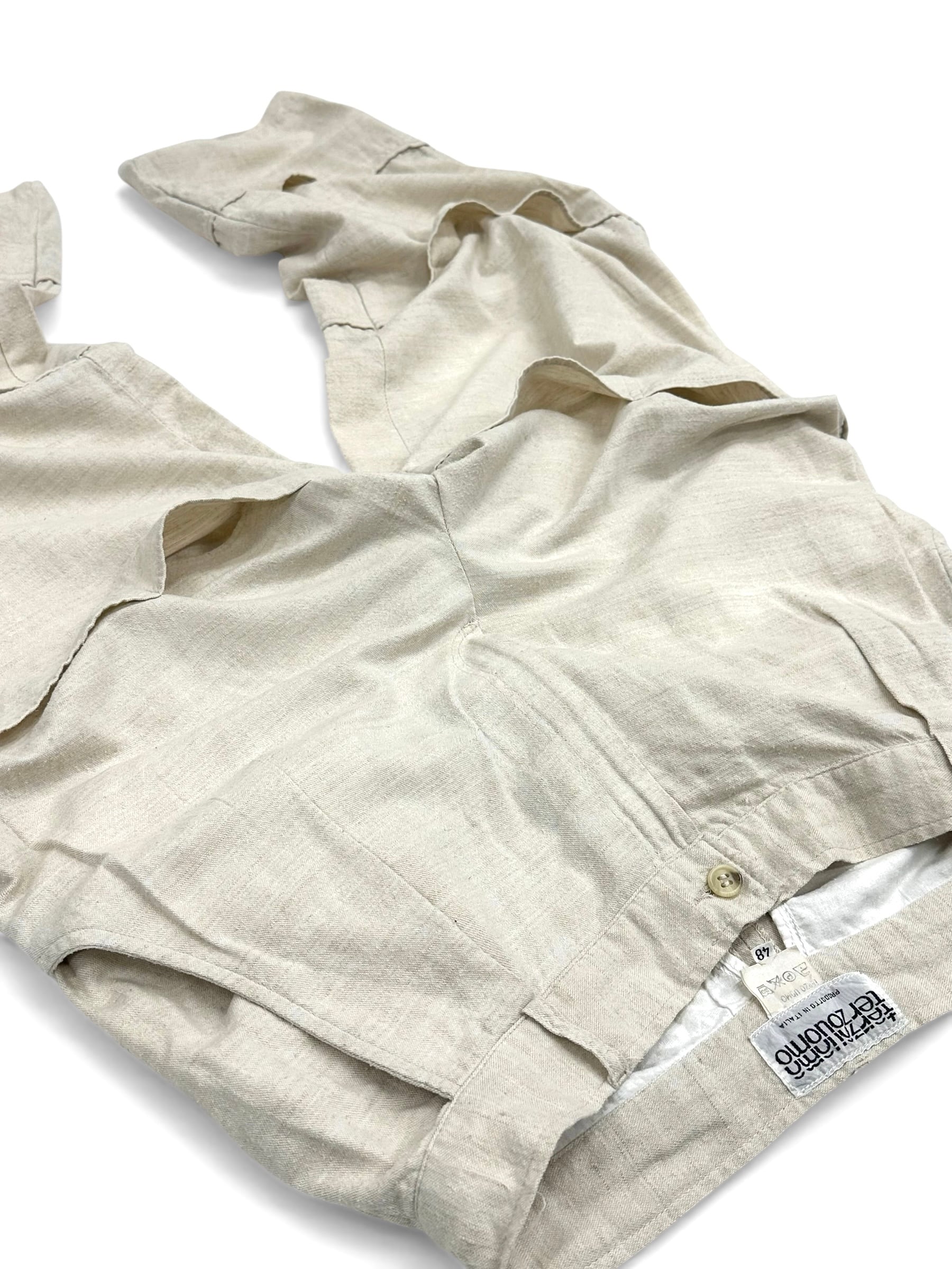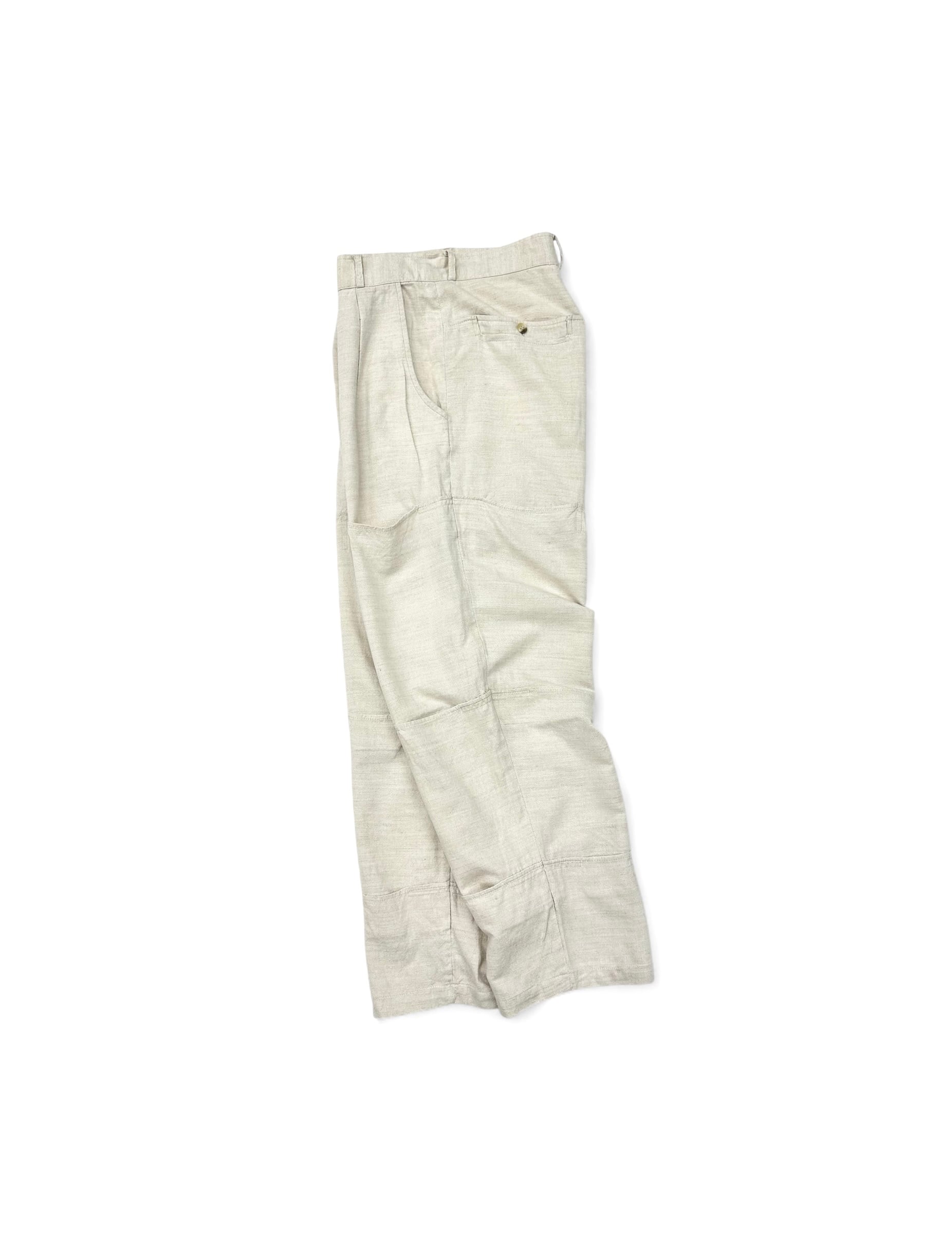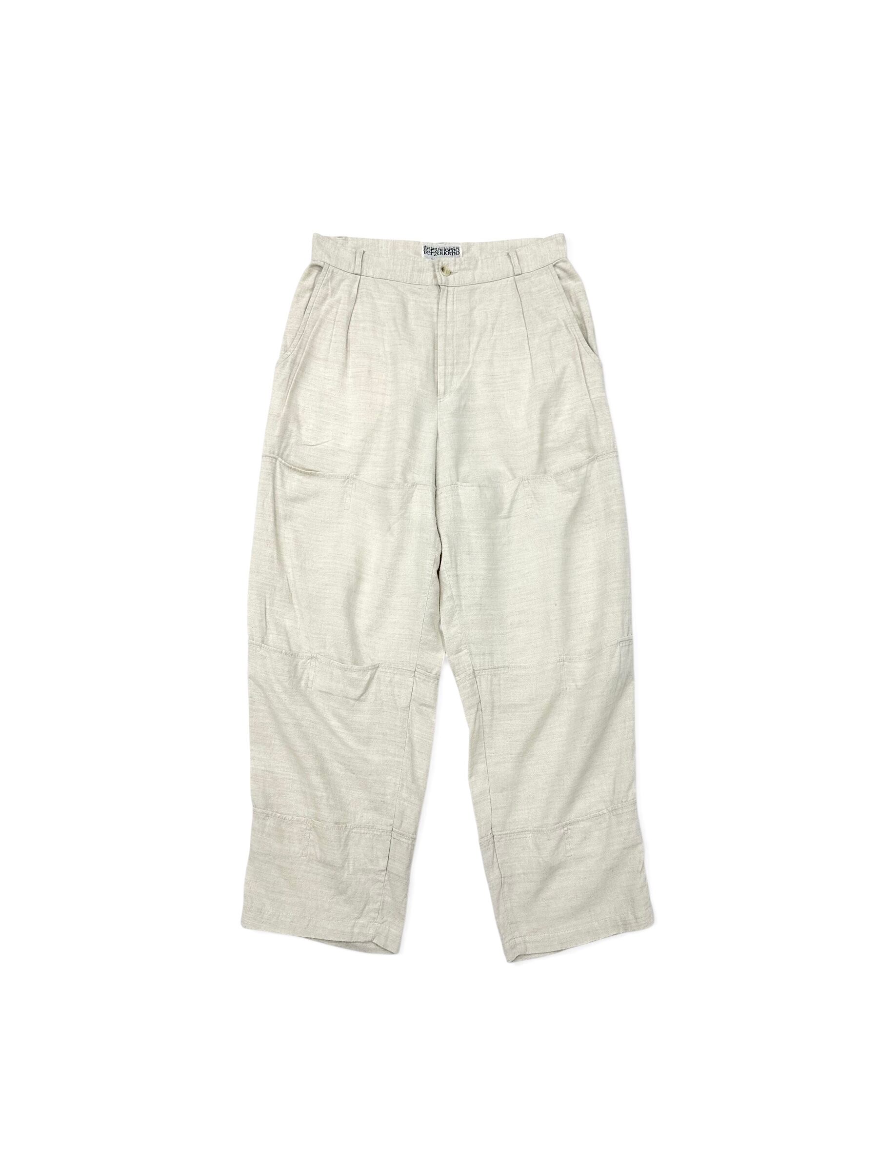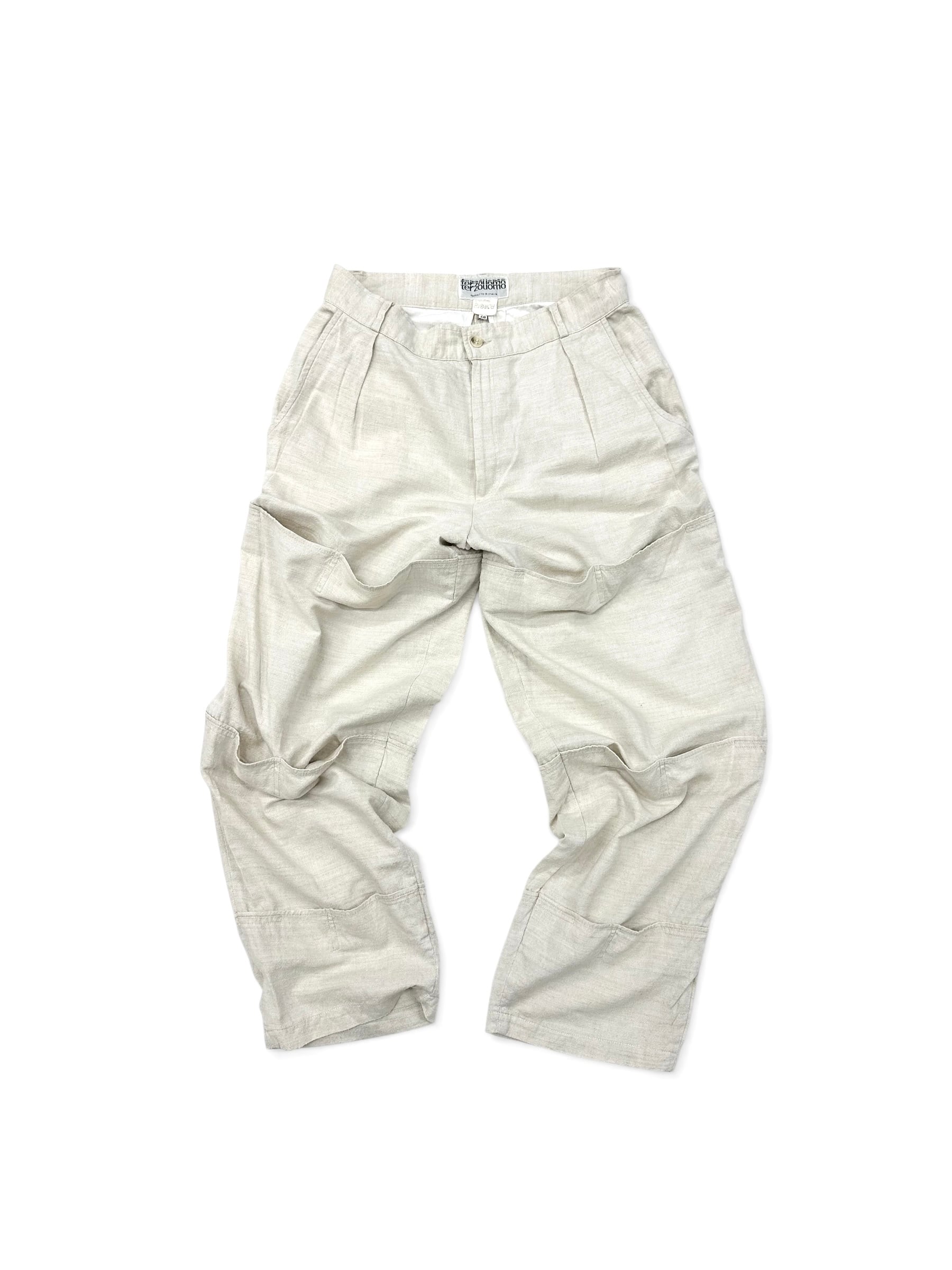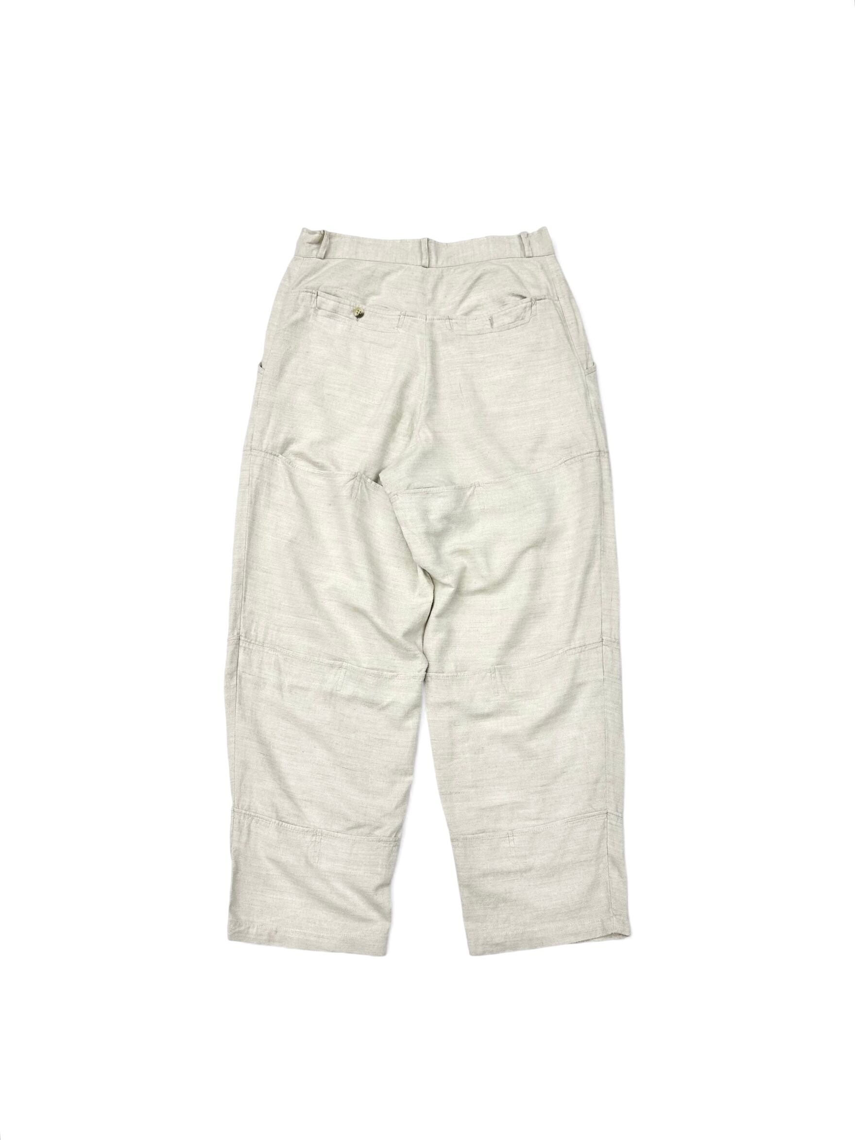 イタリアン・カジュアルを象徴するホワイトリネン(レーヨン混ぜ)のパンツだと言うのに超トリッキーなデザイン。