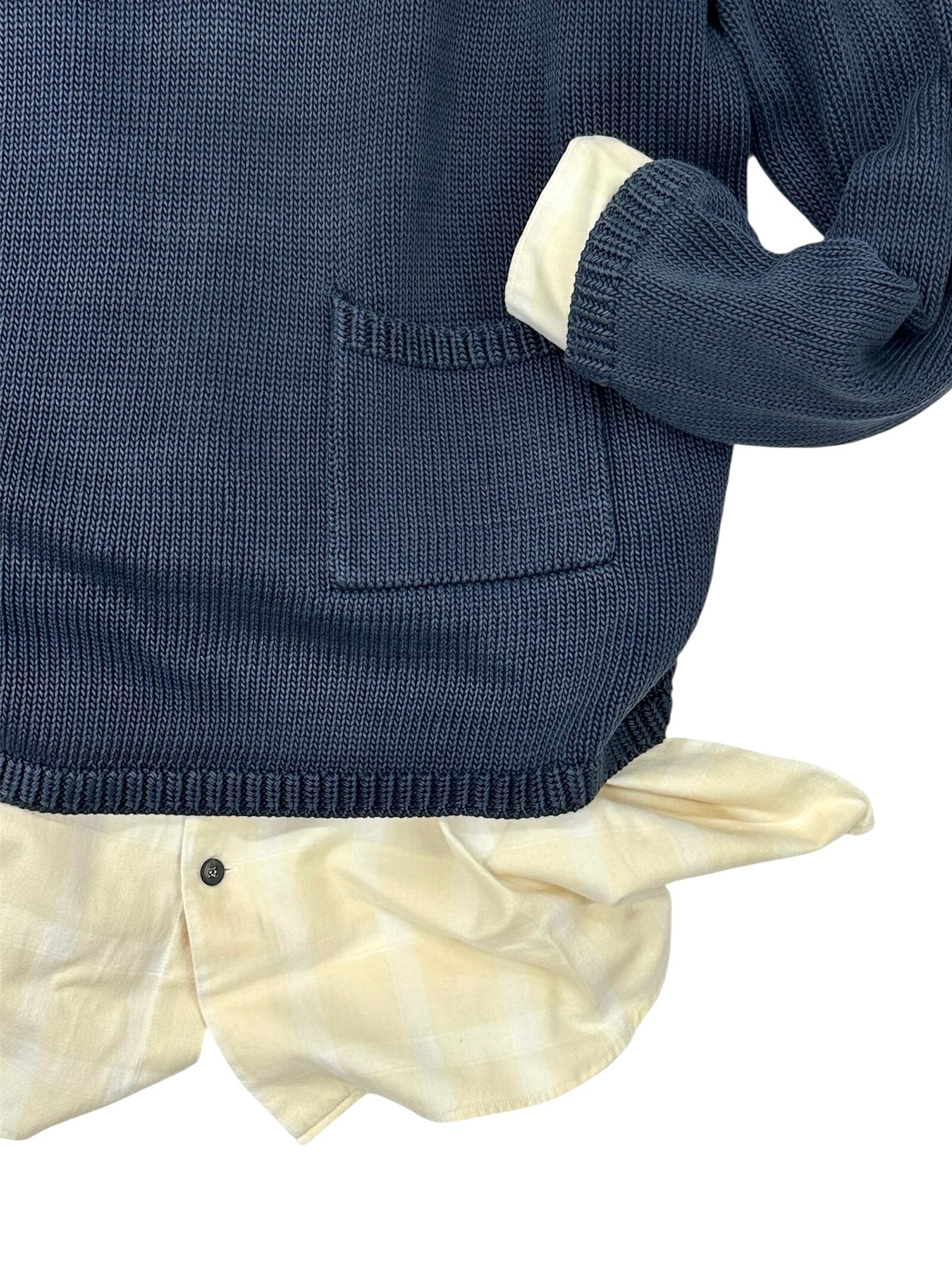 太い糸でのミドルゲージ、心地良い重み、フラットな袖付けと正方形に近いボックスボディ。