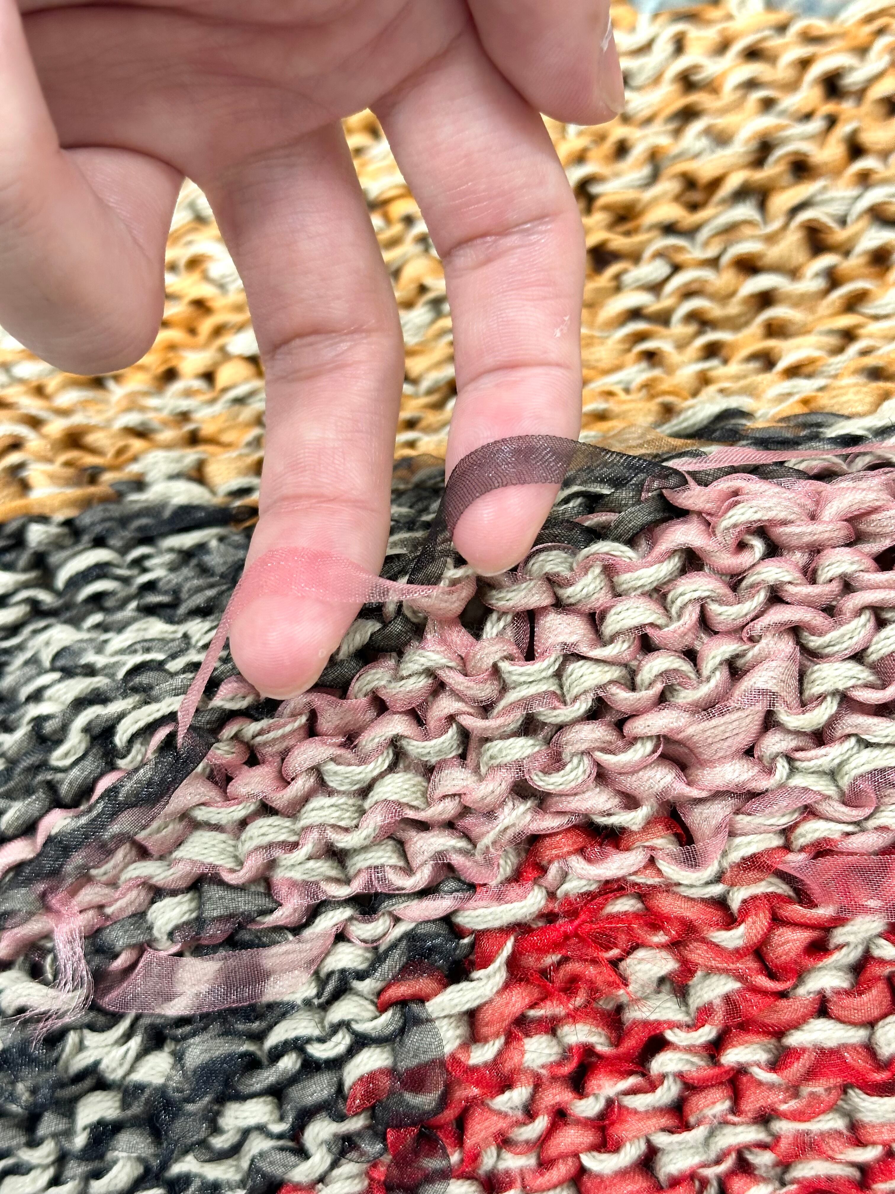 コットン部分の色は一定で、ナイロンリボンの色をチマチマと変えることで抽象柄を作ったデザイン。