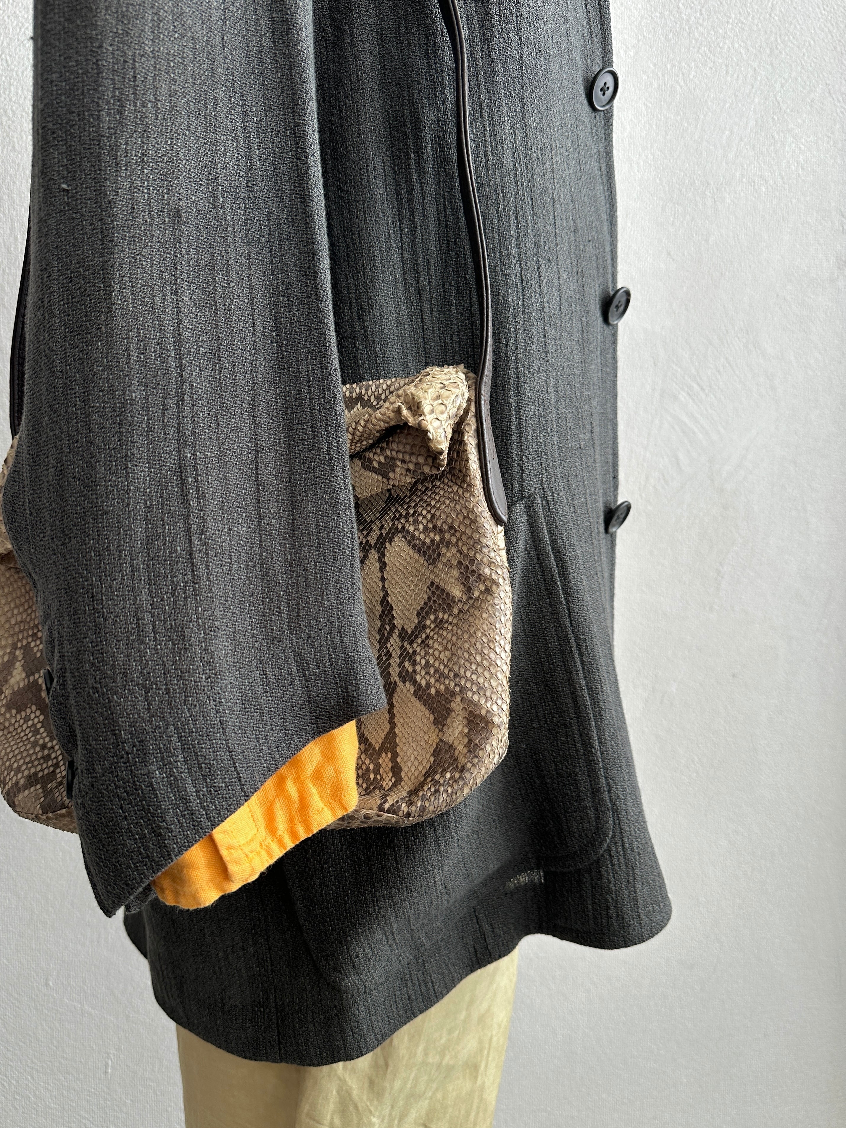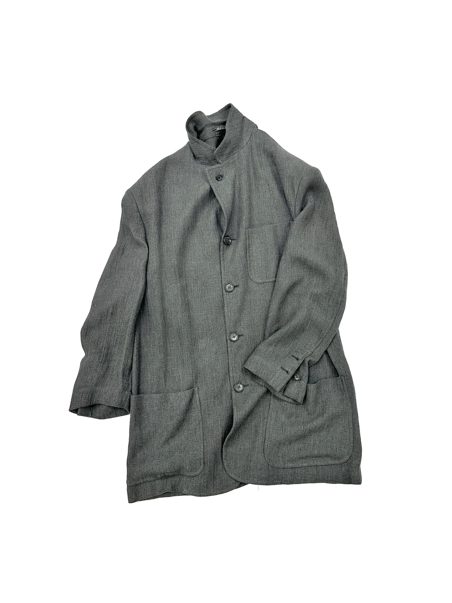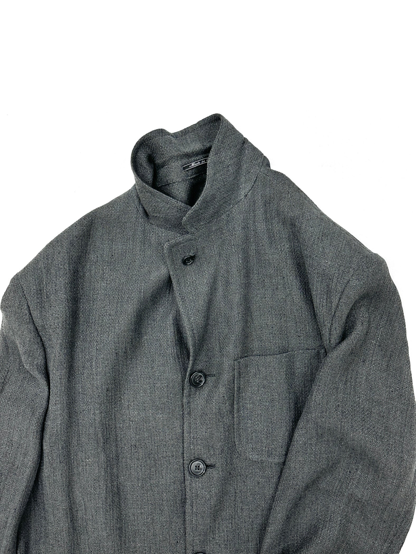 80's調子のモダンな肩パッド構築と、脱構築を突き詰めるような完全裏無しの仕立て選定。