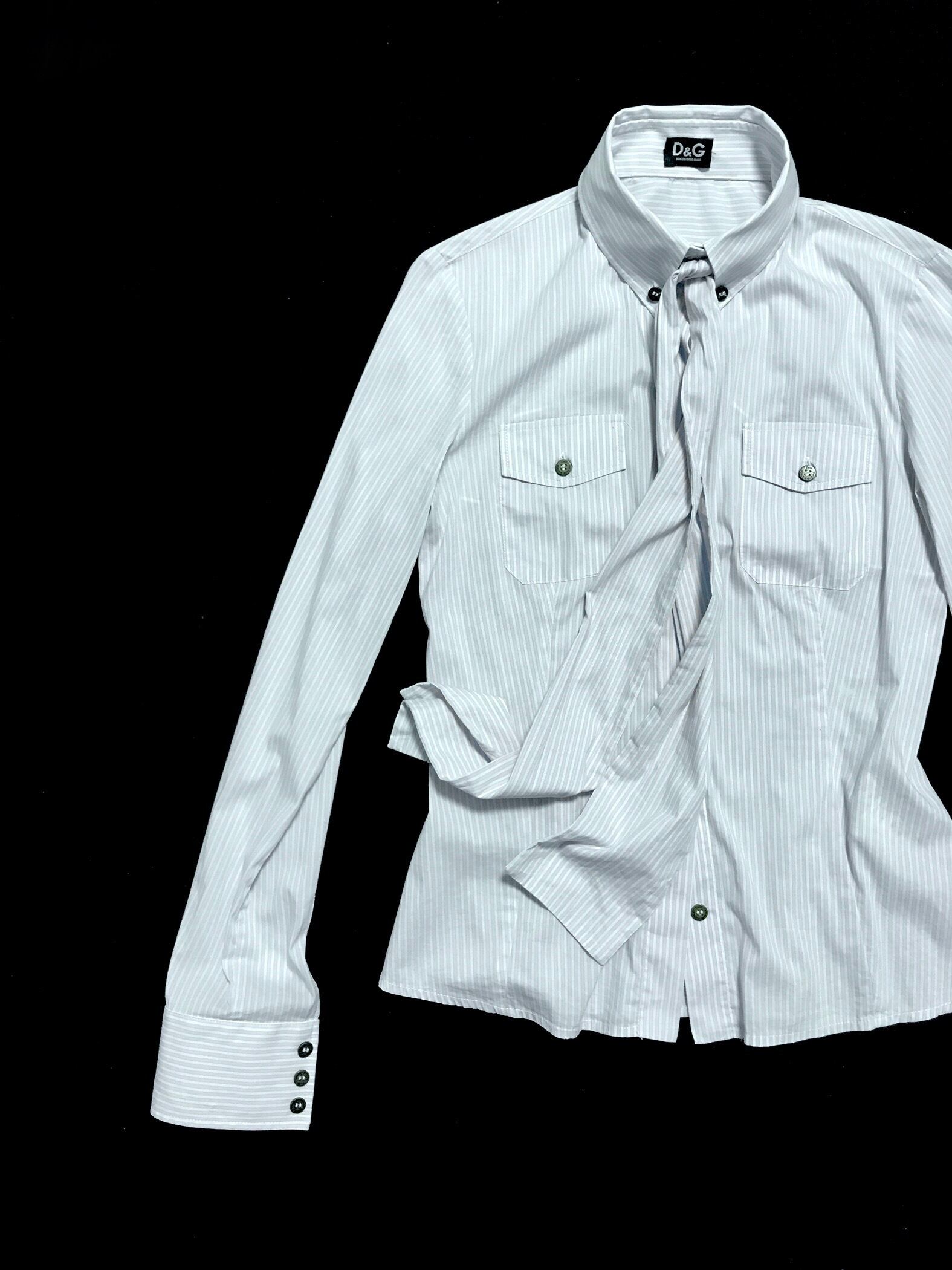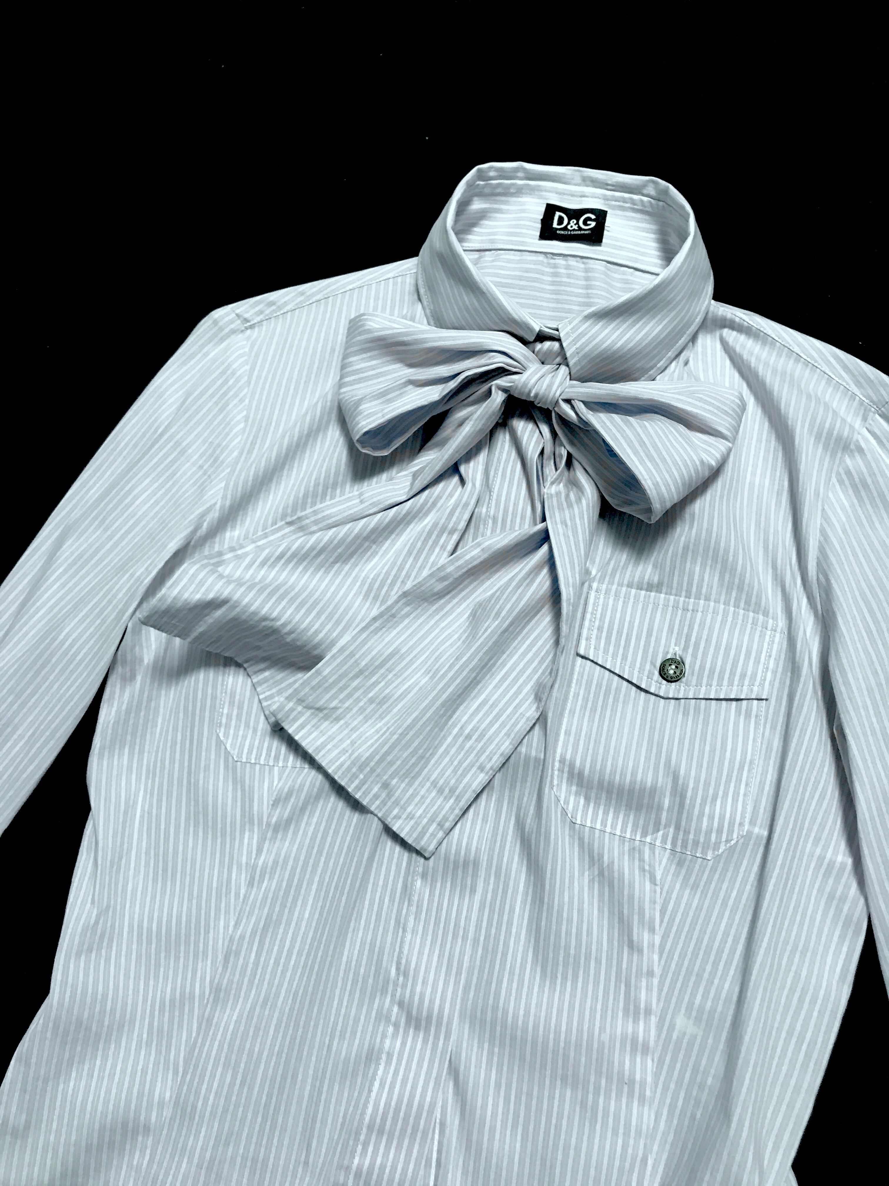 いろんな要素かき混ぜてカオスフェミニンを作りつつも、あくまでベースは真面目な、教師然としたストライプシャツです、というデザイン。