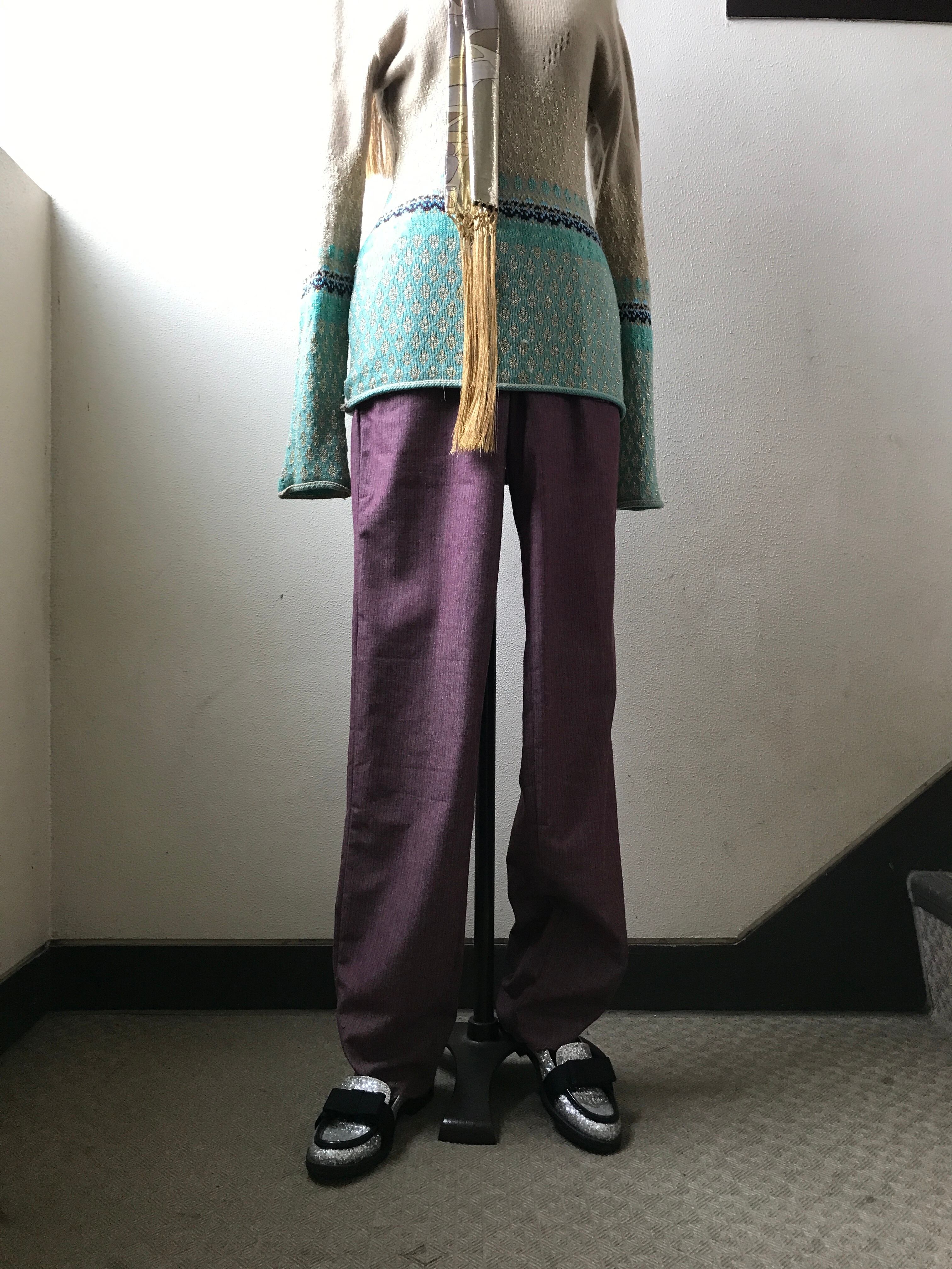 パープルのシャンブレーという極めて珍しい生地で仕立てたカジュアルパンツ。
