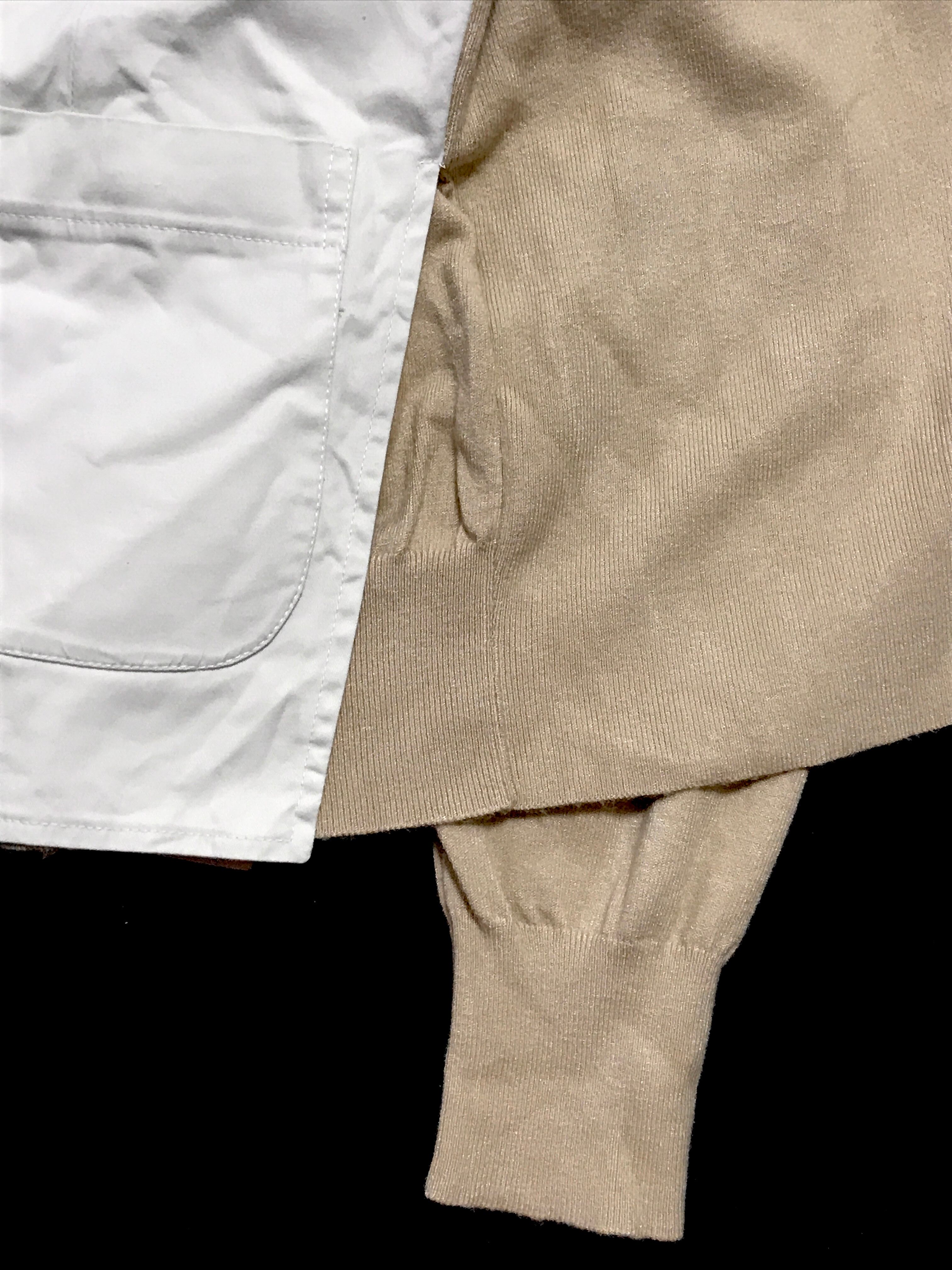 その「前身頃」のようなものはオーバーロックによる端処理こそされているものの、ボタンホールも開いていなければ中縫いも無し、本当にこれから色々手を加えてジャケットになるよ、というタイミングのもの。